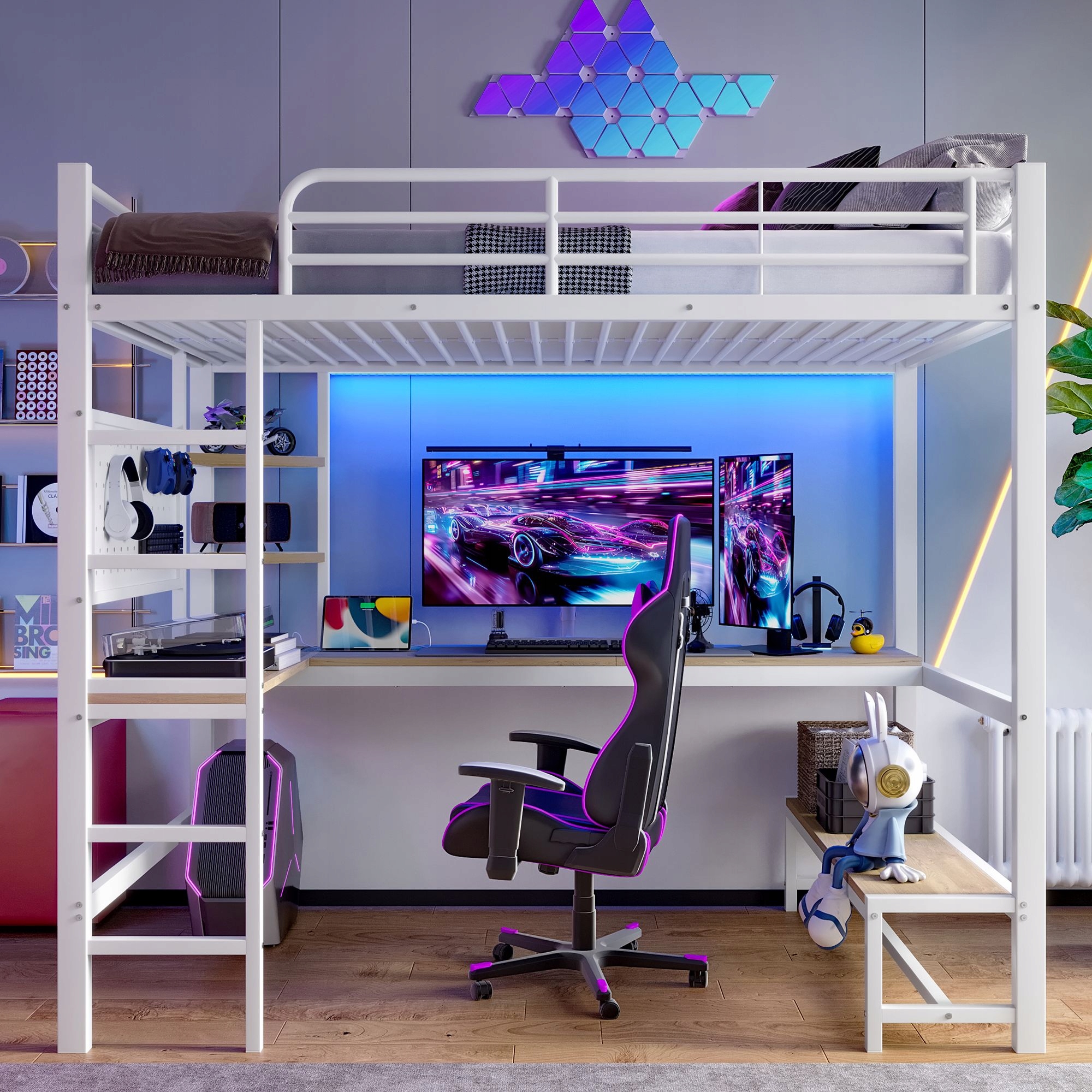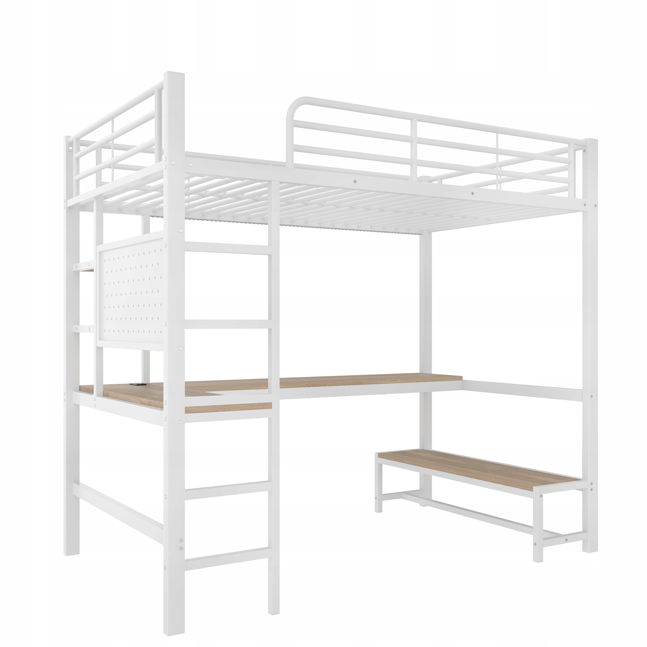 двоярусне ліжко 90 х 200 см, чавунна рама, стіл, порушення, драбина, багато полиць, з гніздо USB+типовим, зі світлодіодною стрічкою, з перфорованою стіною, без матраца, білого