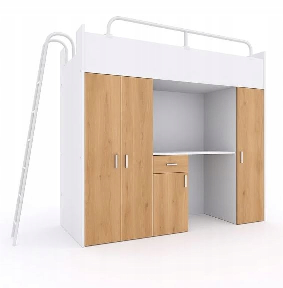 Двоярусне ліжко KIKI з письмовим столом і сходинками - ідеальне рішення для дитячої або підліткової кімнати. Він поєднує в собі функціональність, комфорт і економію простору в одному сучасному предметі меблів. У верхній частині є зручне безпечне ліжко з міцними поручнями. Під нею розташований місткий письмовий стіл з полицями та відділеннями для речей - ідеальний варіант для навчання, роботи чи творчості. Збоку є стійкі сходинки, які забезпечують зручний і безпечний доступ до верху і при цьому займають мало місця. KIKI- це продуманий дизайн, який допомагає підтримувати порядок і максимально використовувати простір в кімнаті. Модель KIKI5 дуже схожа на версію KIKI4 - однак, відмінність полягає в тому, що в представленій версії полиця має закриті фасади, а в KIKI4 полиця відкрита.