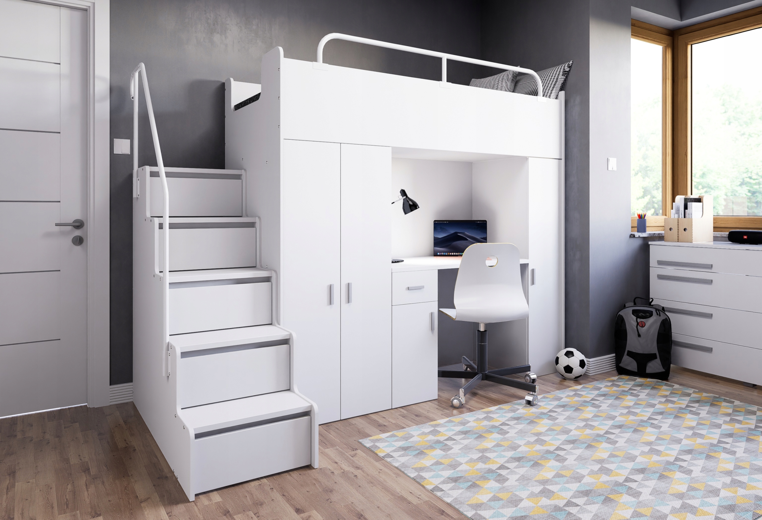 Двоярусне ліжко KIKI з письмовим столом і сходинками - ідеальне рішення для дитячої або підліткової кімнати. Він поєднує в собі функціональність, комфорт і економію простору в одному сучасному предметі меблів. Нагорі є зручне, безпечне ліжко з міцними поручнями. Під нею розташований місткий письмовий стіл з полицями та відділеннями - ідеально підходить для навчання, роботи чи творчості. Збоку є стійкі сходи, які забезпечують зручний і безпечний доступ до верху, і при цьому займають мало місця. KIKI – це продумана конструкція, яка допомагає підтримувати порядок і максимально використовувати простір у кімнаті.