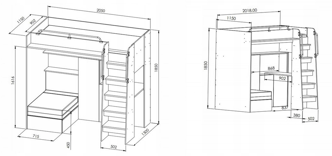 Спальна площа верхнього ліжка: 90x200 (при низьких перилах рекомендуємо матрац товщиною до 10 см)
