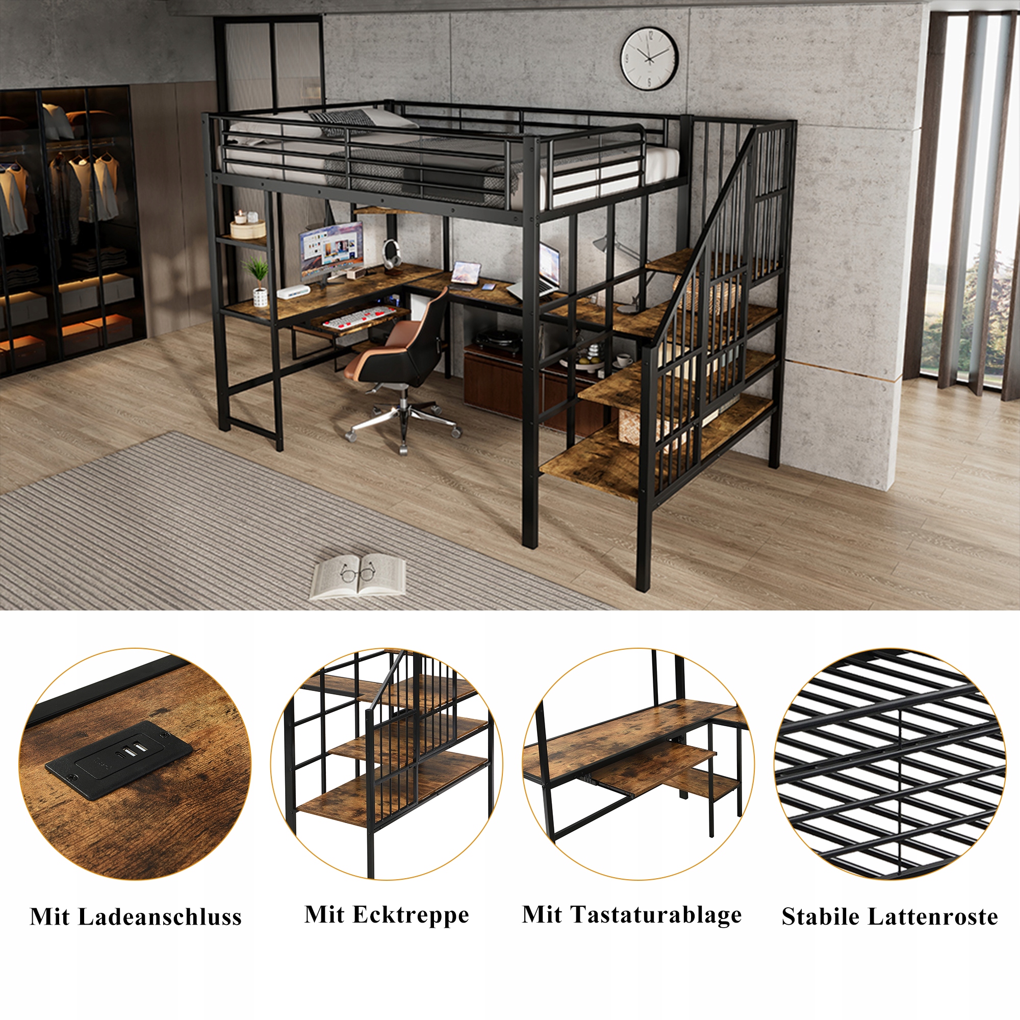 - Це універсальне залізне ліжко поєднує в собі функціональність, безпеку та сучасний комфорт – ідеальне доповнення до різноманітних кімнат, а також для дітей та підлітків! Він оснащений зручною та безпечною кутовою сходинкою, що забезпечує легкий та безпечний доступ. Інтегрований зарядний порт забезпечує практичну щоденну зручність, ідеально підходить для заряджання ваших пристроїв без клопоту з кабелями. Завдяки твердим решітним каркасам він гарантує безпечний і комфортний сон, а два захисти від перекидання ефективно стабілізують ліжко - міцну основу для будь-якого використання. Особливо практично: письмовий стіл із полицею для клавіатури та місцем для зберігання речей створює ідеальну зону для роботи чи навчання, яка ідеально вписується в загальну конструкцію ліжка. Незалежно від того, чи знаходиться він у спальні, гуртожитку чи на робочому місці, він ідеально вписується в різні простори та гнучко адаптується до потреб різних користувачів.