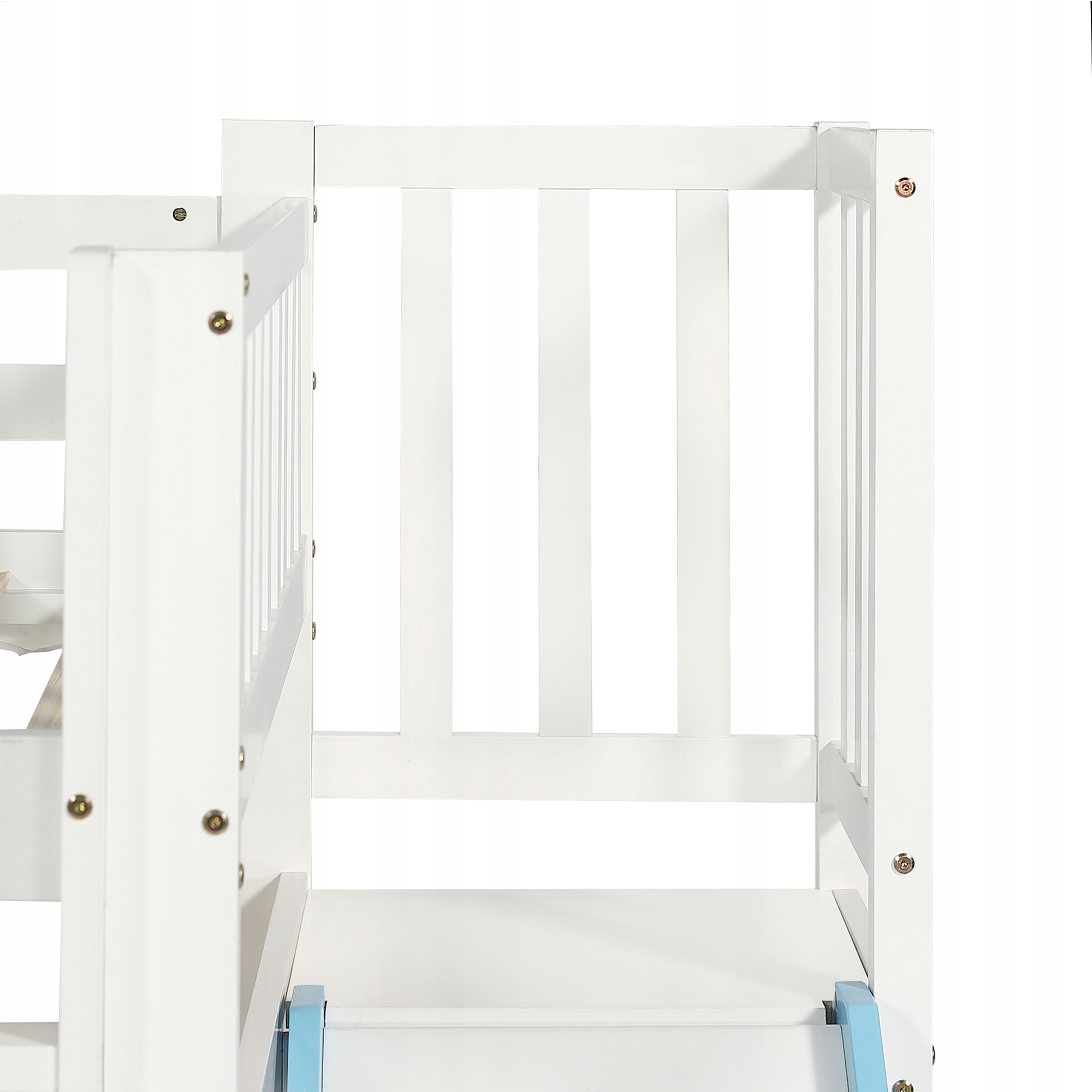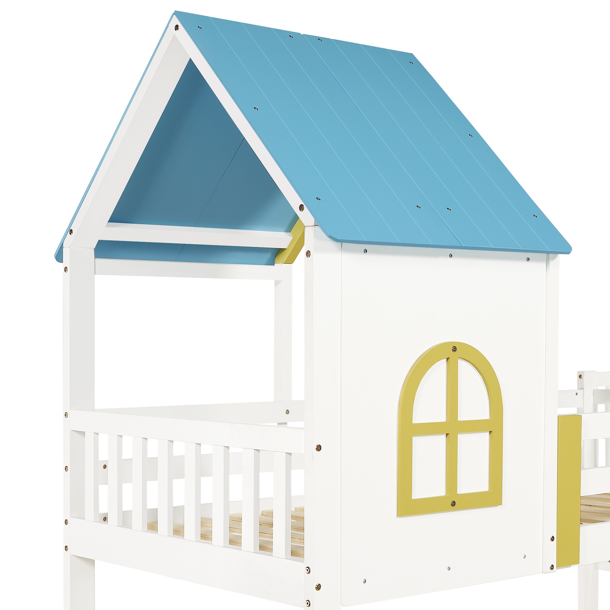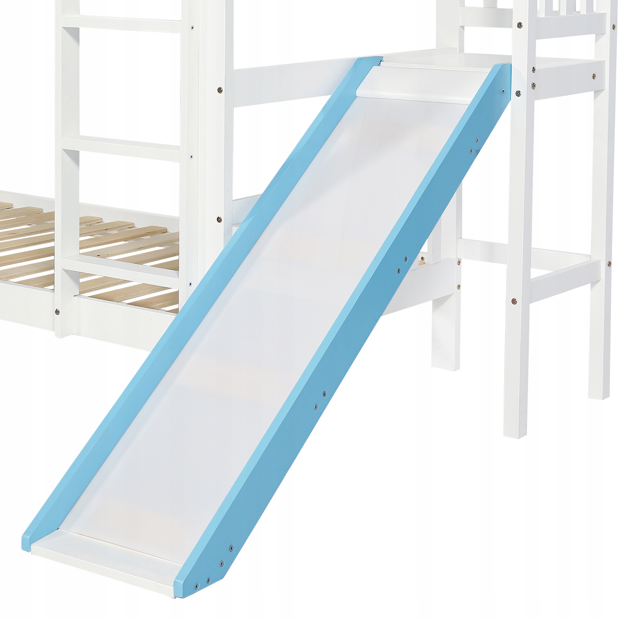 двоярусне ліжко, домашнє ліжко, дитяче ліжко, дитяче ліжко з дахом та вікном, із захистом від падіння та паличок, з триступеневою драбиною, з слайдом, сосна+mdf, білий і синій, 90x200 см