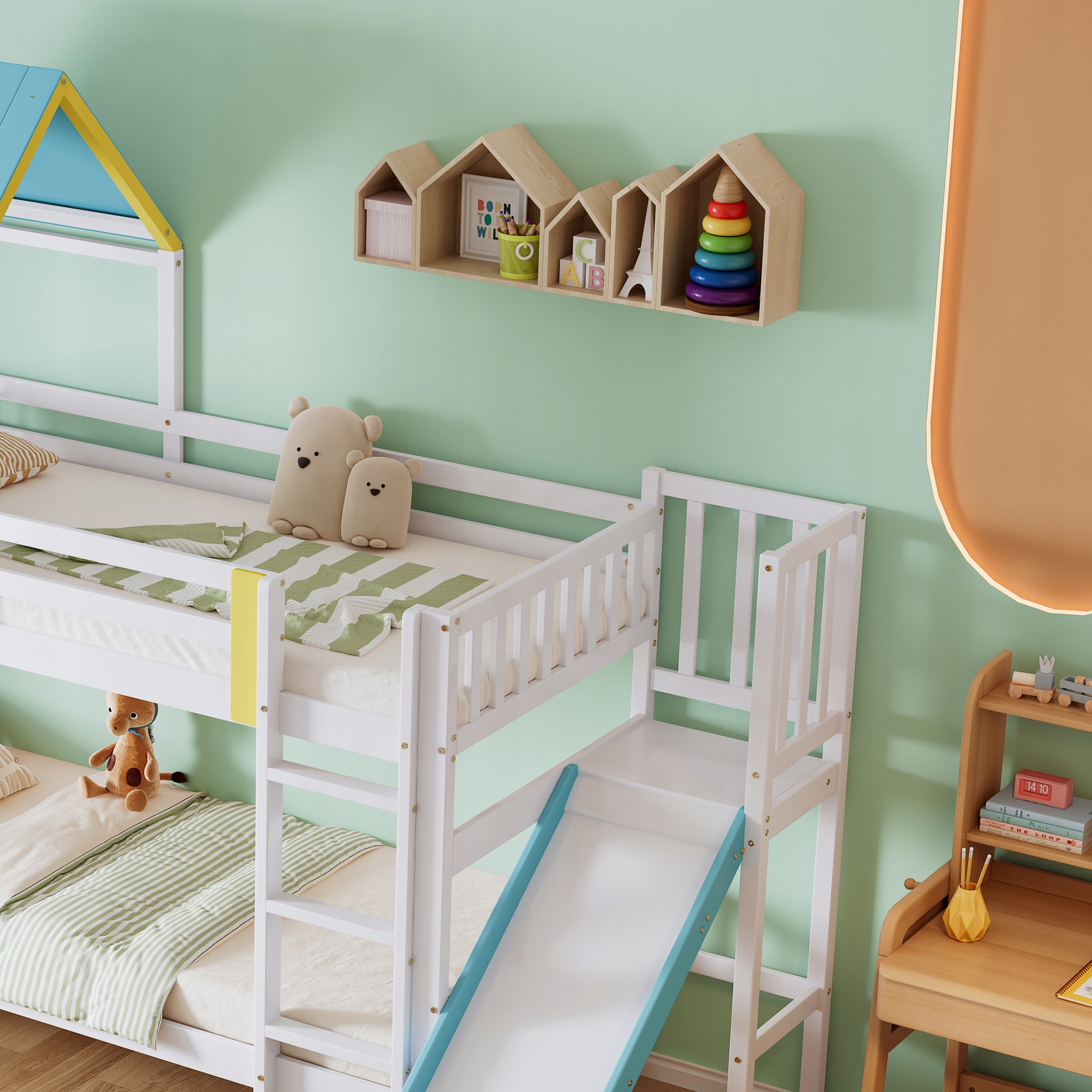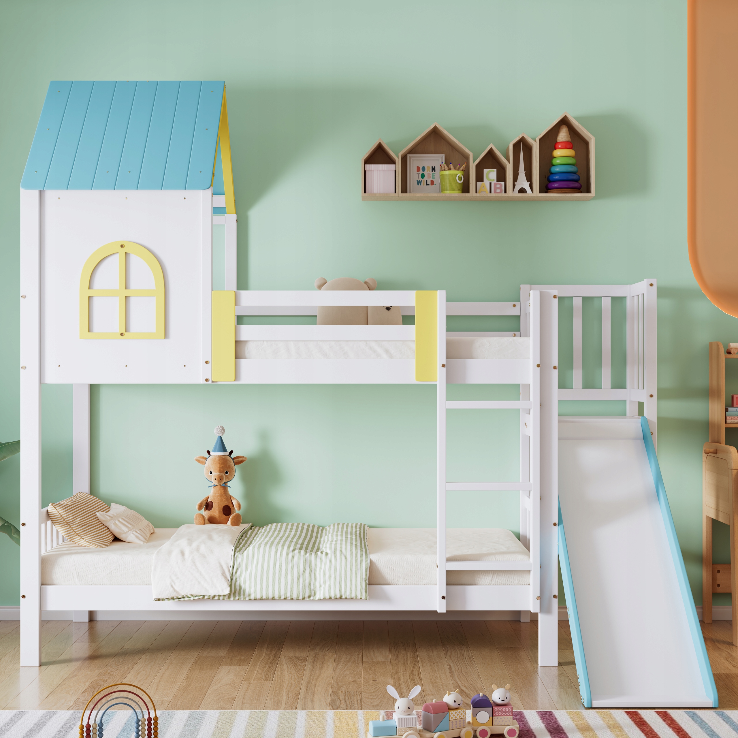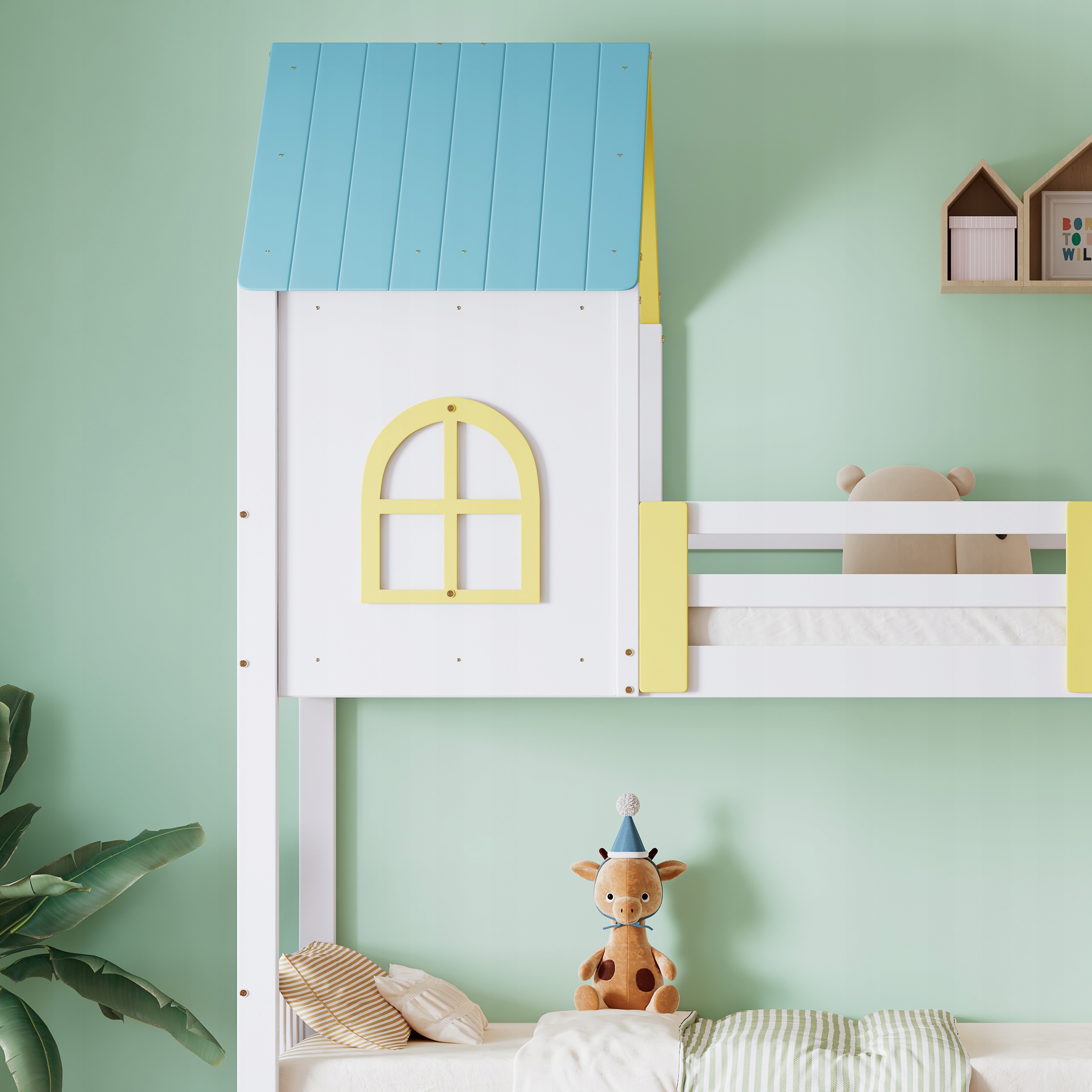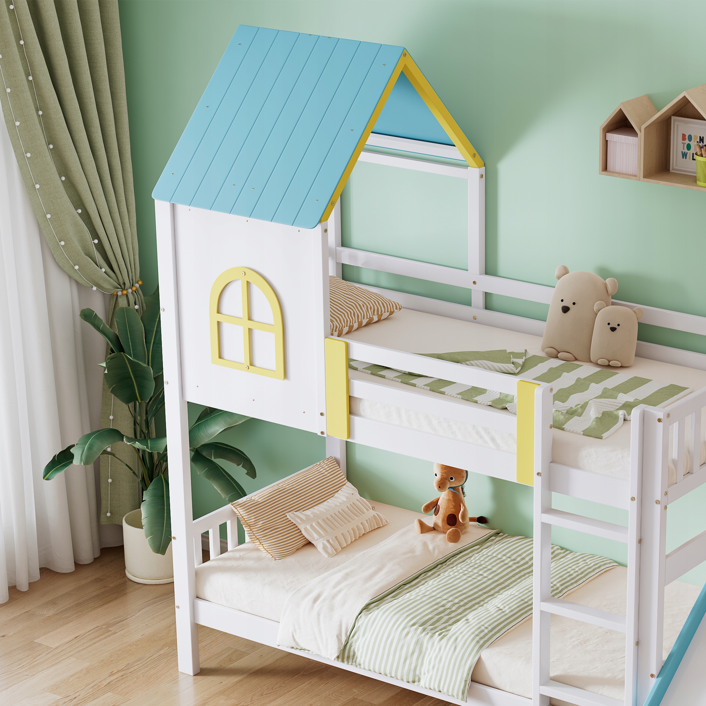 двоярусне ліжко, домашнє ліжко, дитяче ліжко, дитяче ліжко з дахом та вікном, із захистом від падіння та паличок, з триступеневою драбиною, з слайдом, сосна+mdf, білий і синій, 90x200 см