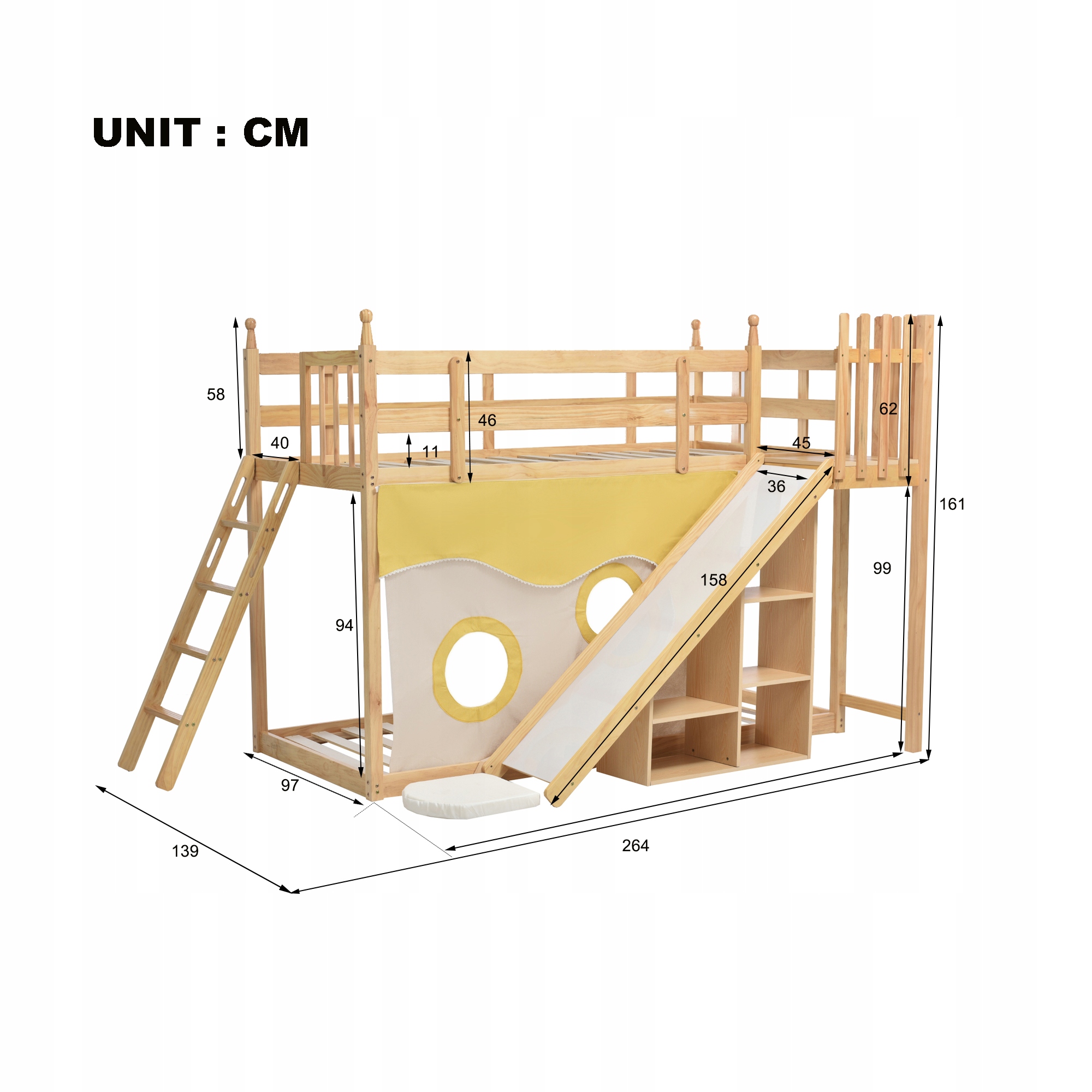 Повзанка в передній частині ліжка та полиці під ним ефективно економить місце в порівнянні зі звичайними ліжками-розсувами. Штора має два круглих отвори спереду. Штора весела і затінює ліжко. За потреби його також можна зняти.