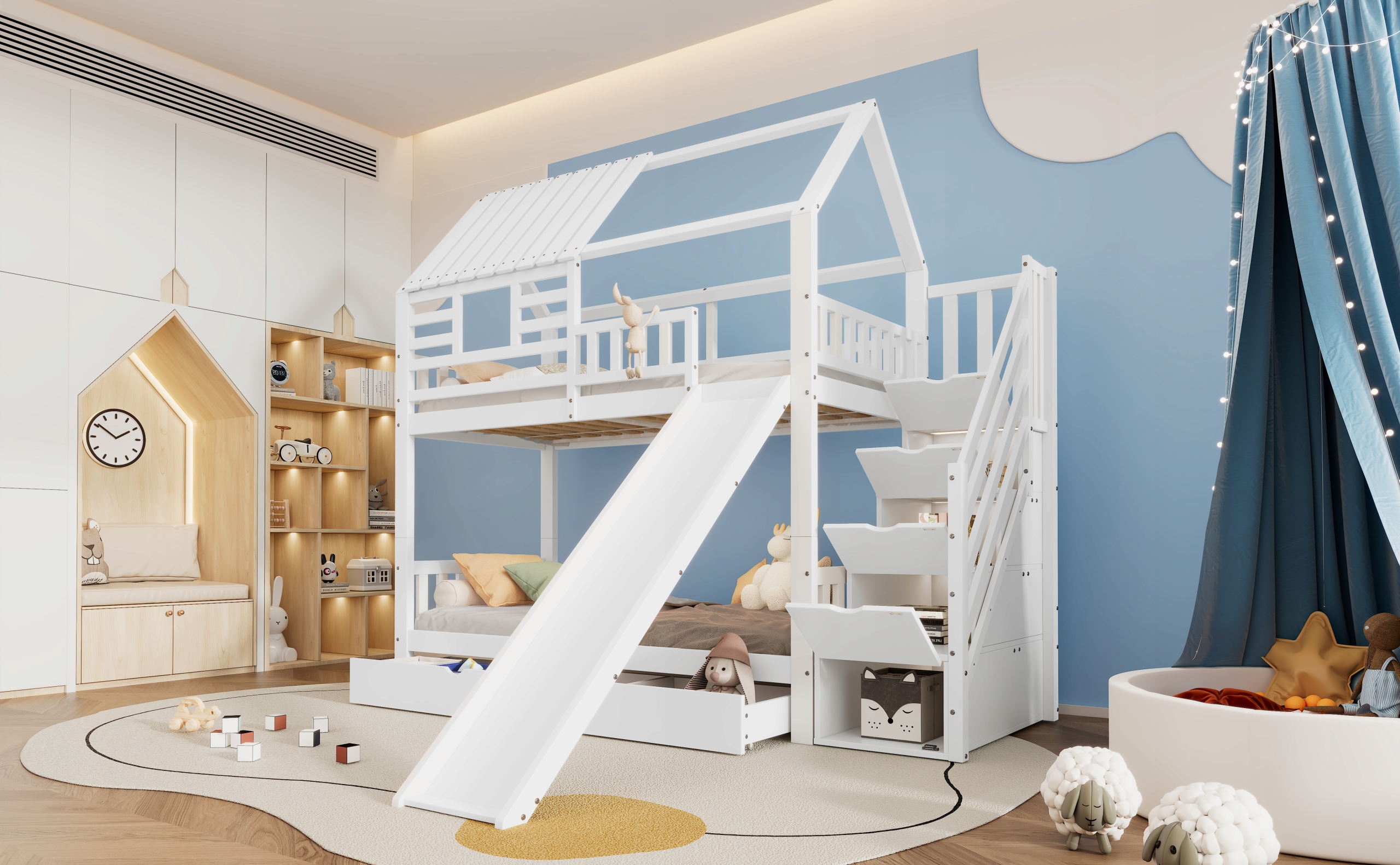 двоярусне ліжко зі сходами та ковзанням, домашнє ліжко, сходи з місця для зберігання, рамка соснової деревини та МДФ, дитяче ліжко з вікном та дах, із захисними воротами та ящиком, білим, 90x200см*2