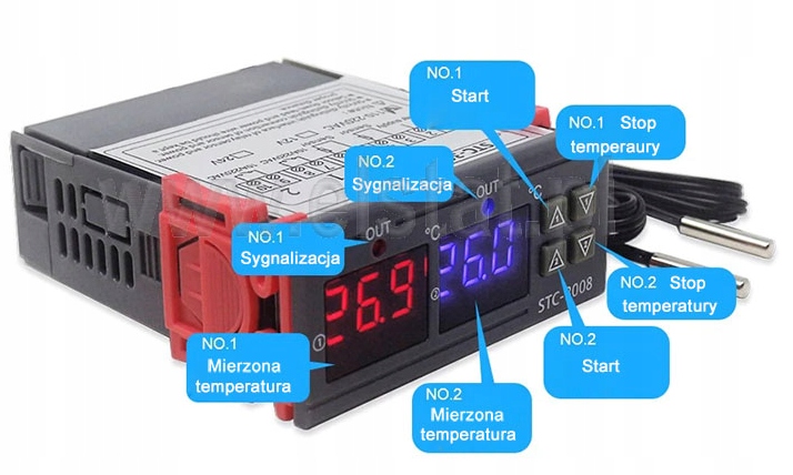 Пристрій для керування нагріванням або охолодженням зовнішніх пристроїв. Може використовуватися в холодильниках, тепличних печах, інкубаторах, резервуарах для води.