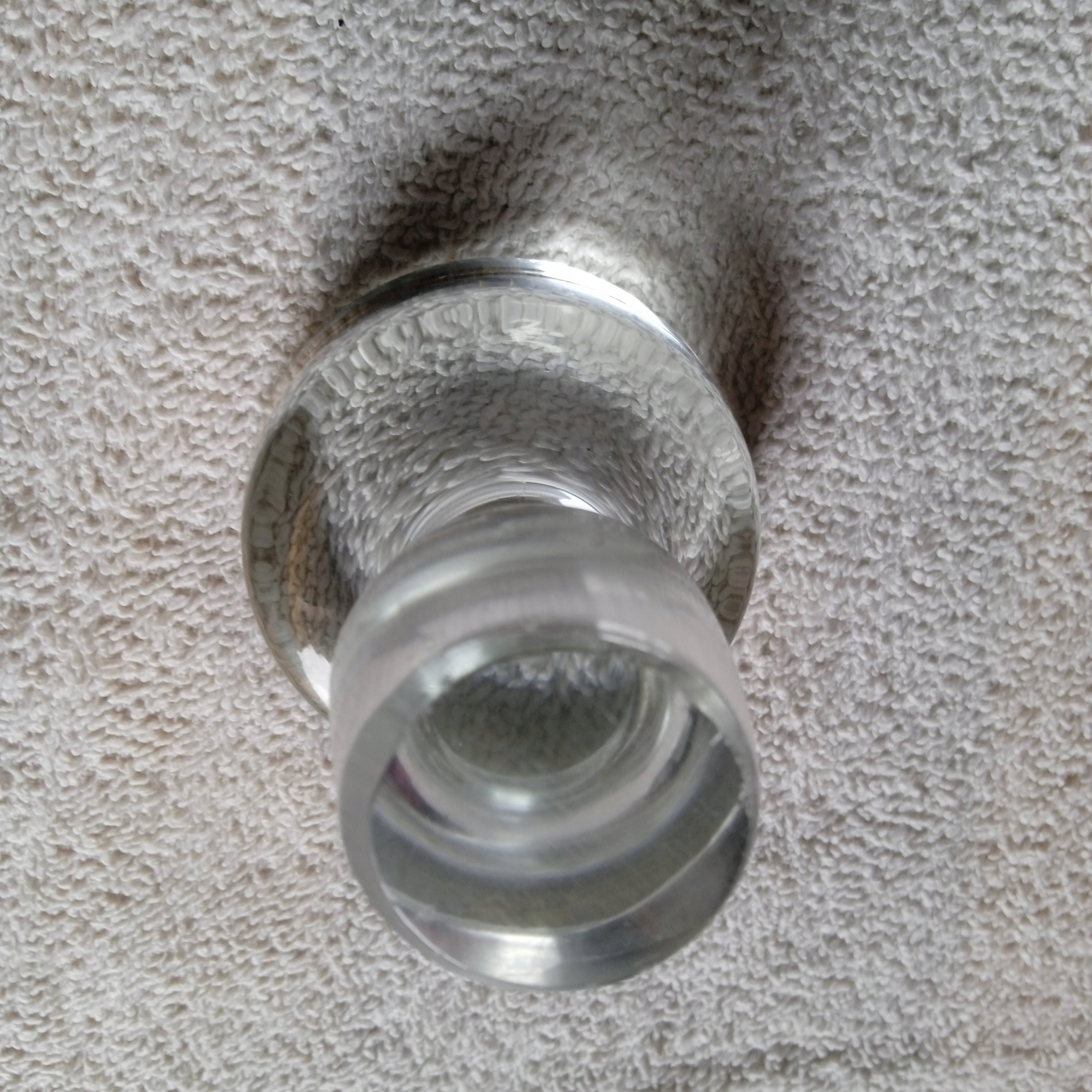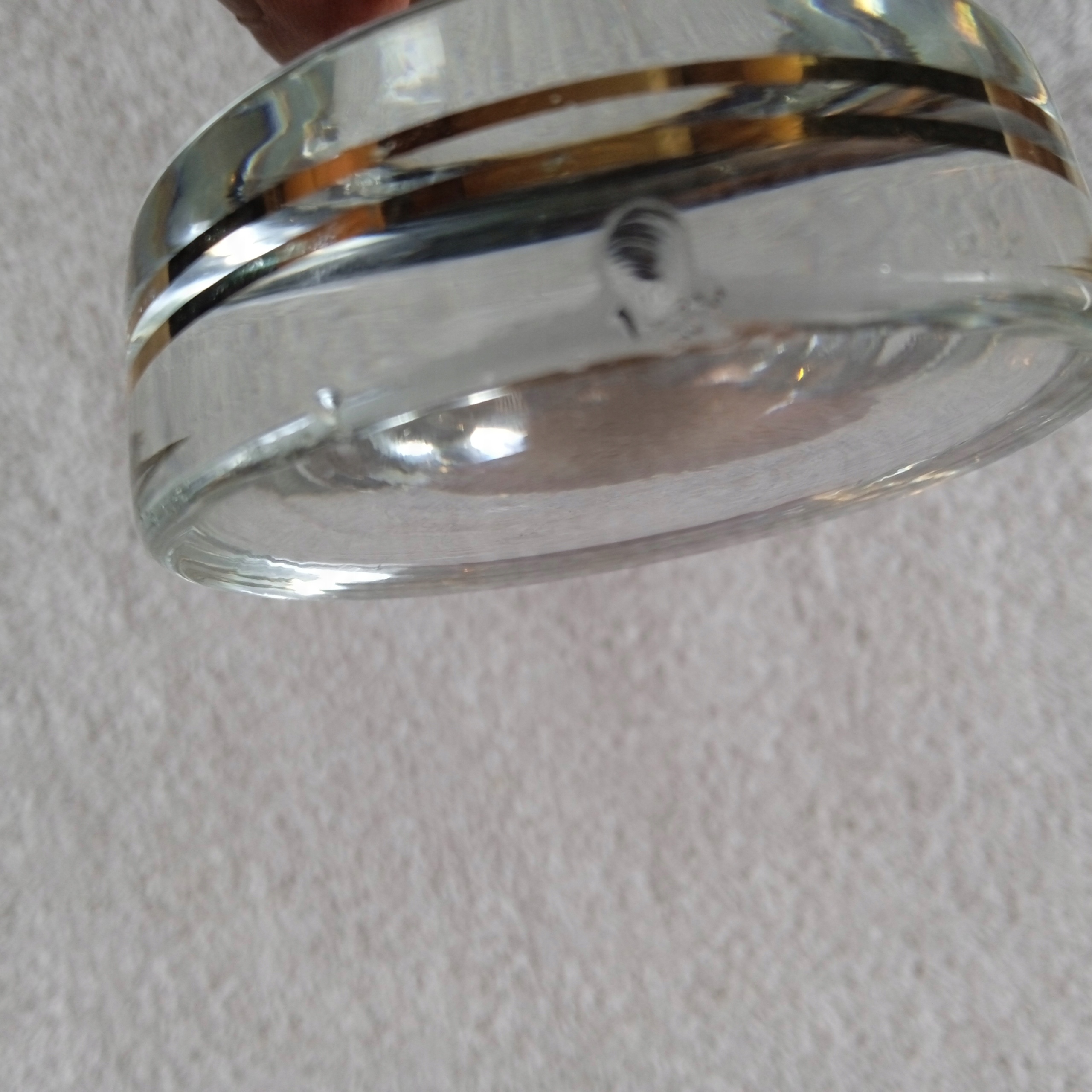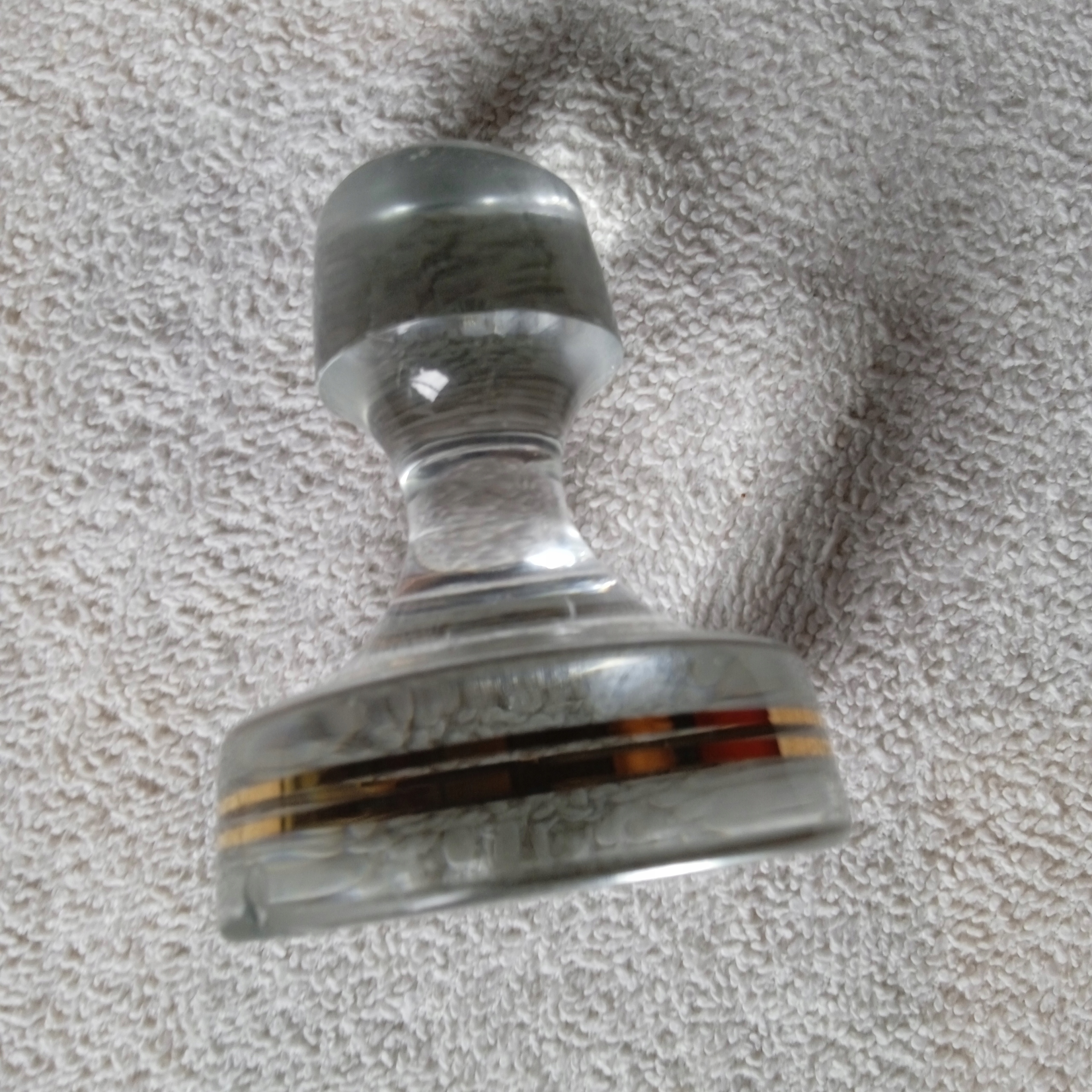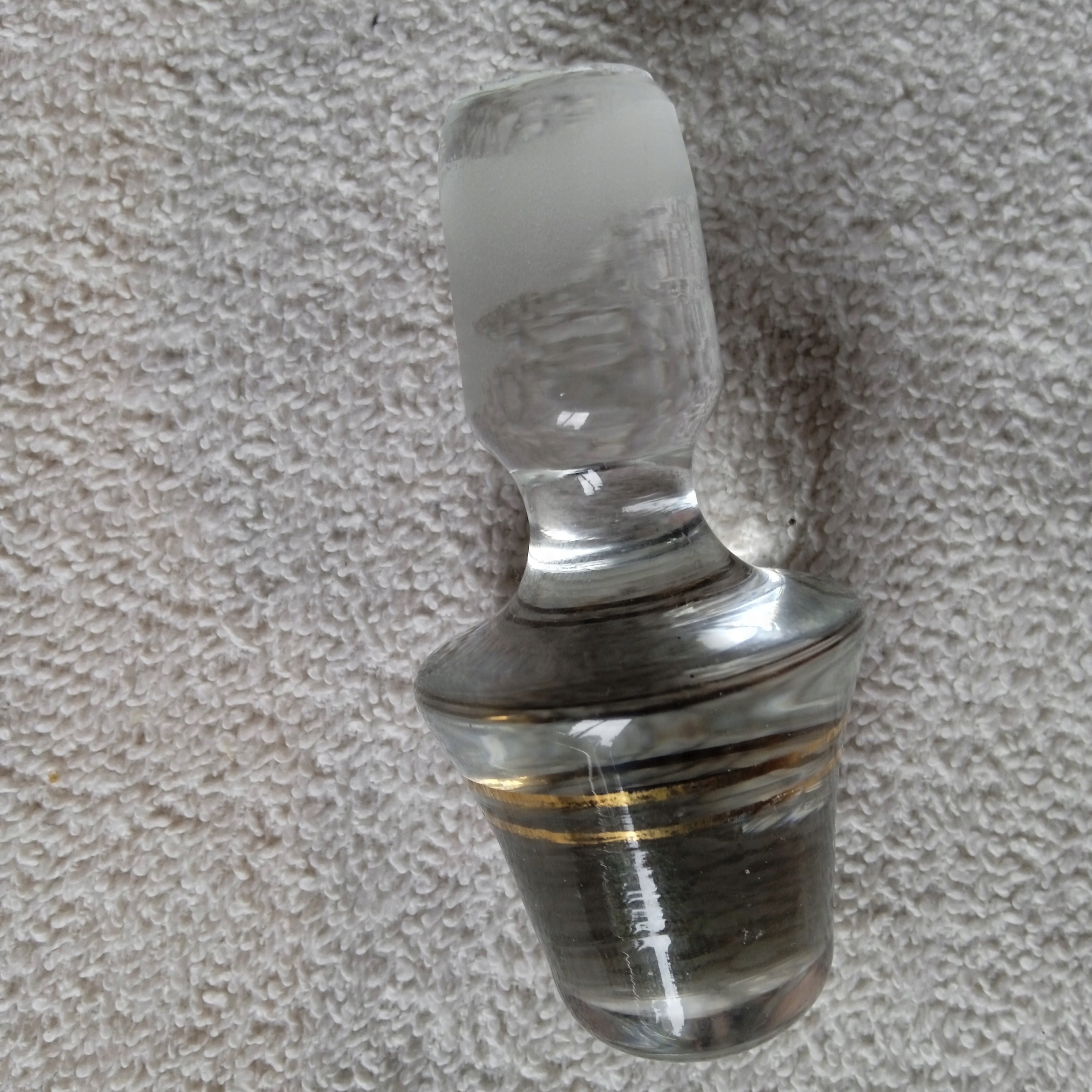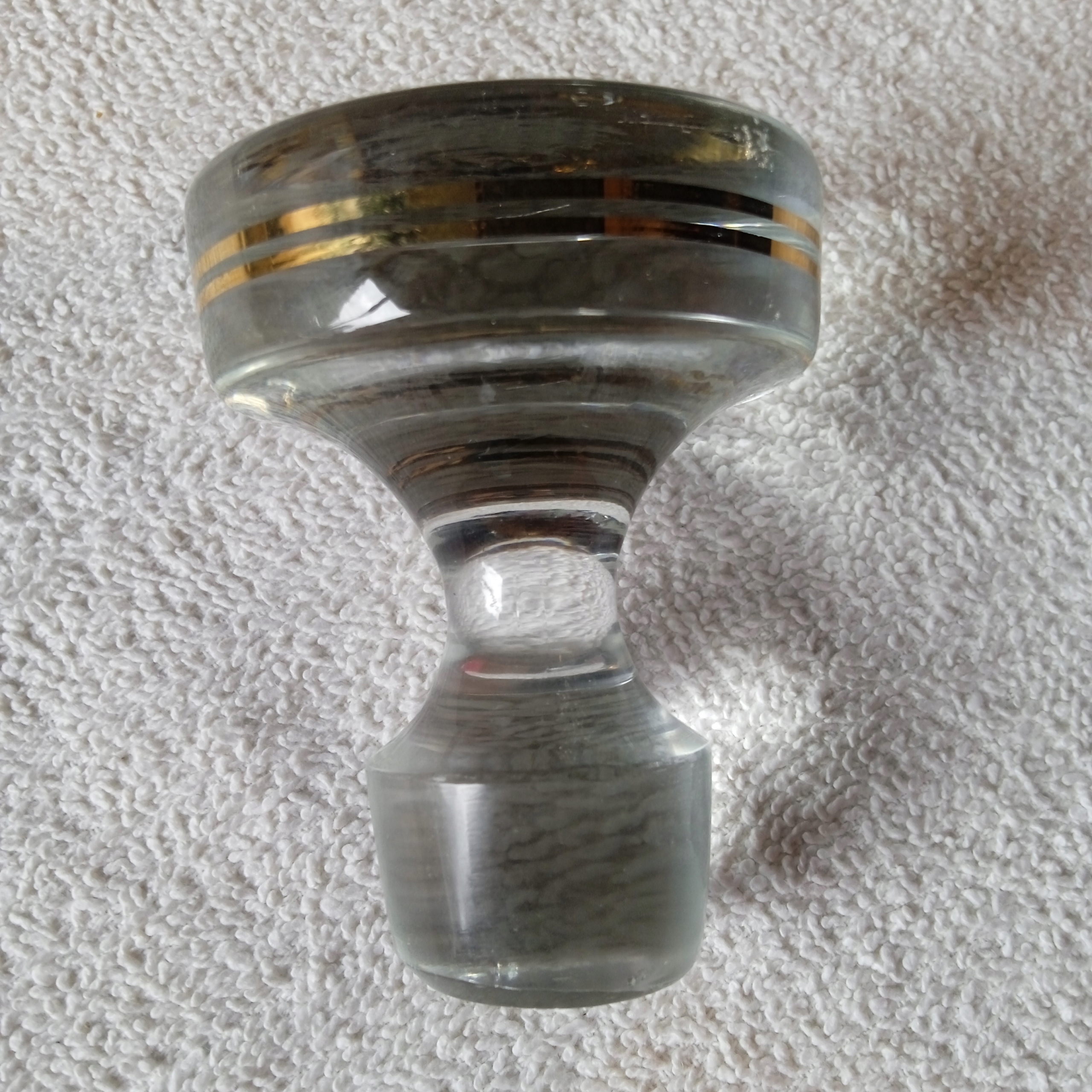 Продам дві антикварні пробки для графин, ймовірно середини 20 століття, пробки з прозорого скла, ймовірно кришталю, прикрашені золотими смугами. Висота більшої пробки 7,5 см. Діаметр зверху 6 см. Висота верхньої частини 2,1 см. Діаметр пробки вгорі 3,3 см. , внизу 2,9 см. По верхньому краю є невелике потертість і два плоских невеликих дефекту. Висота меншої пробки 8,5 см. Діаметр 4 см. Діаметр заглушки вгорі 2 см. , внизу 1,7см. В доброму стані. Ціна вказана за 2 шт.