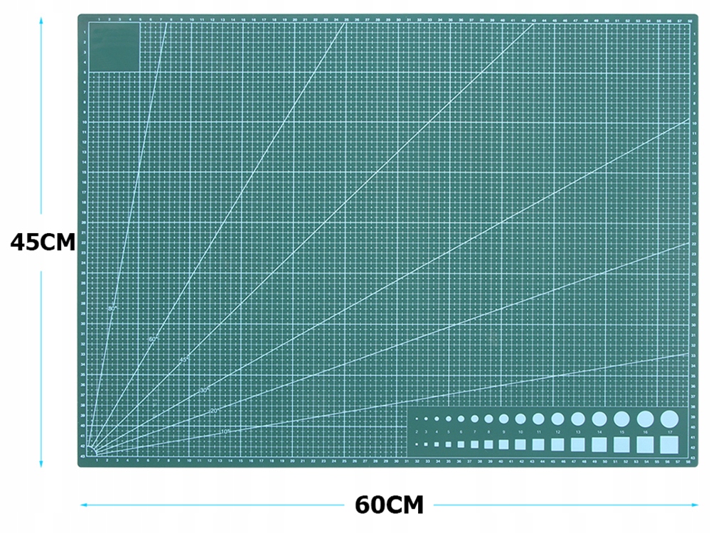 Килимок для різання, що самовідновлюється, виготовлений зі спеціального матеріалу, який частково загоюється під час розрізання лезом. Після розрізання він залишається гладким. З обох боків він має шар, на якому сантиметрова шкала надрукована вертикально та горизонтально, з кутами, транспортирами, паралельними лініями та фігурами позначено.