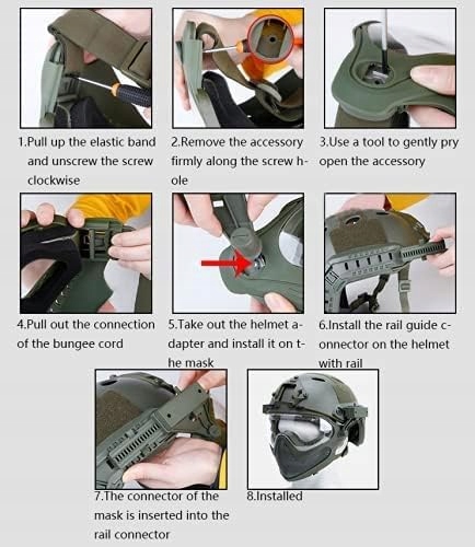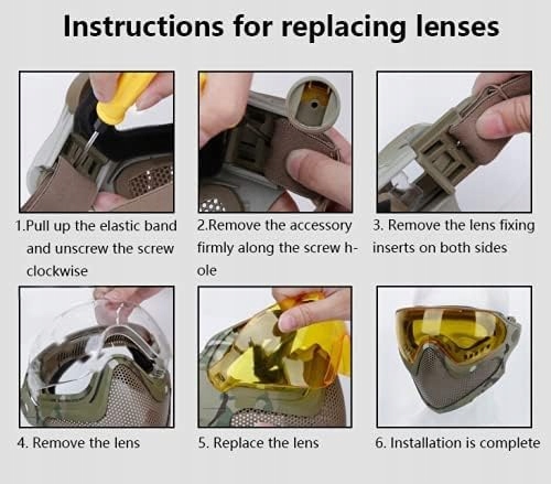 Матеріали Маска виготовлена зі сталевої сітки ТПУ та нейлонових окулярів. Лінза ПК із губкою всередині окулярів забезпечує комфортне носіння. Підходить для окружності голови приблизно 5264 см. Еластична пов’язка на голові може бути відрегульована відповідно до вашого обличчя 2 режими 1. Режим головного убору з еластичною пов’язкою 2 .Режим носіння шолома підходить для різних шоломів FAST. з 2 адаптерами для шолома для кріплення бічних рейок шолома Поставляється з 3 лінзами, сірі прозорі та жовті лінзи можна замінити відповідно до різних середовищ чудова вентиляція Чудова дихаюча сталева сітчаста конструкція та повний захист обличчя забезпечують виняткову ефективність у страйкбольних іграх Пакет включає 1 шт. маска 2 шт., змінні лінзи 3 шт