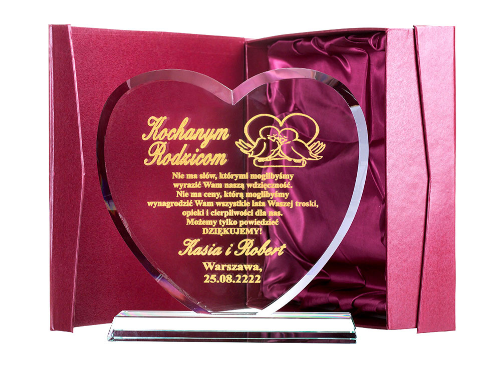 Чудова подячна записка виготовлена за допомогою технології лазерного гравіювання безпосередньо на предметі. Скляна статуетка виглядає чудово завдяки інноваційній формі, а завдяки вирізам створює незабутнє естетичне враження. Встановлений на міцну основу з такого ж матеріалу, які міцно з'єднані між собою, він неодмінно запам'ятається одержувачу. Ви більше ніде не знайдете такої високої якості. Крім того, гравіювання наноситься майстром вручну і дуже акуратно спеціальною фарбою. Позолота/срібло переливається на світлі та дає дивовижний ефект. До всього доповнює красивий бордовий чохол з бордовим атласом, в якому статуетка виглядає ще красивіше, а позолота виділяється на тлі чохла. Можу зробити для вас - ПОДАРУНОК НА БУДЬ-ЯКИЙ НАВОД (весілля, гостини, хрещення, причастя, день народження, вісімнадцяти іменини, ювілей, річниця весілля, день матері та батька, день дідуся та бабусі, день Святого Валентина, день вчителя, тощо). b>