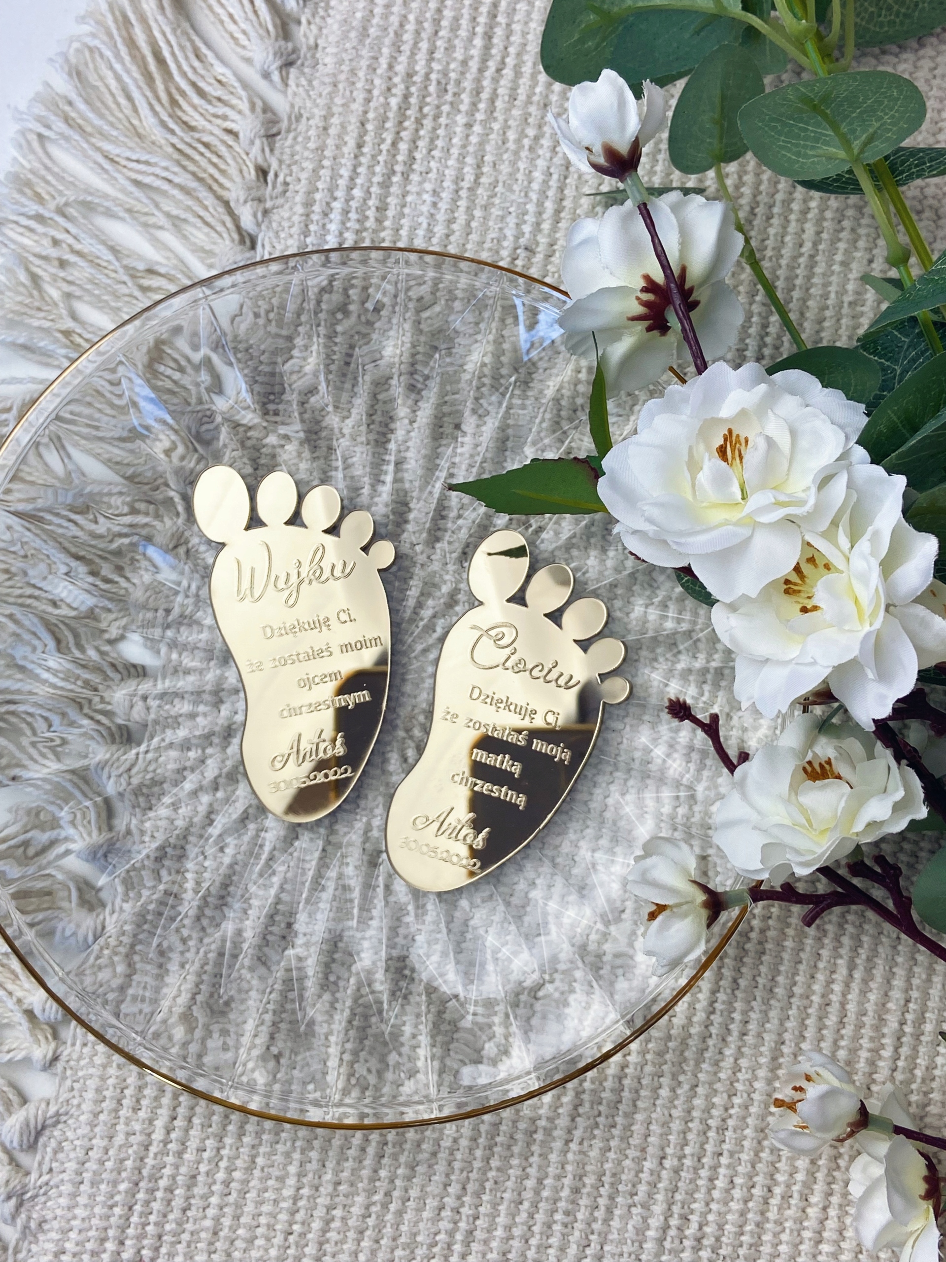 Унікальний сувенір для Кумів, який, безсумнівно, залишиться з ними на довгі роки ! Набір із двох гравірованих магнітів обраної форми, виготовлених на золотому дзеркалі. Кожна ніжка упакована окремо у фольгу з кремовою стрічкою.