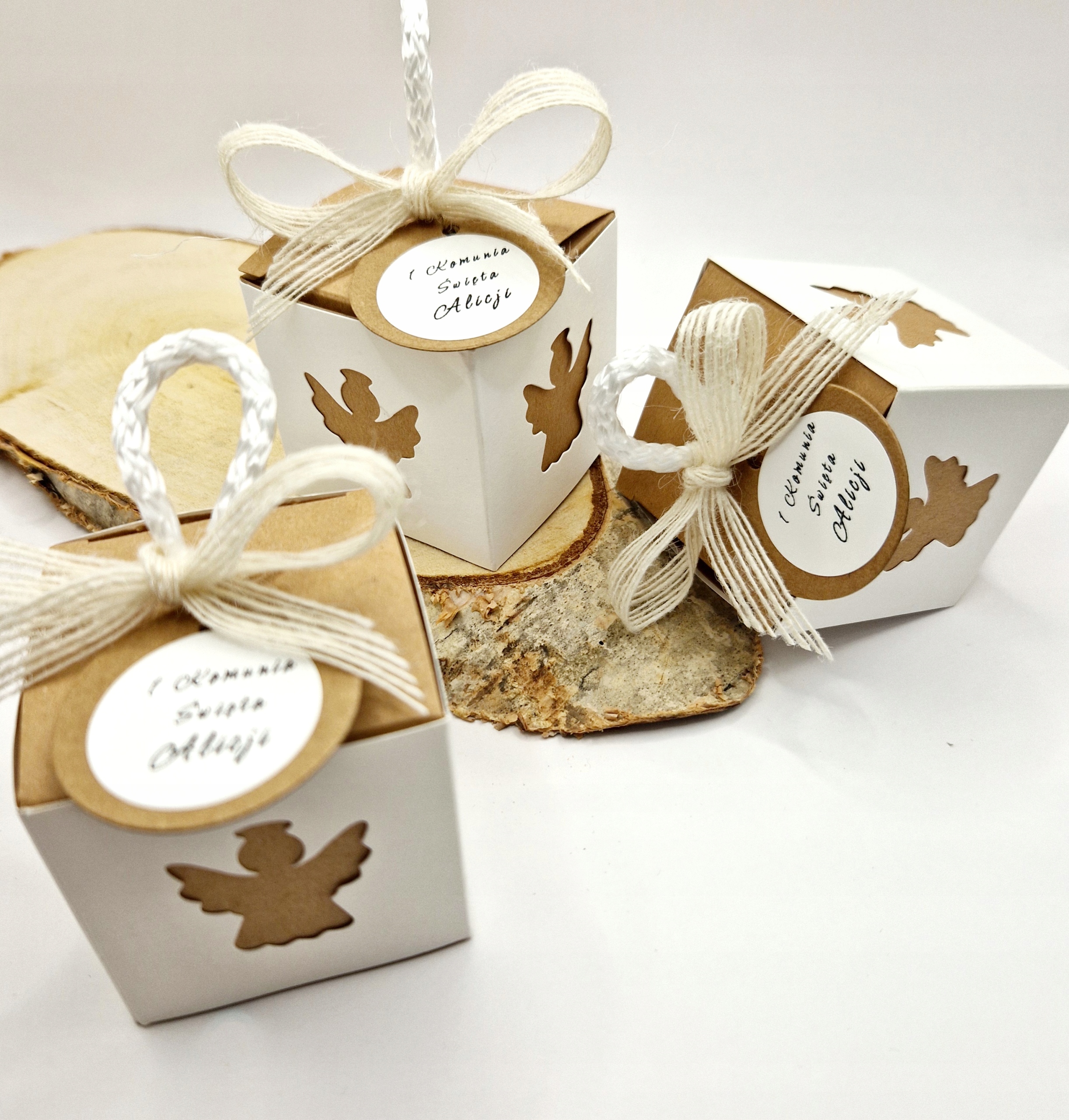 Солодощі упаковані в білий органза, розміщений у картонній коробці, ціле зав'язується кремовим луком з персоналізованим кулонами. Трампс, напр. Святе хрещення Аліки/Перше Причастя фестивалю Малгосії
