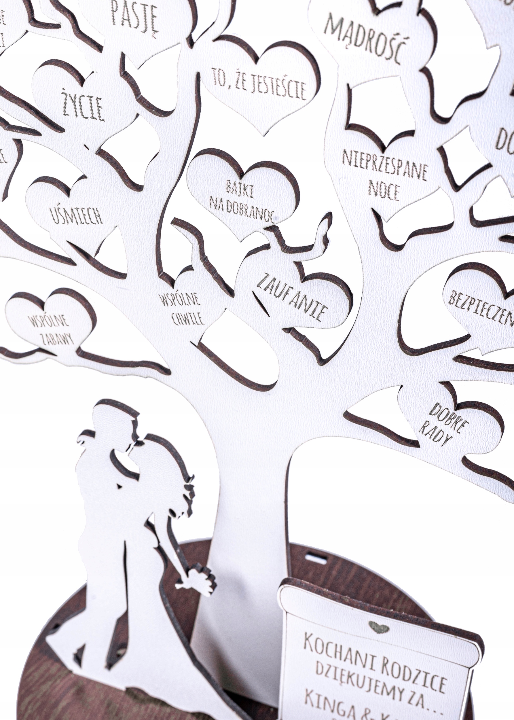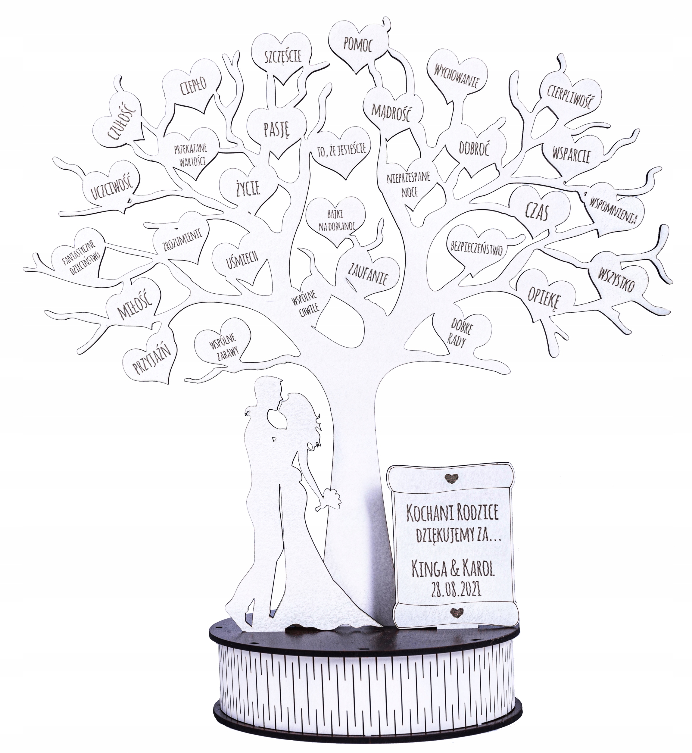 На основі є персональна вигравірувана табличка з вигравіруваною присвятою (наприклад, «Шановні батьки, дякую за...»), іменами нареченого та нареченої (наприклад, Кінга та Кароль) і датою весілля (наприклад, 28 серпня 2021 р.). ).
