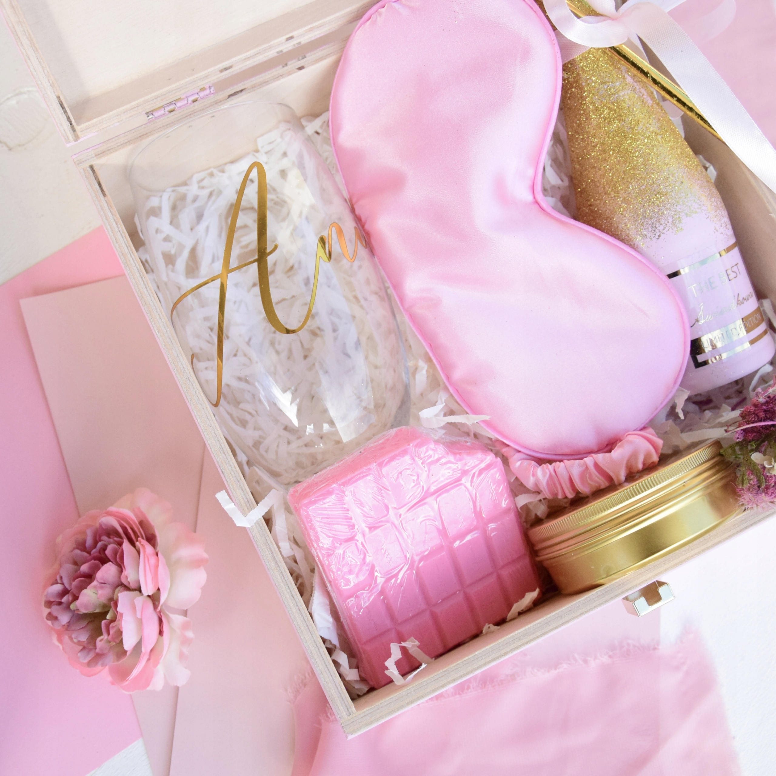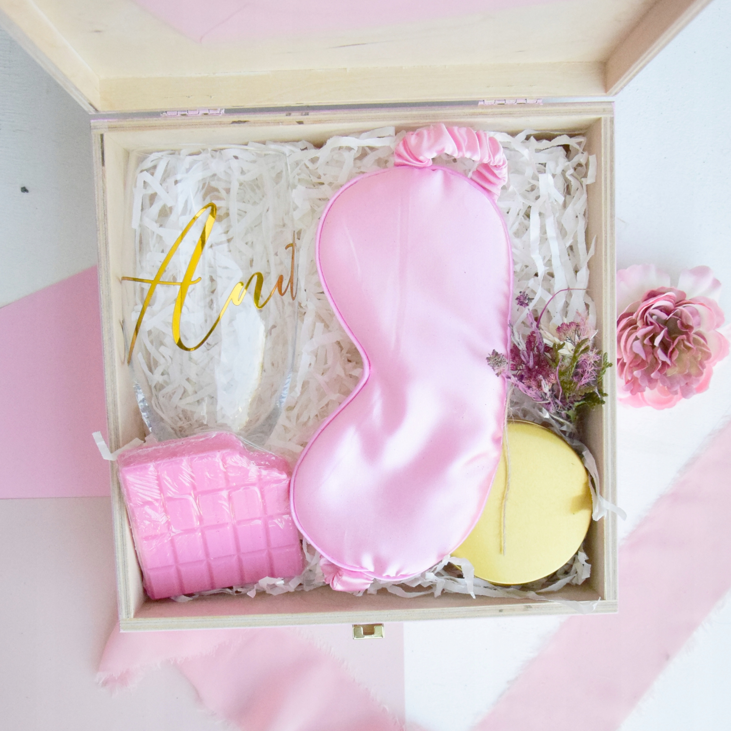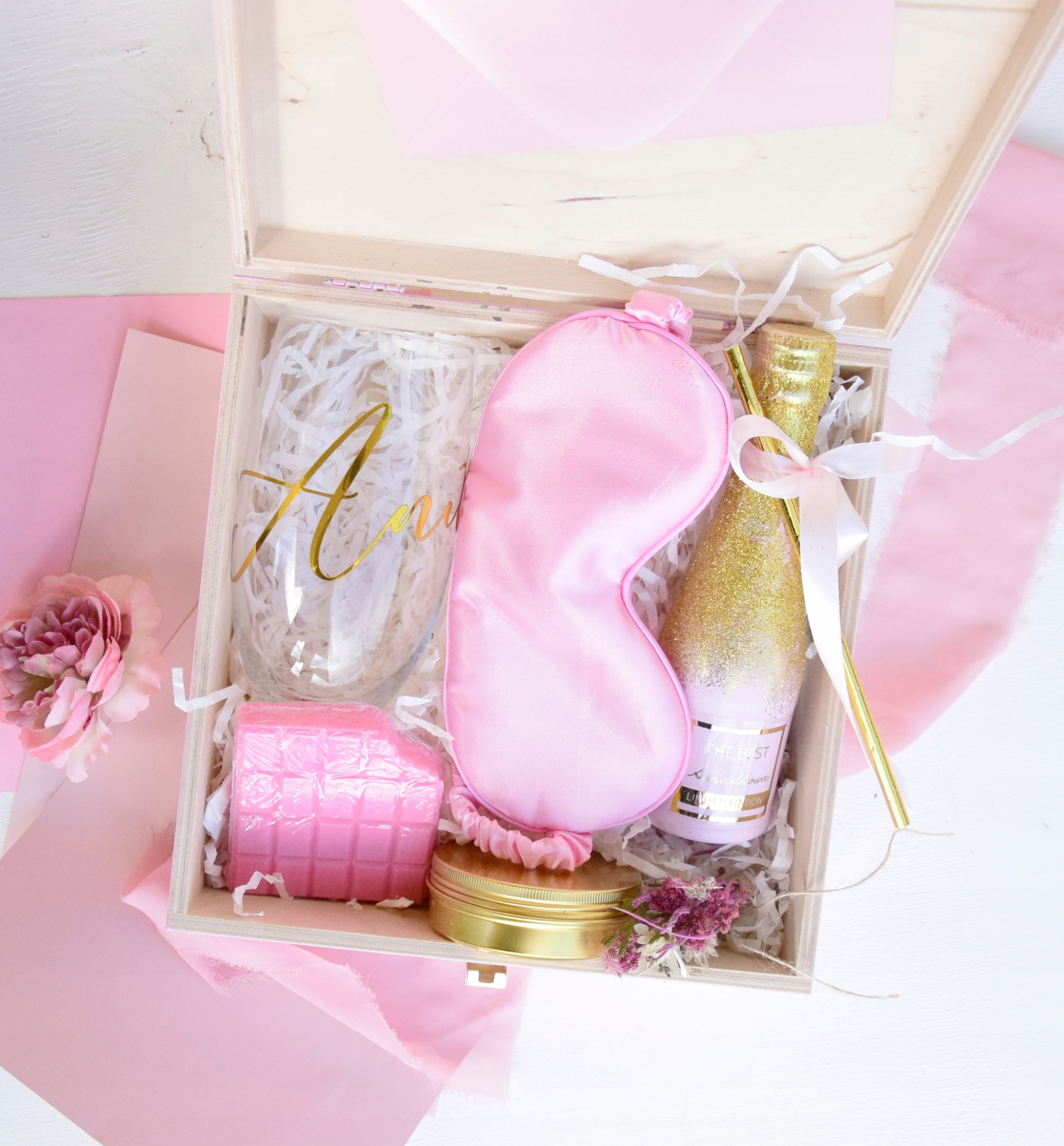 - коробки дерев'яні розміром 25 см х 25 см, колір коробки: рожевий, колір гравіювання: натуральний
