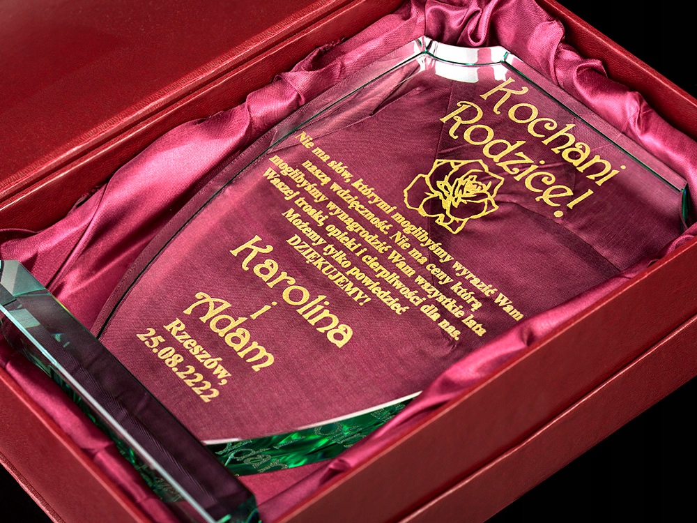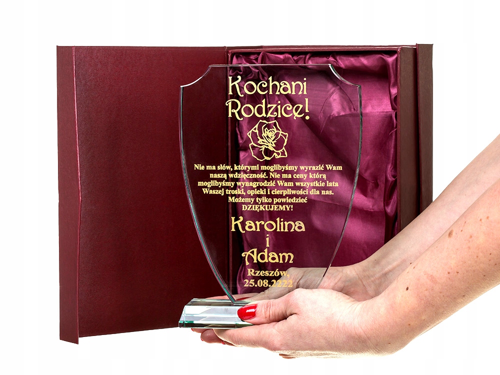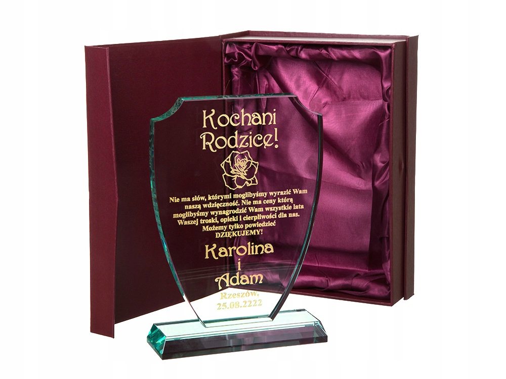 Красива подячна записка виготовлена за допомогою технології лазерного гравіювання безпосередньо на предметі. Скляна статуетка виглядає чудово завдяки інноваційній формі, а завдяки вирізам створює незабутнє естетичне враження. Встановлений на міцну основу з такого ж матеріалу, які міцно з'єднані між собою, він обов'язково запам'ятається одержувачу. Ви більше ніде не знайдете такої високої якості. Крім того, гравіювання наноситься майстром вручну і дуже акуратно спеціальною фарбою. Позолота/срібло переливається на світлі та дає дивовижний ефект. До всього доповнює красивий бордовий чохол з бордовим атласом, в якому статуетка виглядає ще красивіше, а позолота виділяється на тлі чохла. Можу зробити для вас - ПОДАРУНОК НА БУДЬ-ЯКИЙ НАВОД (весілля, гостини, хрещення, причастя, день народження, вісімнадцяти іменини, ювілей, річниця весілля, день матері та батька, день дідуся та бабусі, день Святого Валентина, день вчителя, тощо). b>