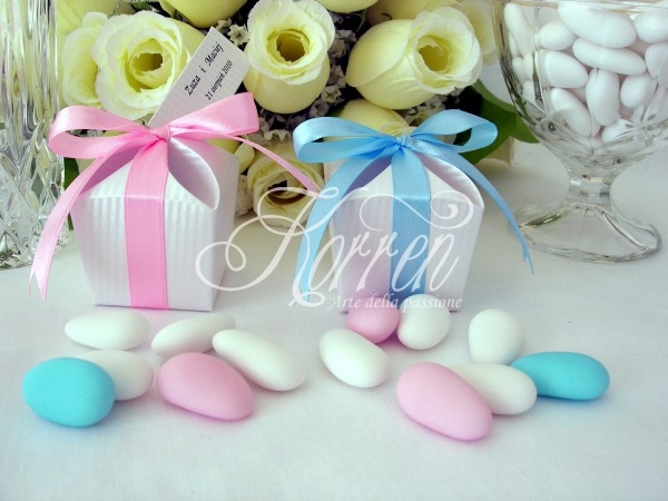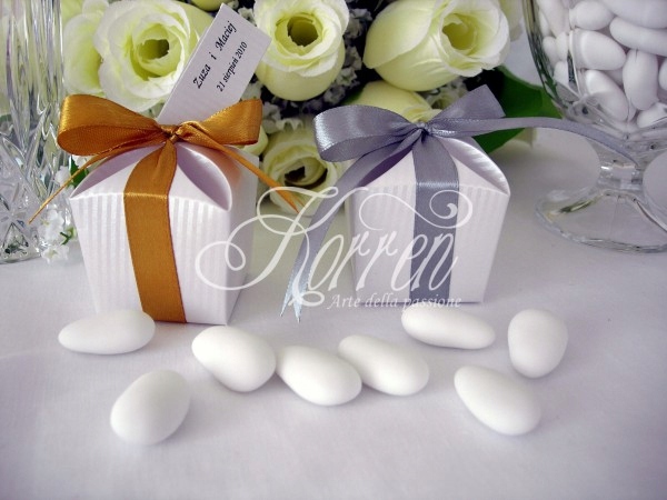 Елегантна срібна коробка з високоякісного паперу, всередині 5 штук льодяних цукерок в тюлевому мішечку, все прикрашено елегантно зав’язаним бантом, а також прикріплена срібна листівка з віршиком, іменами та датою, надрукованою на ній.