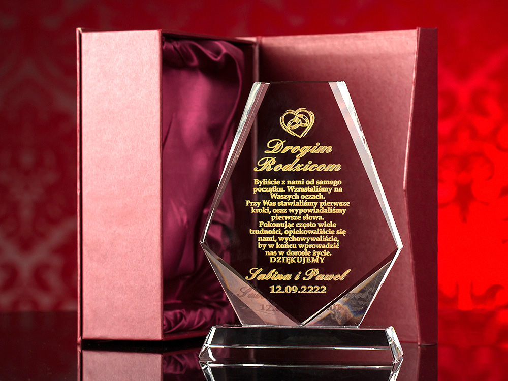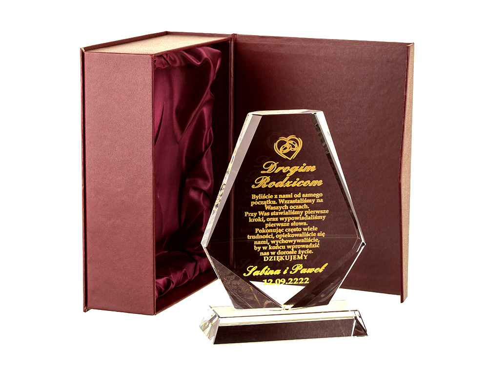 Красива подяка виготовлена за допомогою технології лазерного гравіювання безпосередньо на предметі. Статуетка CRYSTAL виглядає чудово завдяки інноваційній формі, а завдяки вирізам створює незабутнє естетичне враження. Встановлений на міцну основу з такого ж матеріалу, які міцно з'єднані між собою, він неодмінно запам'ятається одержувачу. Ви більше ніде не знайдете такої високої якості. Крім того, гравіювання наноситься майстром вручну і дуже акуратно спеціальною фарбою. Позолота/срібло переливається на світлі та дає дивовижний ефект. До всього доповнює красивий бордовий чохол з бордовим атласом, в якому статуетка виглядає ще красивіше, а позолота виділяється на тлі чохла. Можу зробити для вас - ПОДАРУНОК НА БУДЬ-ЯКИЙ НАВОД (весілля, гостини, хрещення, причастя, день народження, вісімнадцяти іменини, ювілей, річниця весілля, день матері та батька, день дідуся та бабусі, день Святого Валентина, день вчителя, тощо). b>