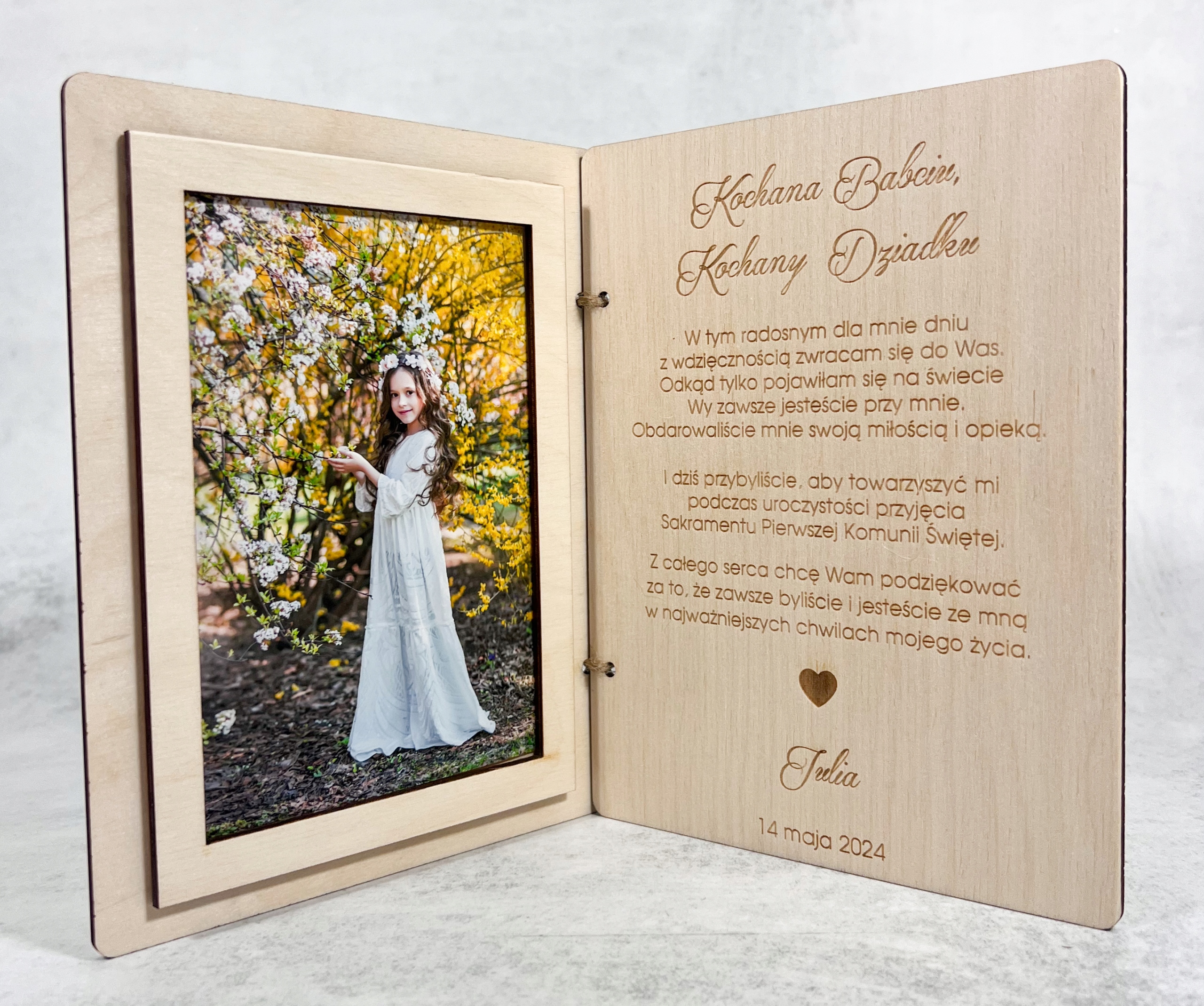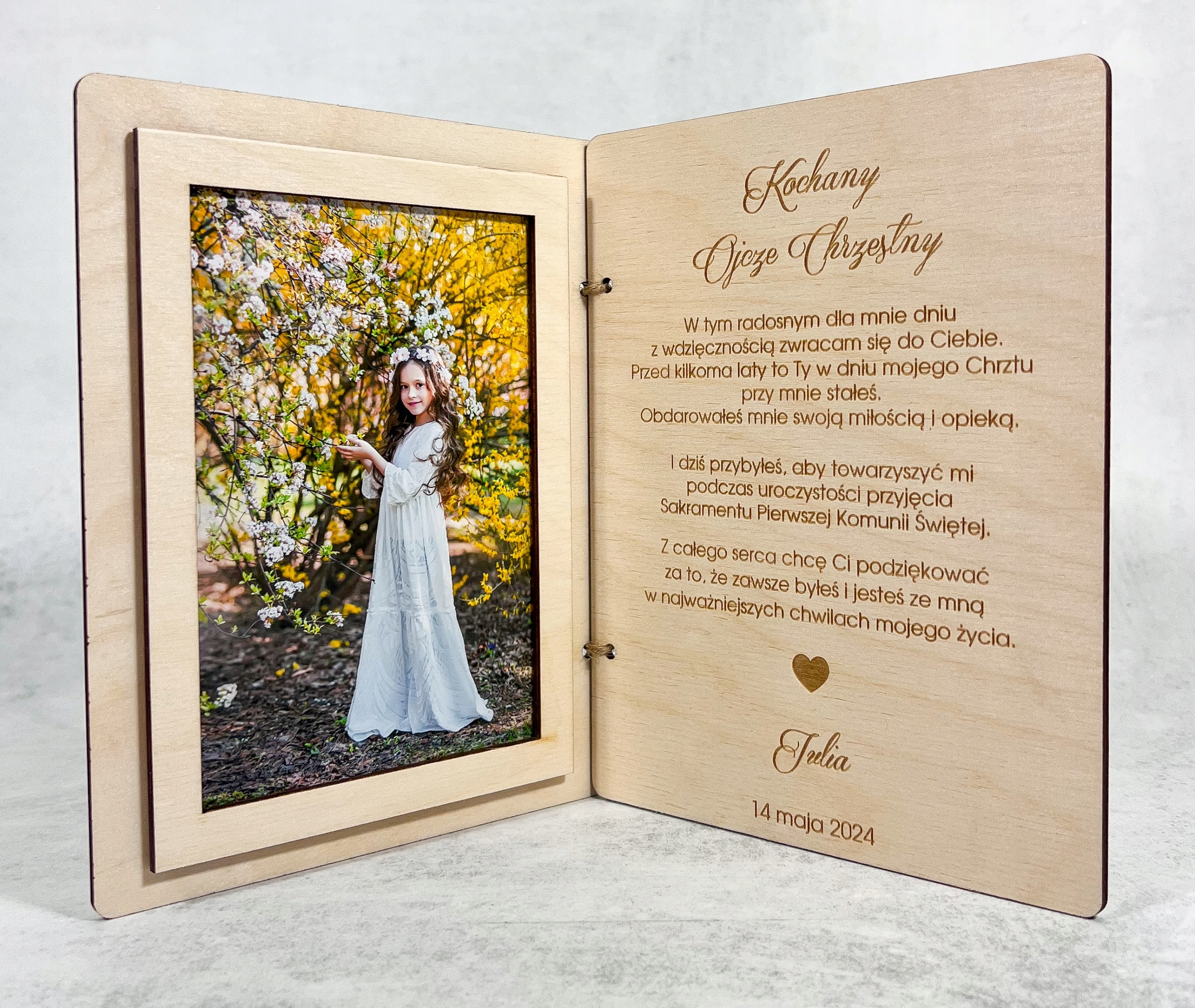 Гарний сувенір до Першого Святого Причастя. Дерев'яна листівка з фоторамкою та листом подяки Богоматері.
