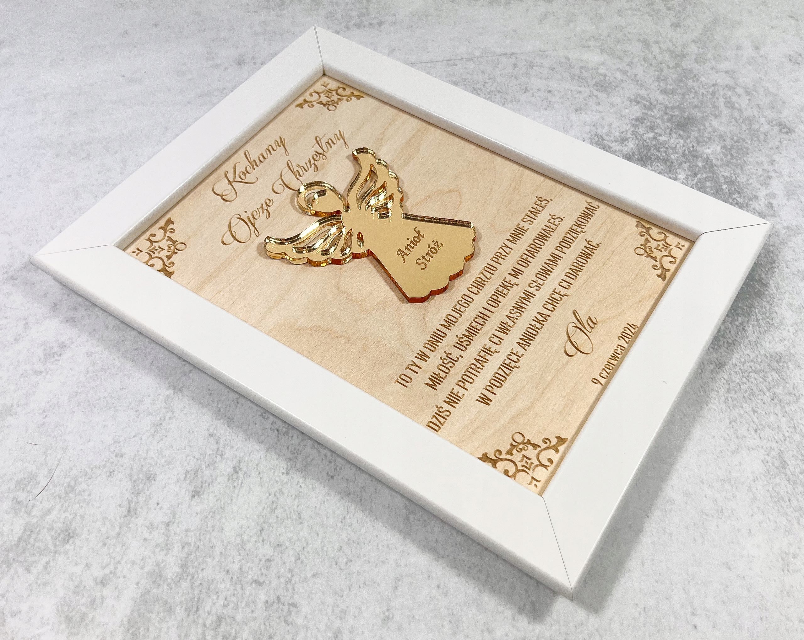 Біла рамка із золотим ангелом-охоронцем. Гарний сувенір на Святе Хрещення.