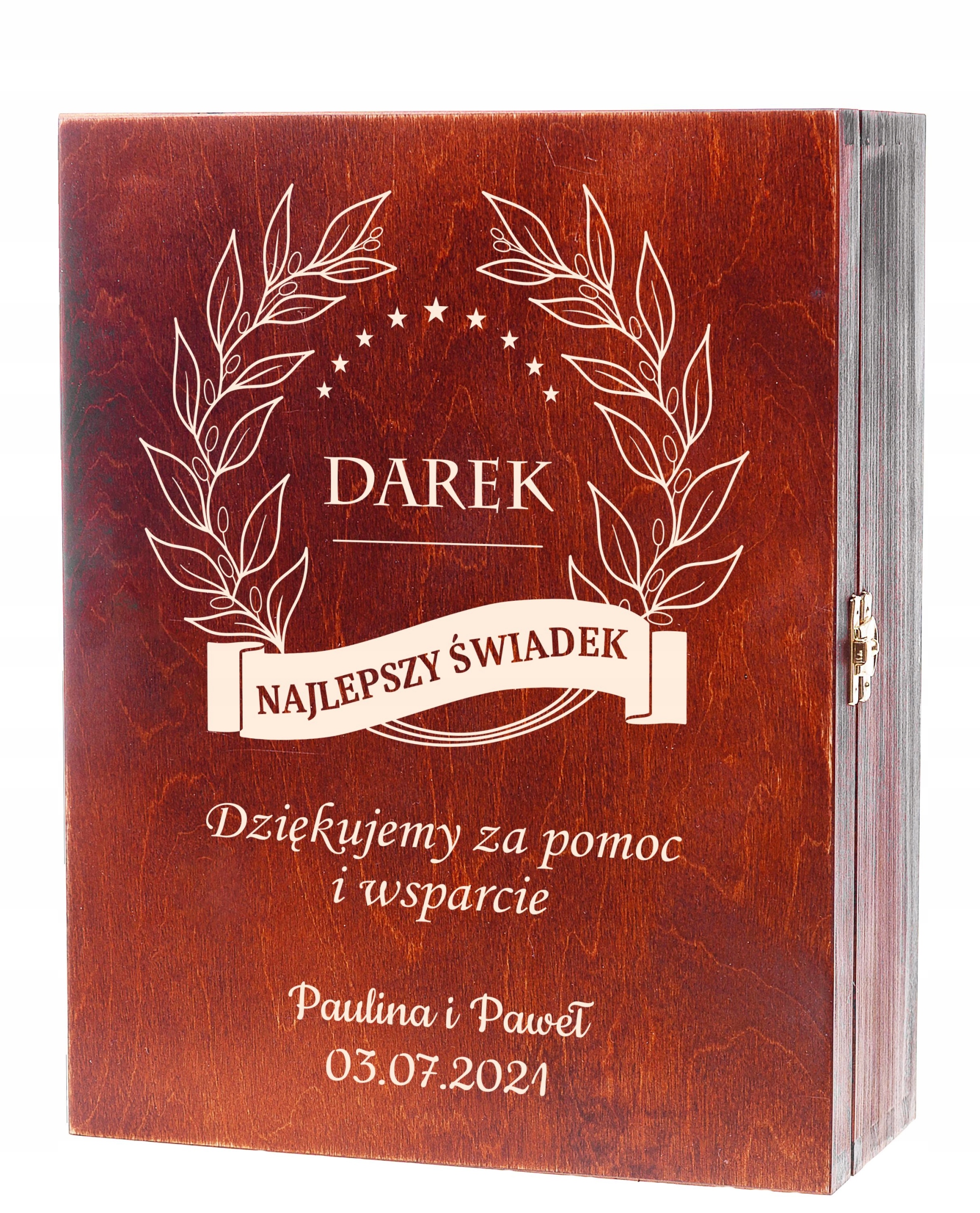Щоб виправдати Ваші очікування, ми створили елегантну дерев'яну скриньку ручної роботи. Екологічно чисті матеріали та красивий вигравіруваний мотив додають атмосфери та характеру. Ідеальна ідея подякувати свідку за виконання цієї відповідальної функції під час весільної церемонії. Обридлу пластикову або картонну упаковку ви можете замінити нашою коробкою. Скринька з індивідуальним присвятою та побажаннями буде незабутнім сувеніром на довгі роки.
