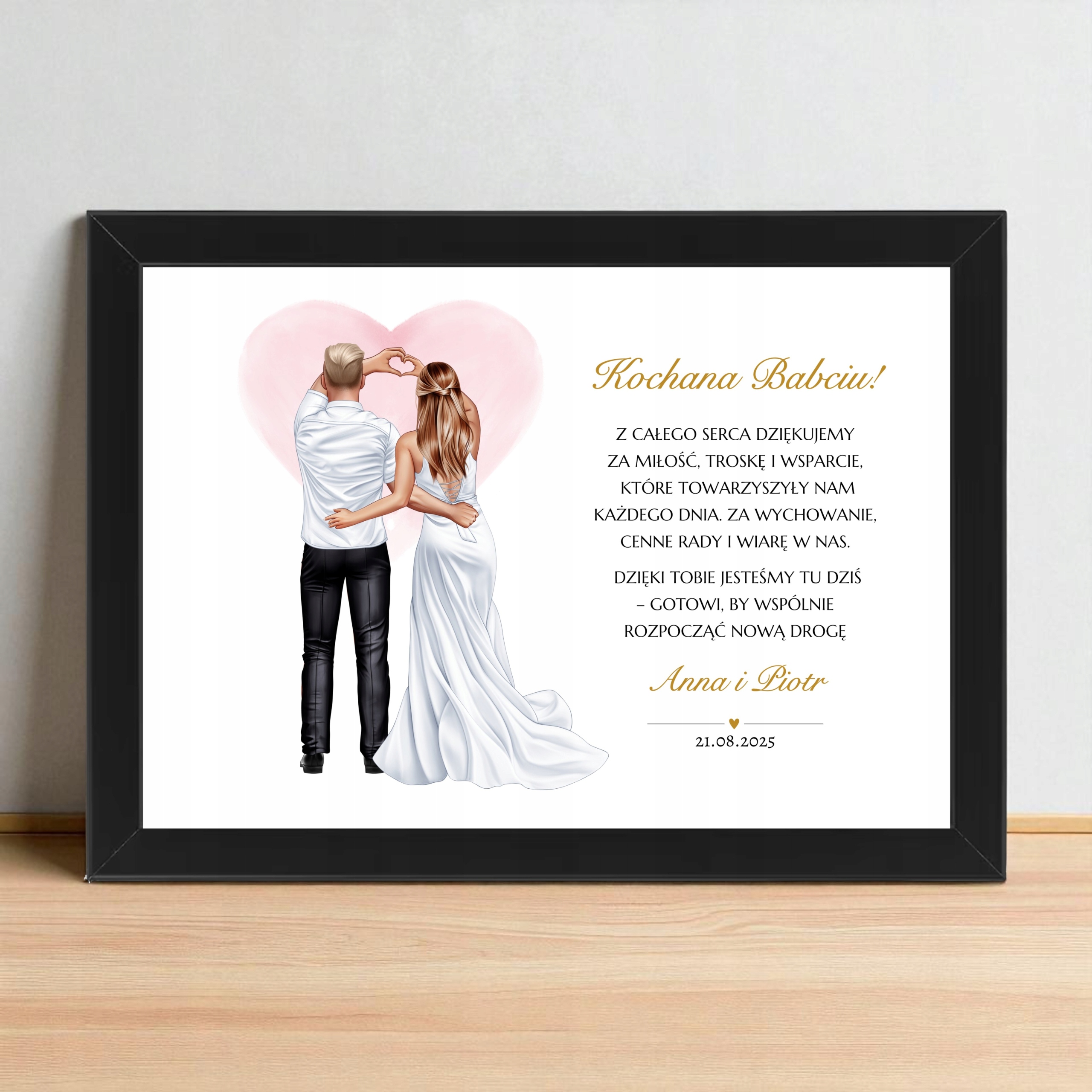 Зображення повністю персоналізоване - ви можете вибрати зачіски нареченої та нареченої , колір кадру (білий або чорний), заголовок, підпис, дата та місто. Дякую замість вмісту за замовчуванням.