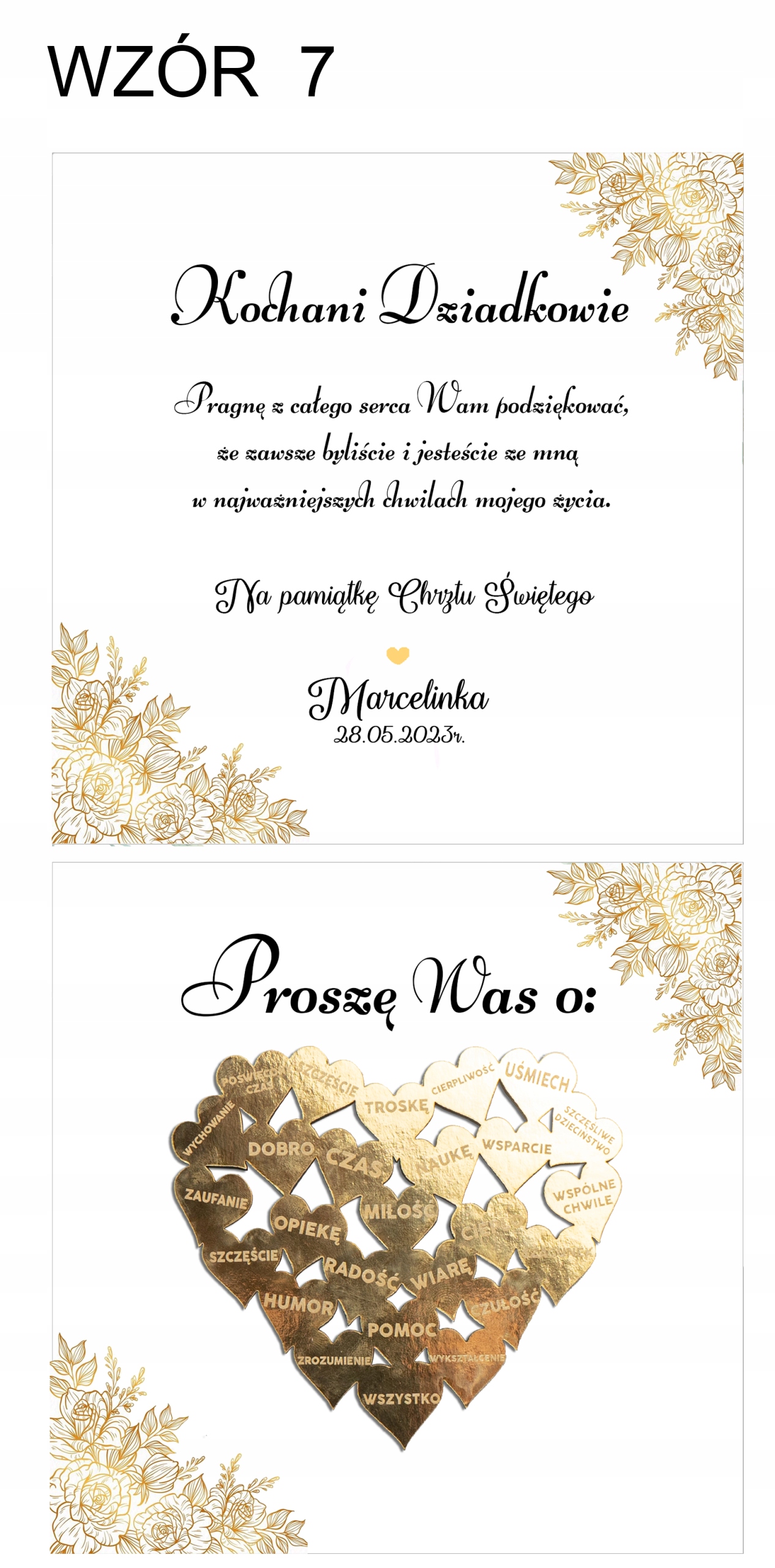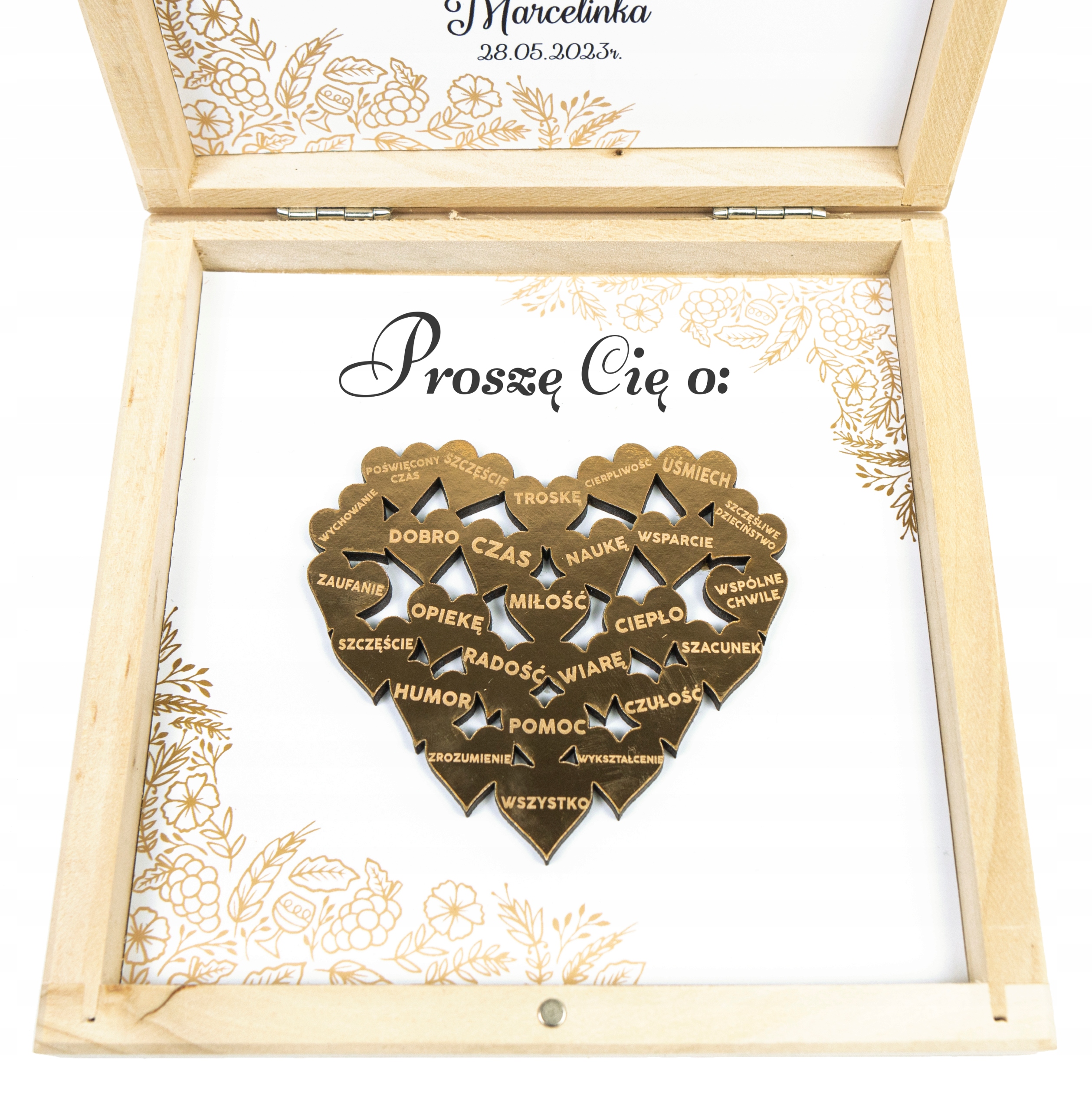 Центр коробки заповнений 3D ЗОЛОТИМ ДЗЕРКАЛЬНИМ СЕРЦЕМ, яке складається з менших сердечок із вигравіруваними на них текстами подяки.
