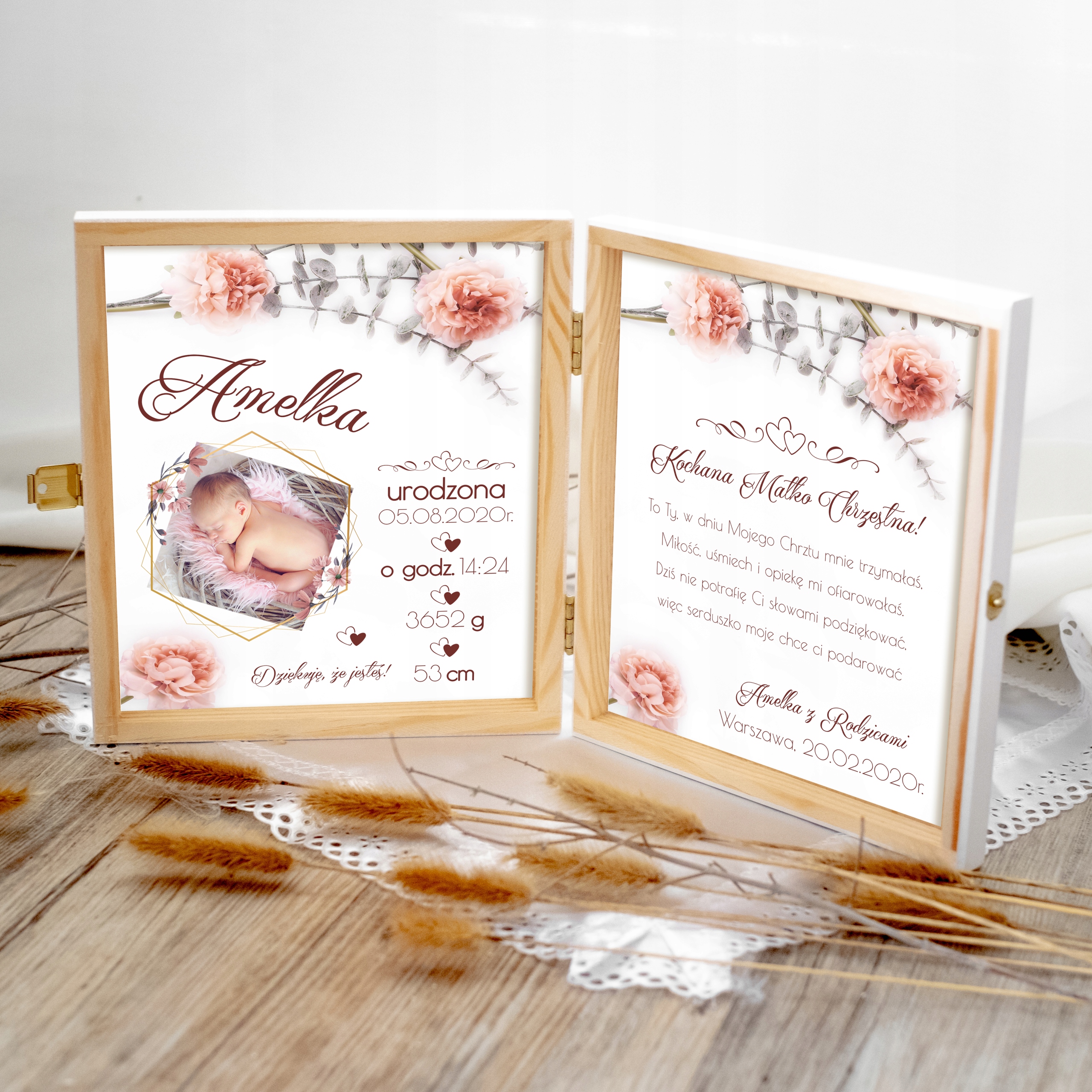 Дерев’яний лист подяки в елегантній коробці з персональною присвятою та фотографією дитини стане чудовим подарунком для хрещеної мами, кума, бабусі, Дідусь, тітка, дядько в день Святого Хрещення!
