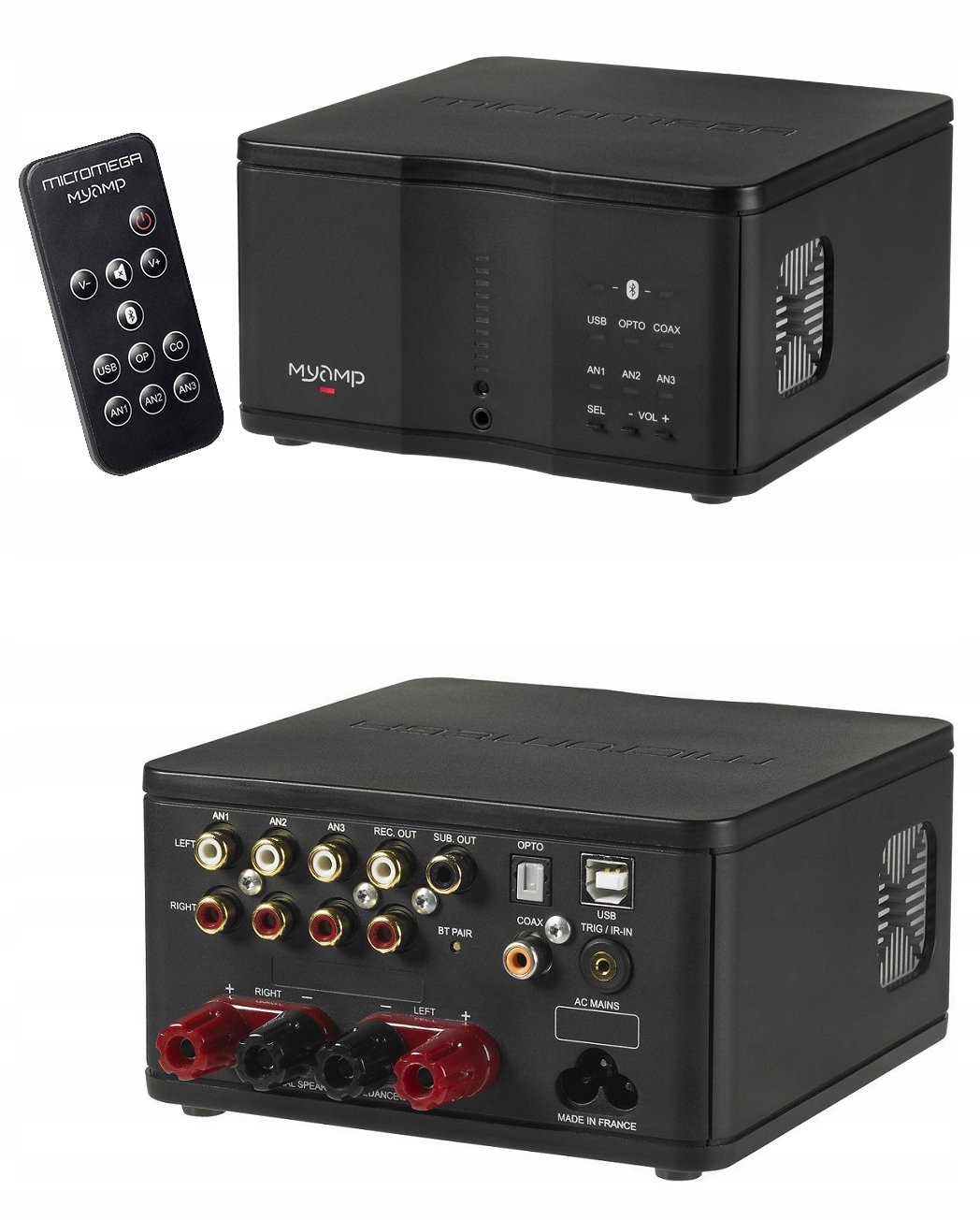 У комплекті з Micromega MyAmp, революційним пристроєм 3-в-1: висококласним 24- біт/192 кГц ЦАП, стереопідсилювач класу AB 2x60 Вт RMS і приймач потокового аудіо Bluetooth aptX, вироблений у Франції – зроблено у Франції.