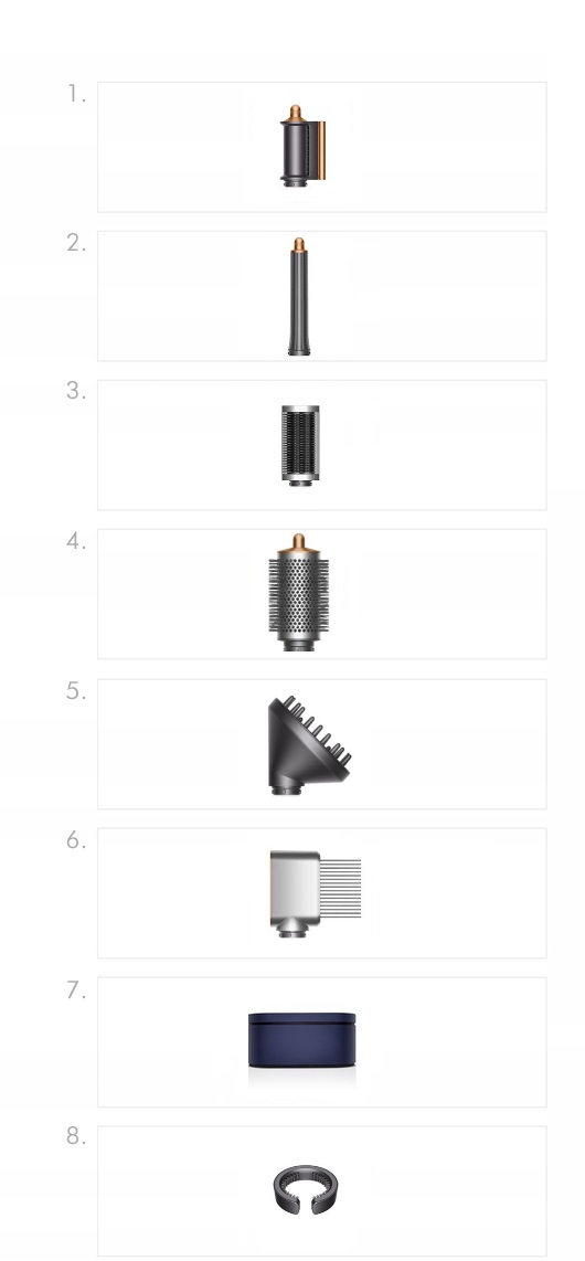 - Наконечники для завивки та завивки в двох напрямках, щітки для укладання та розгладження, а також наконечник для попереднього сушіння та обробки, який сушить, розгладжує та приховує кучеряве волосся