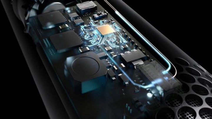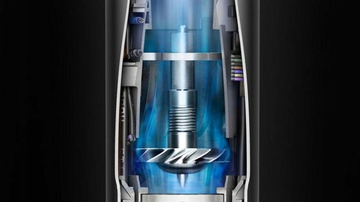 13 лопатей робочого колеса в цифровому двигуні Dyson V9 обертаються зі швидкістю до 110 000 об/хв, створюючи тиск 3,2 кПа, достатнього для створення ефекту Коанди.