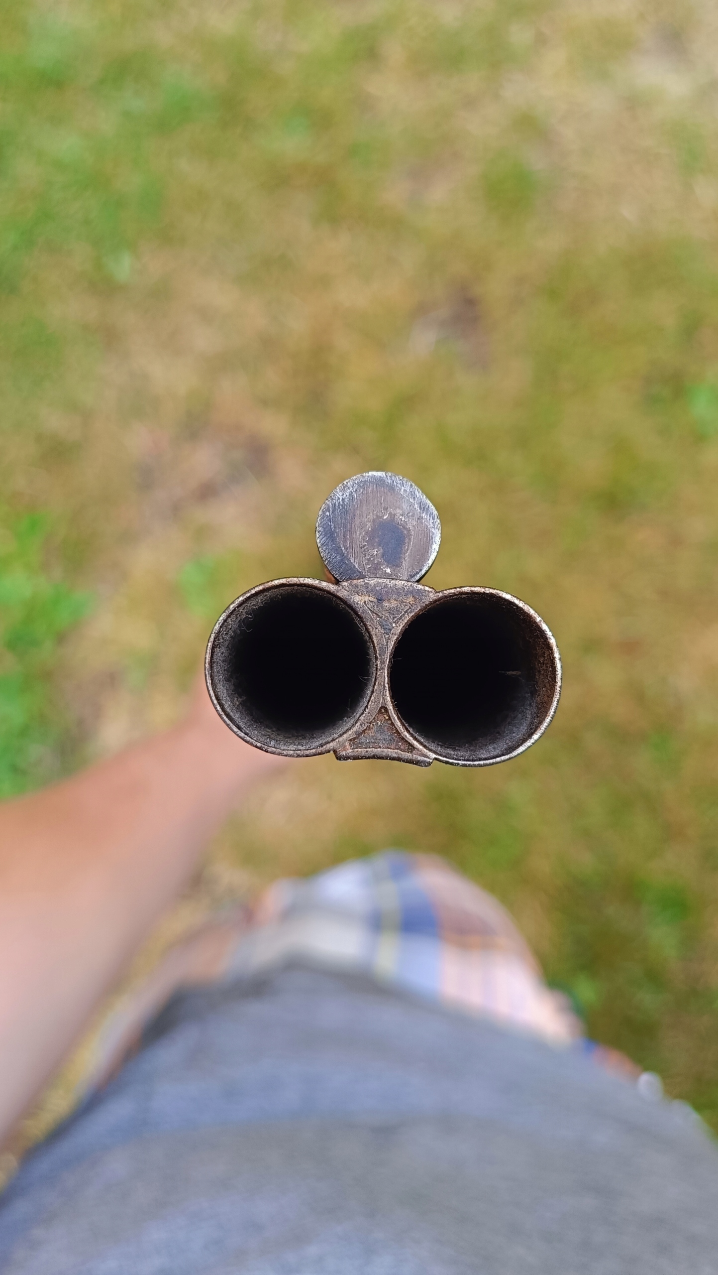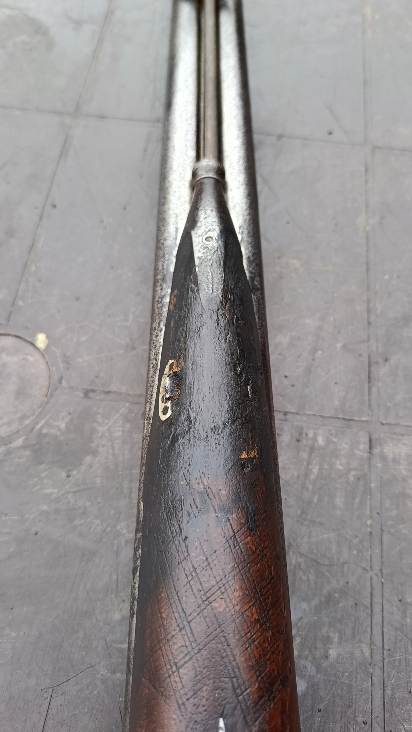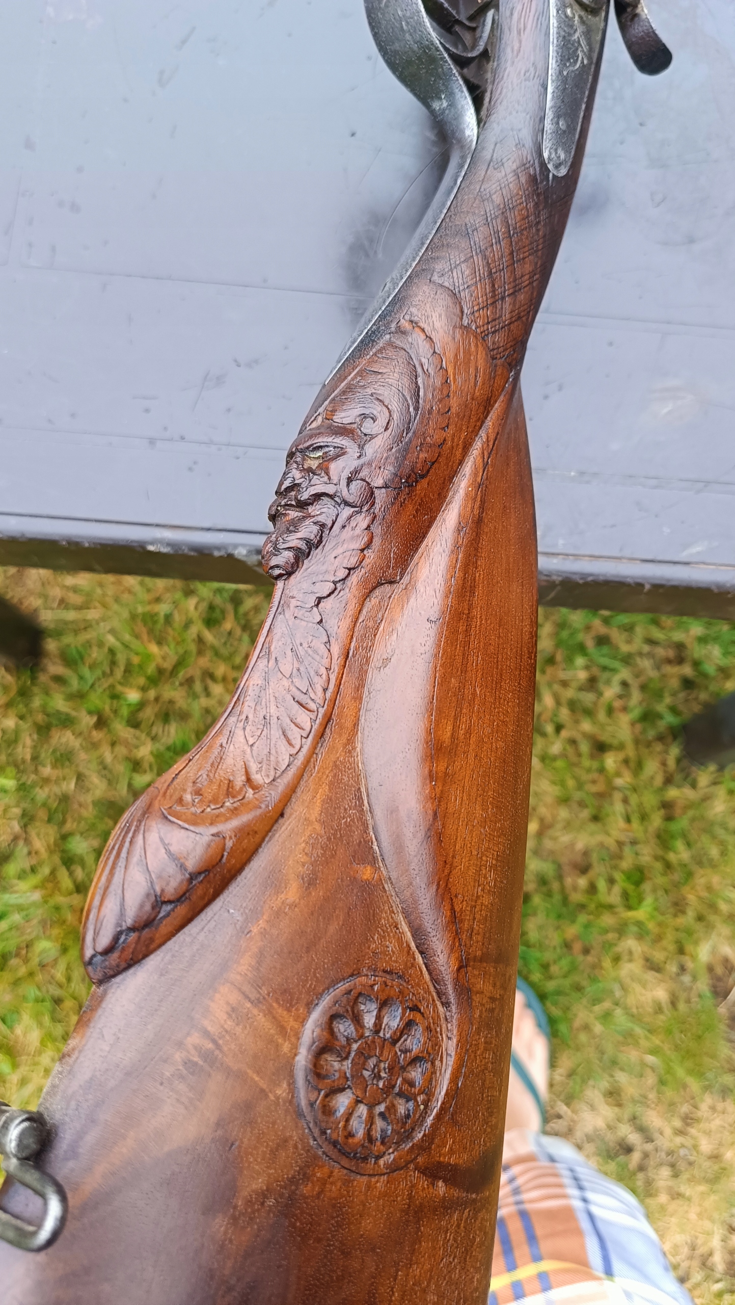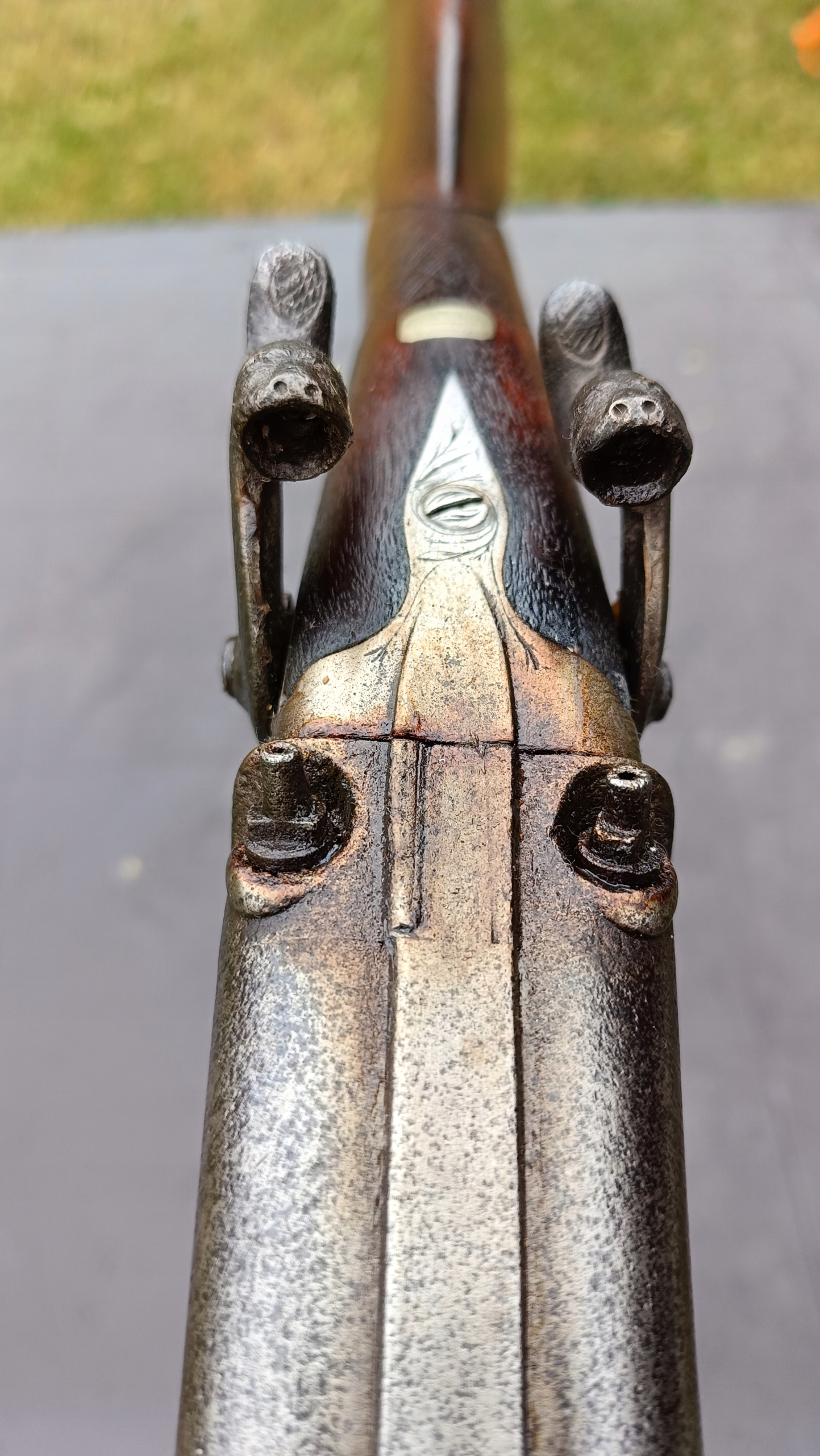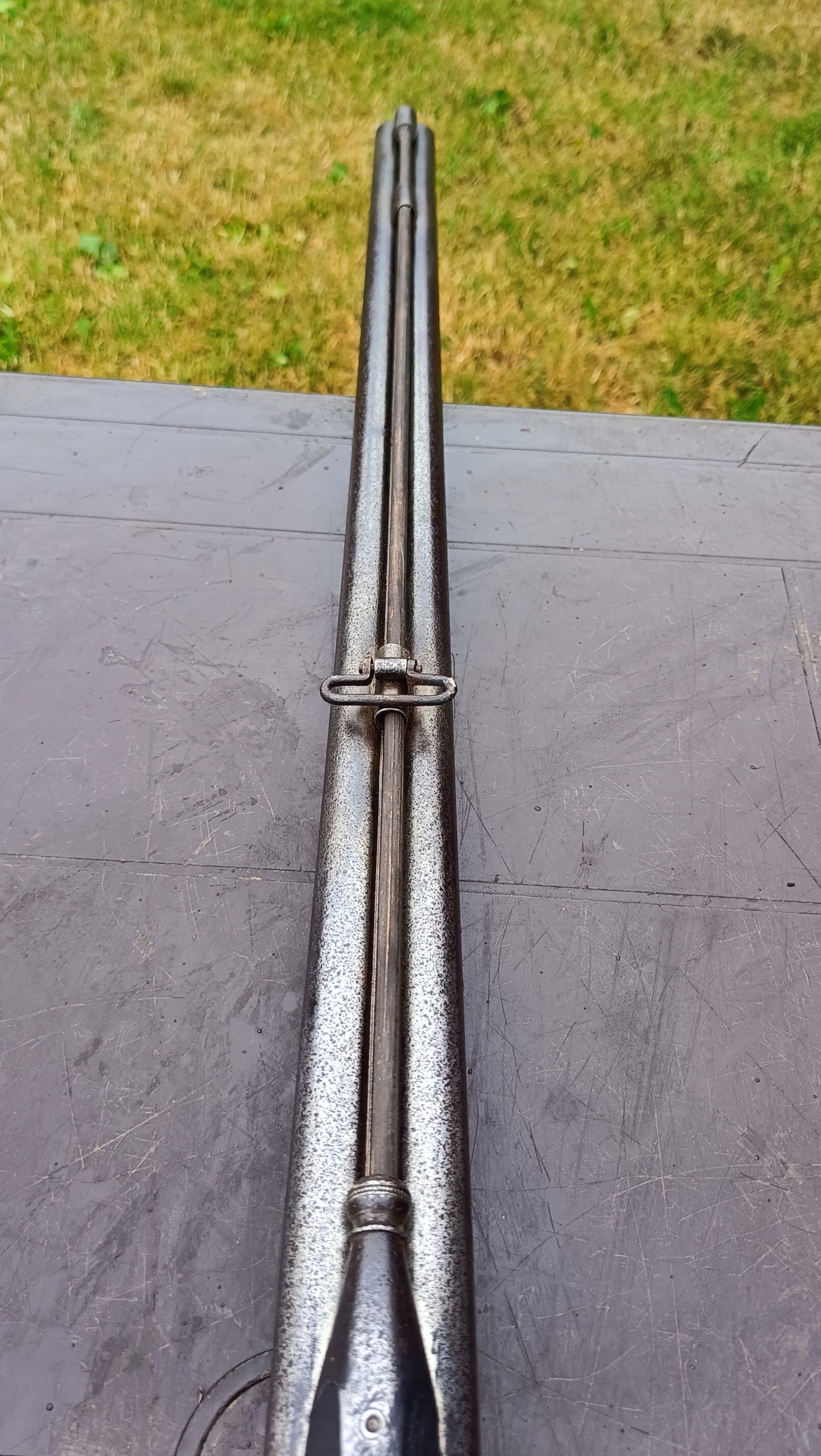 завантажено з фронту. Можна вистрілити сухий постріл, подвійне напруження. Замки тригера затягнуться 2 смуги. Проста бочка, має невеликі ями на всій бочці. Дерево має сліди тріщин. Камін у порядку.