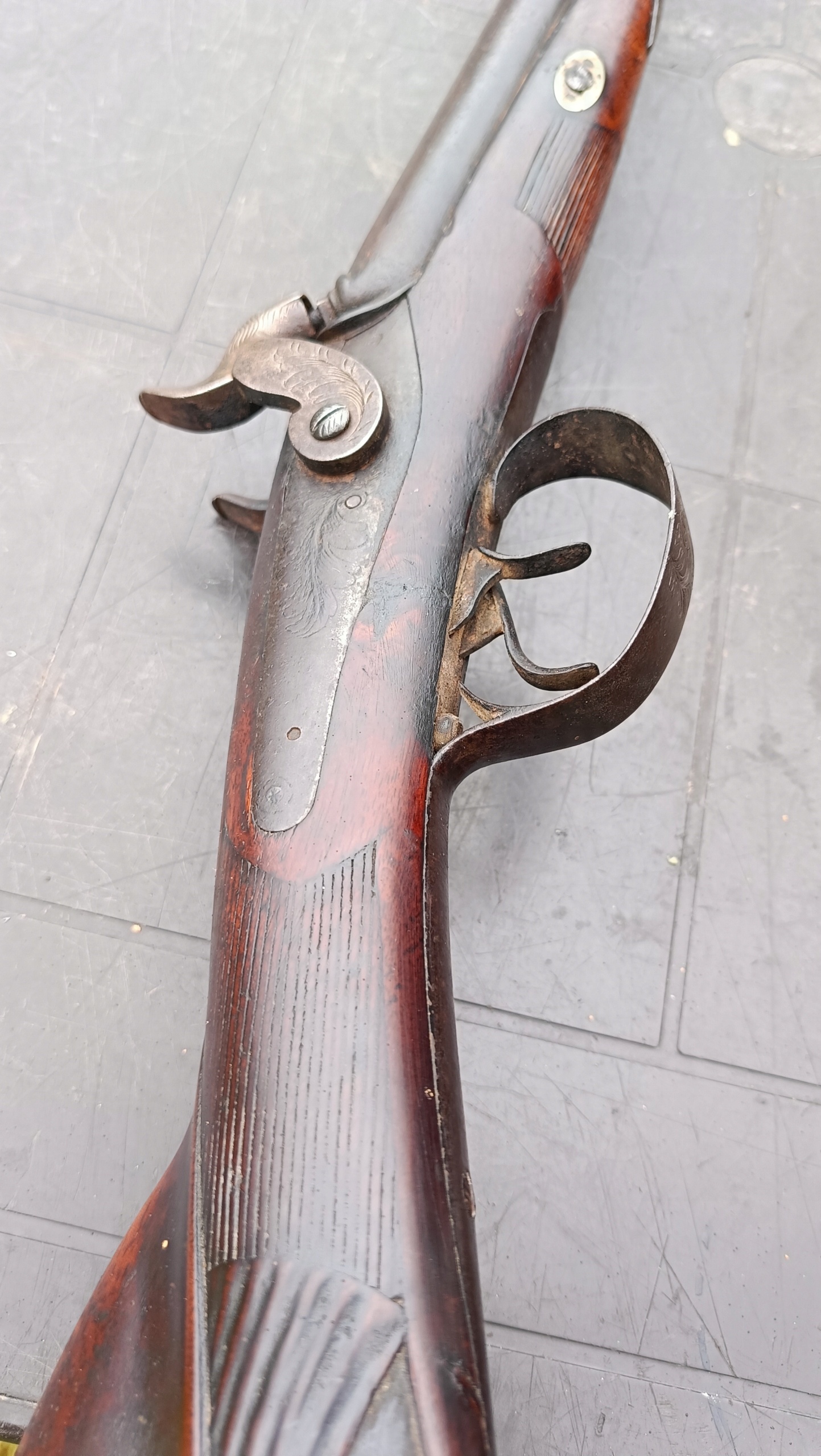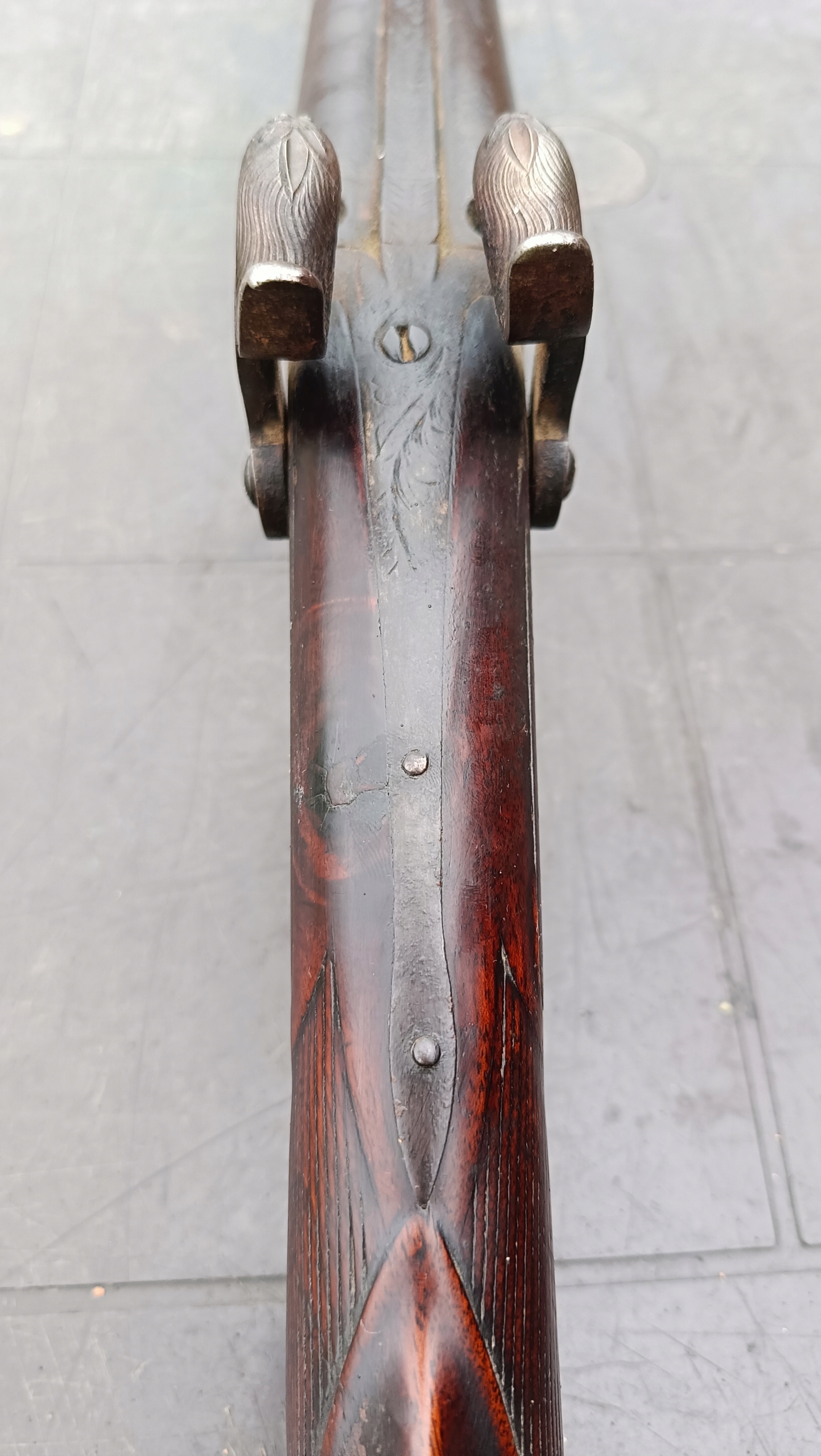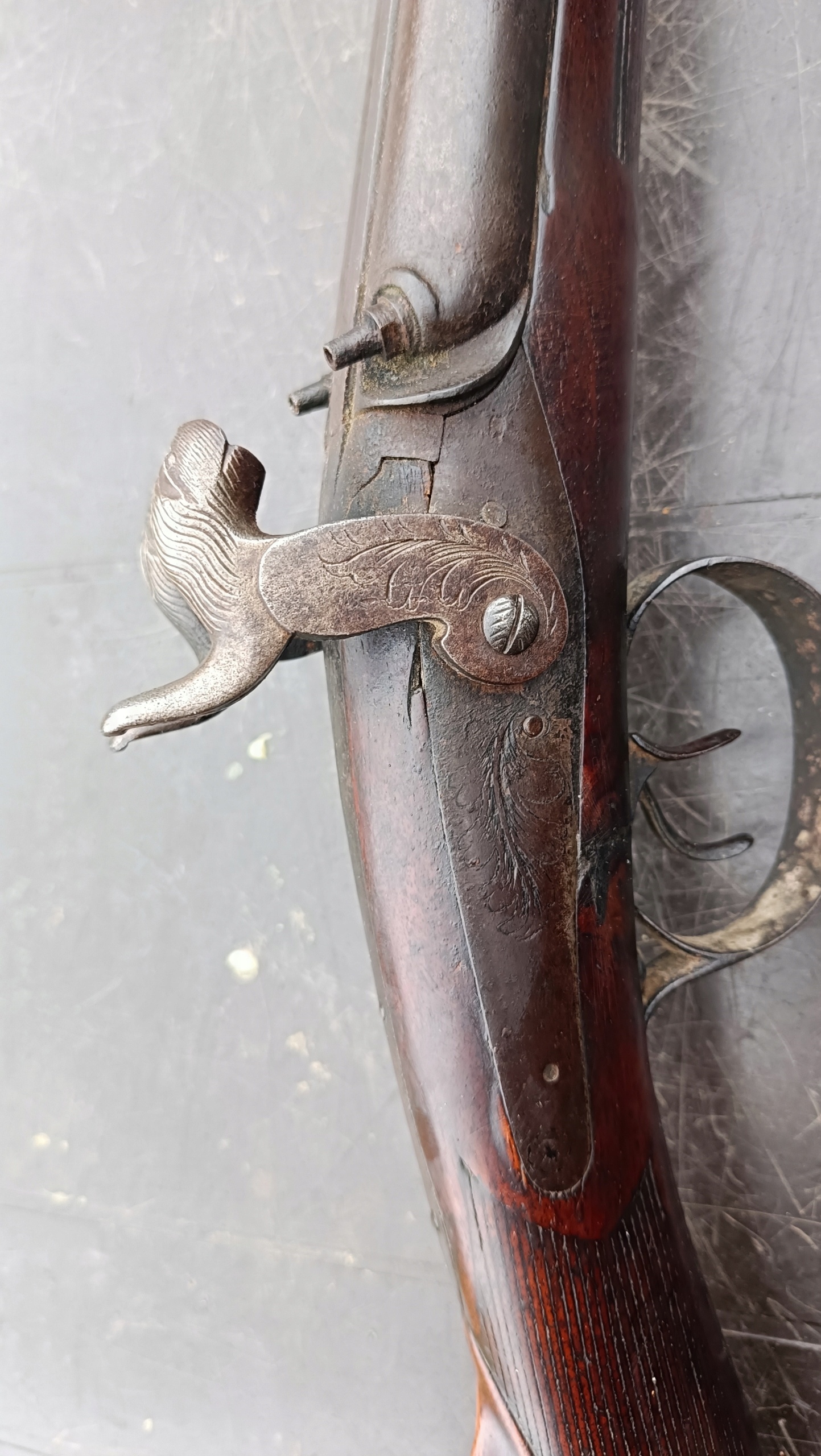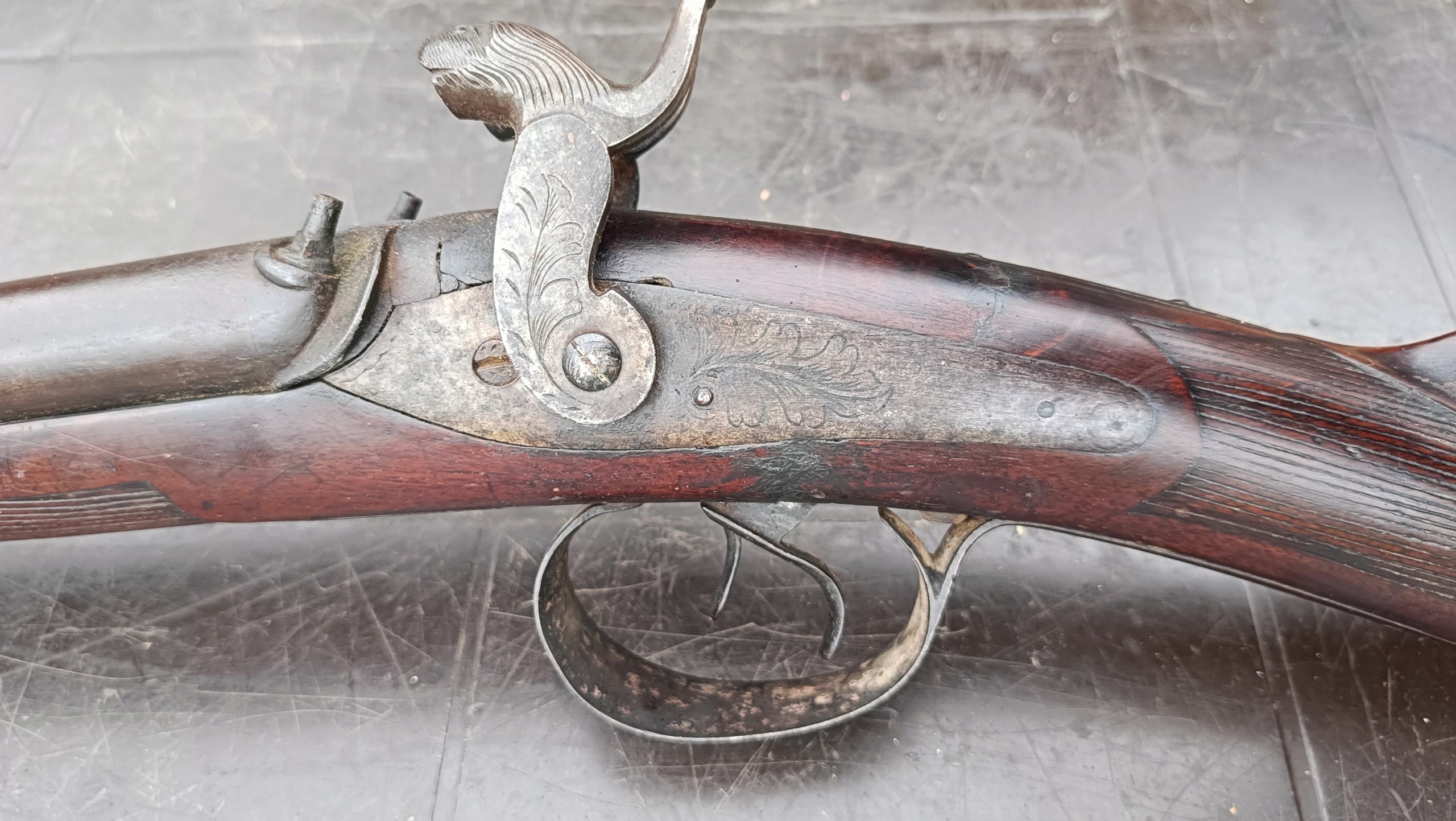 завантажено з фронту. Можна вистрілити сухий постріл, подвійне напруження. Замки тригера затягуються двома брусками. Пряма бочка, у хорошому стані. Дерево має сліди невеликих тріщин -видимі на малюнках. Каміни добре.