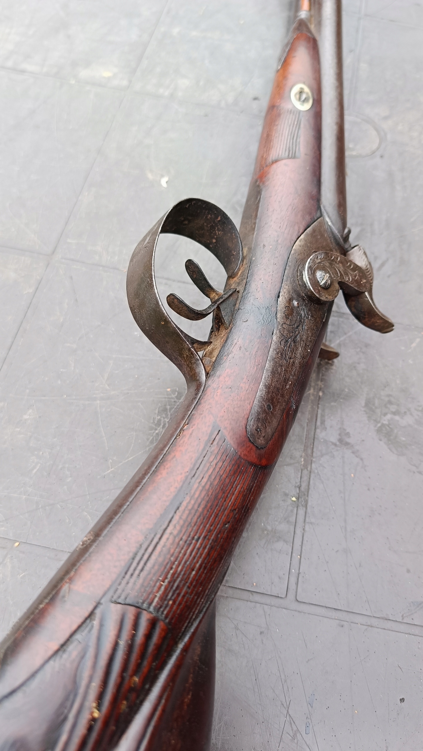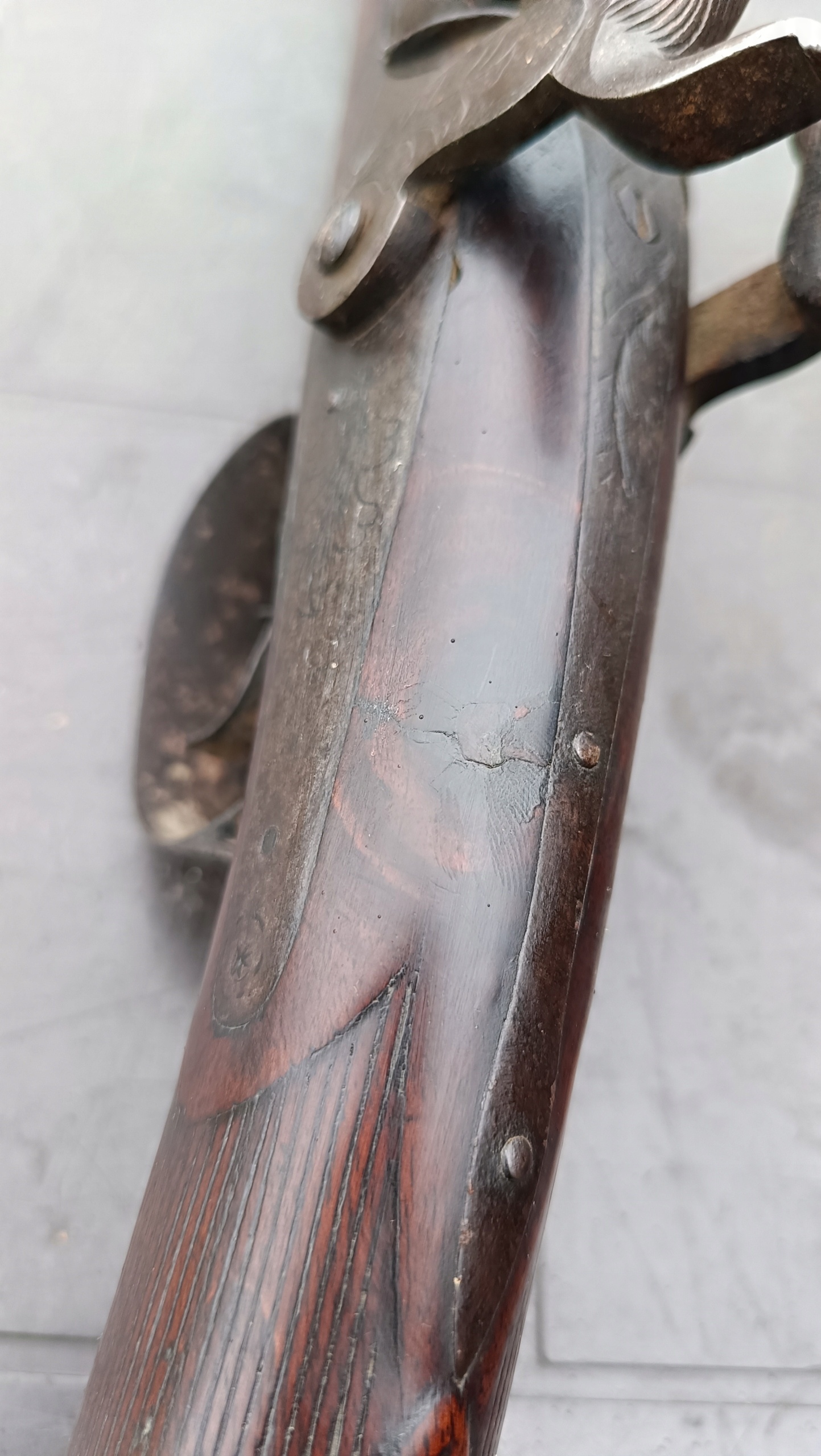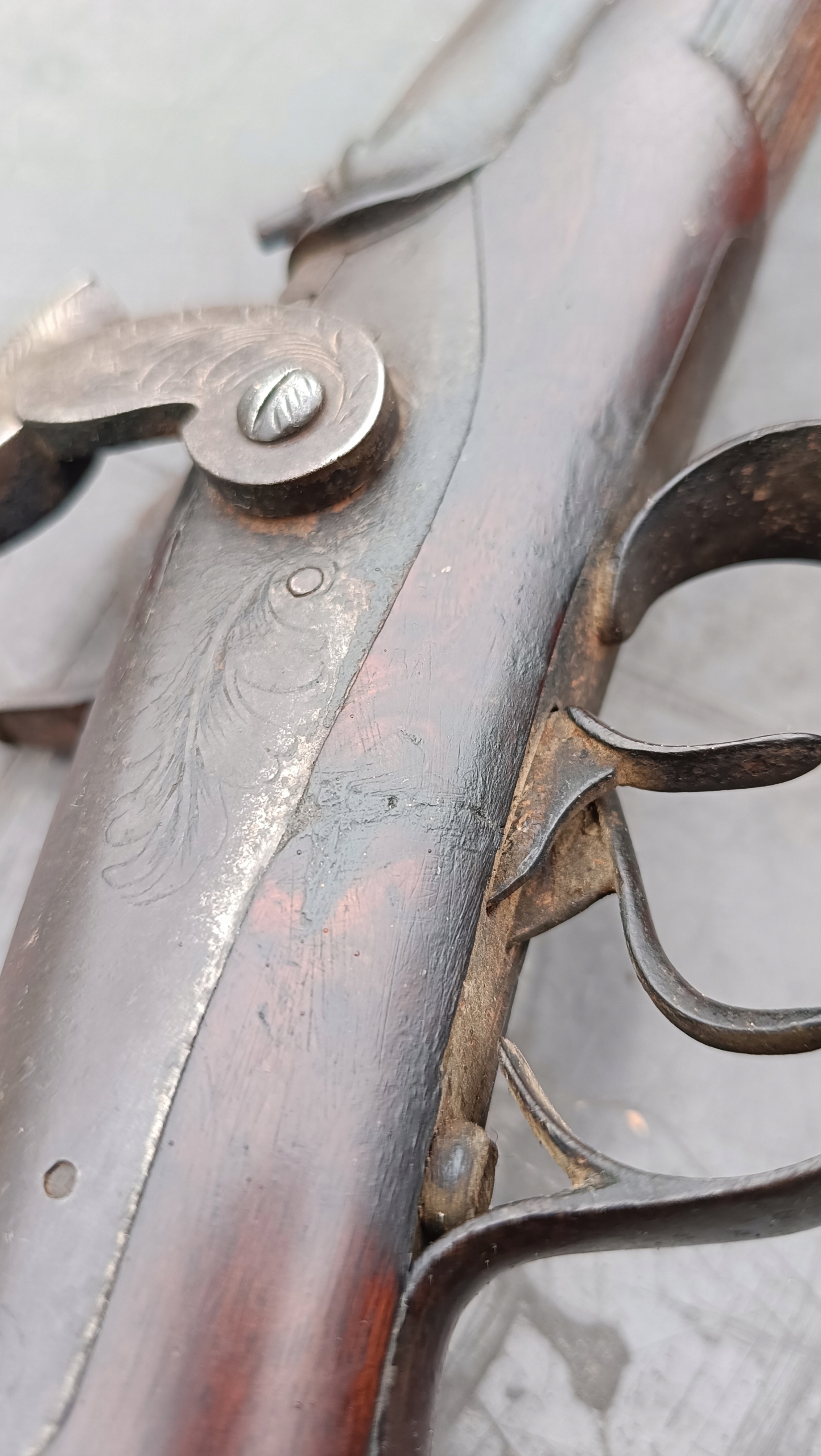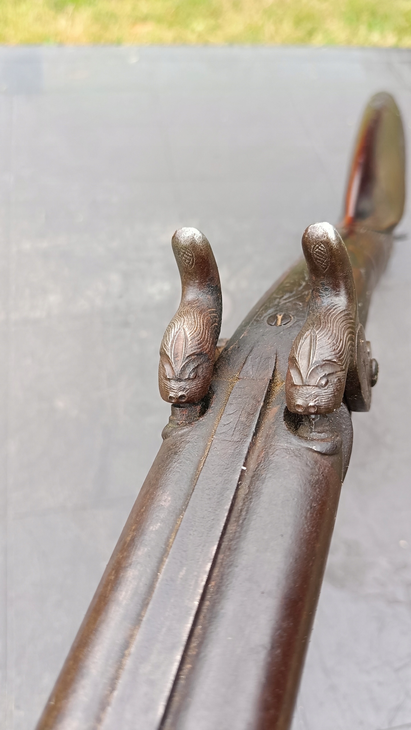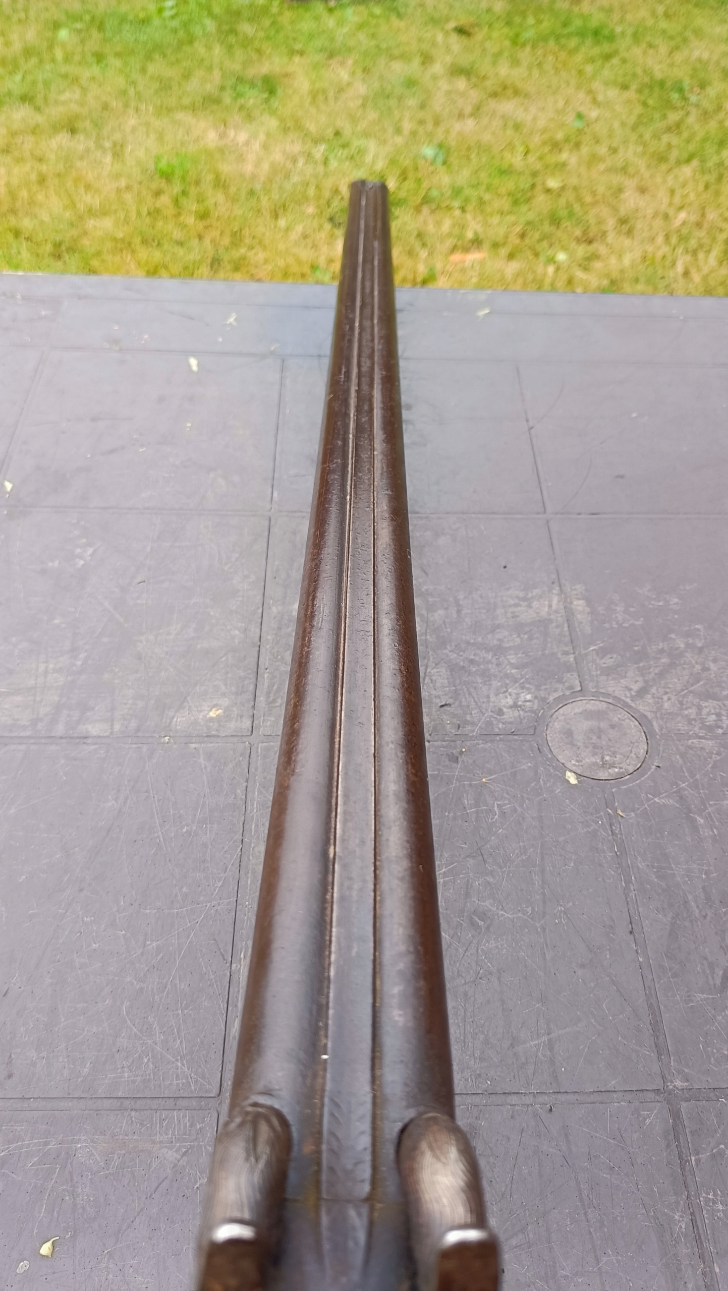 завантажено з фронту. Можна вистрілити сухий постріл, подвійне напруження. Замки тригера затягуються двома брусками. Пряма бочка, у хорошому стані. Дерево має сліди невеликих тріщин -видимі на малюнках. Каміни добре.