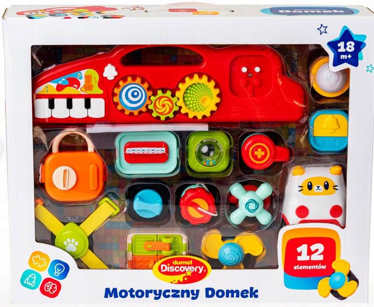 Дім, створений для любителів блоків і аркадних сюрпризів! У набір входить велика пластина з виступами - стінка будиночка, до якої можна прикріпити блоки з руховими завданнями. Для маленьких пальчиків є віяло для обертання, засувки для ковзання, пряжка для застібки, поворотний елемент і багато іншого! Дах будиночка оснащений не тільки практичною ручкою для перенесення іграшки, а й звуковою панеллю з міні-піаніно і місцем для кріплення одного з двох активних блоків - з дзвіночком або лампою. Додатково є шестерні для повороту.
