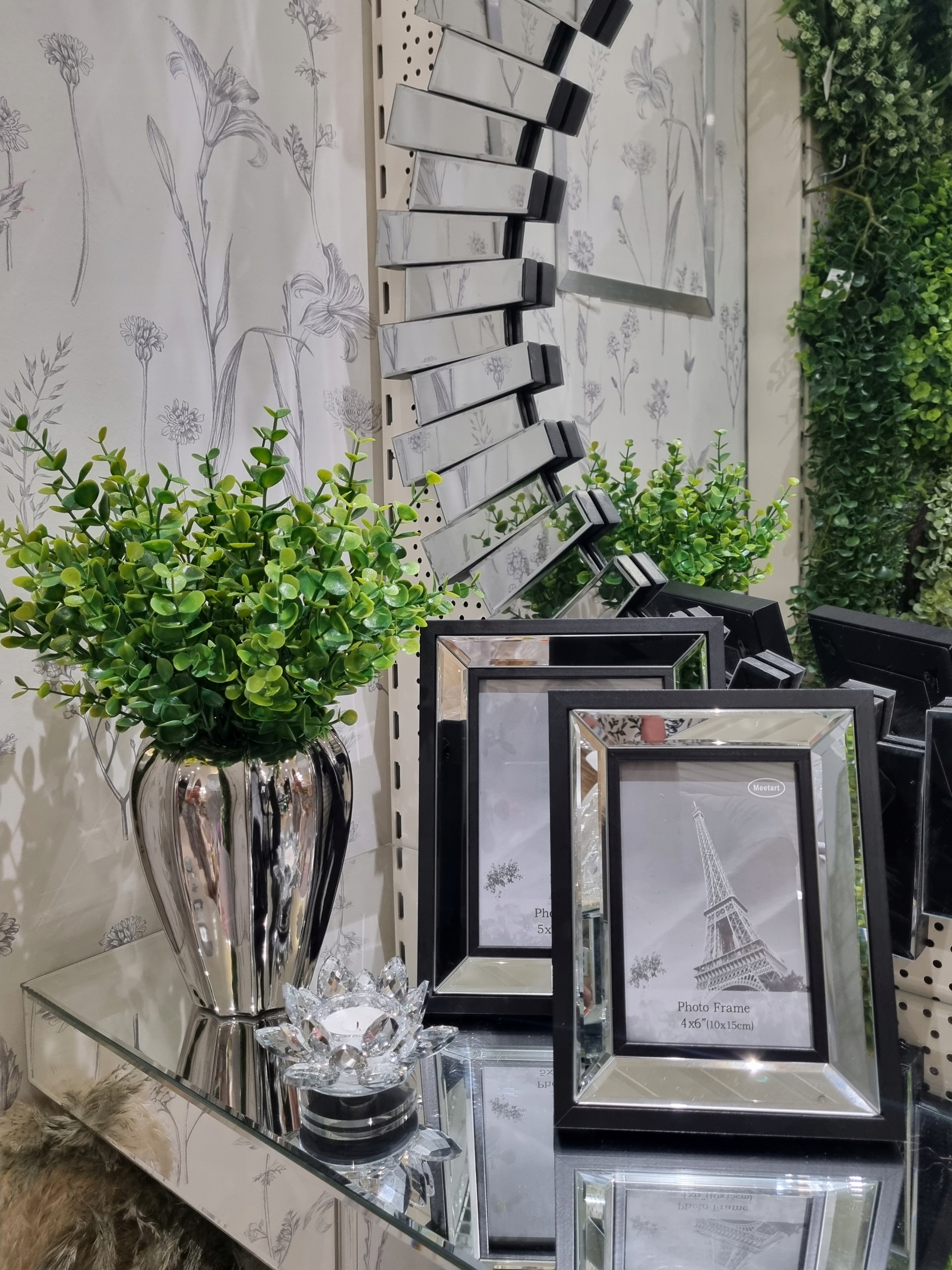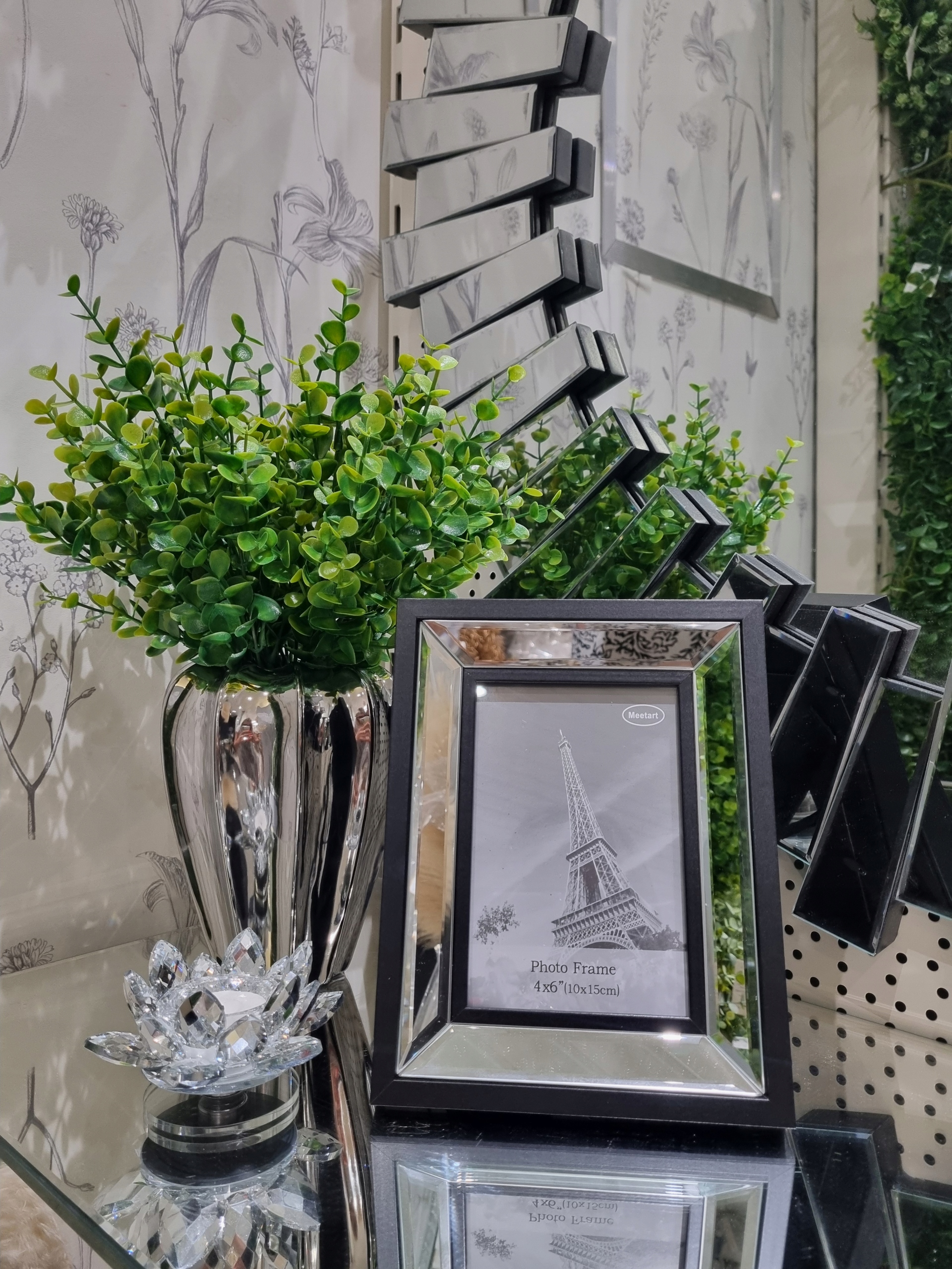 Елегантна фоторамка 4x6" (10x15 см), виготовлена з комбінації матового чорного та дзеркального скла. Сучасний дизайн зі скошеною дзеркальною рамою ідеально відбиває світло, додаючи інтер’єру вишуканості та блиску. Ідеально підходить для сімейних фотографій, портретів або декоративної графіки.