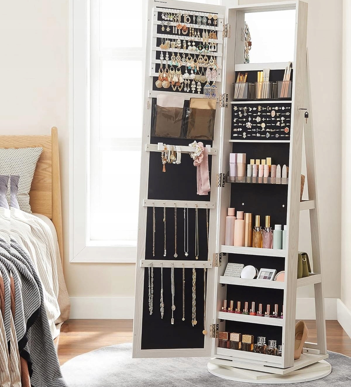 Елегантна та функціональна, роторна ювелірна шафа ідеально підходить для спалень, шаф, ванної кімнати або передпокою. ) Li> Матеріал: mdf, оксамит, дзеркало