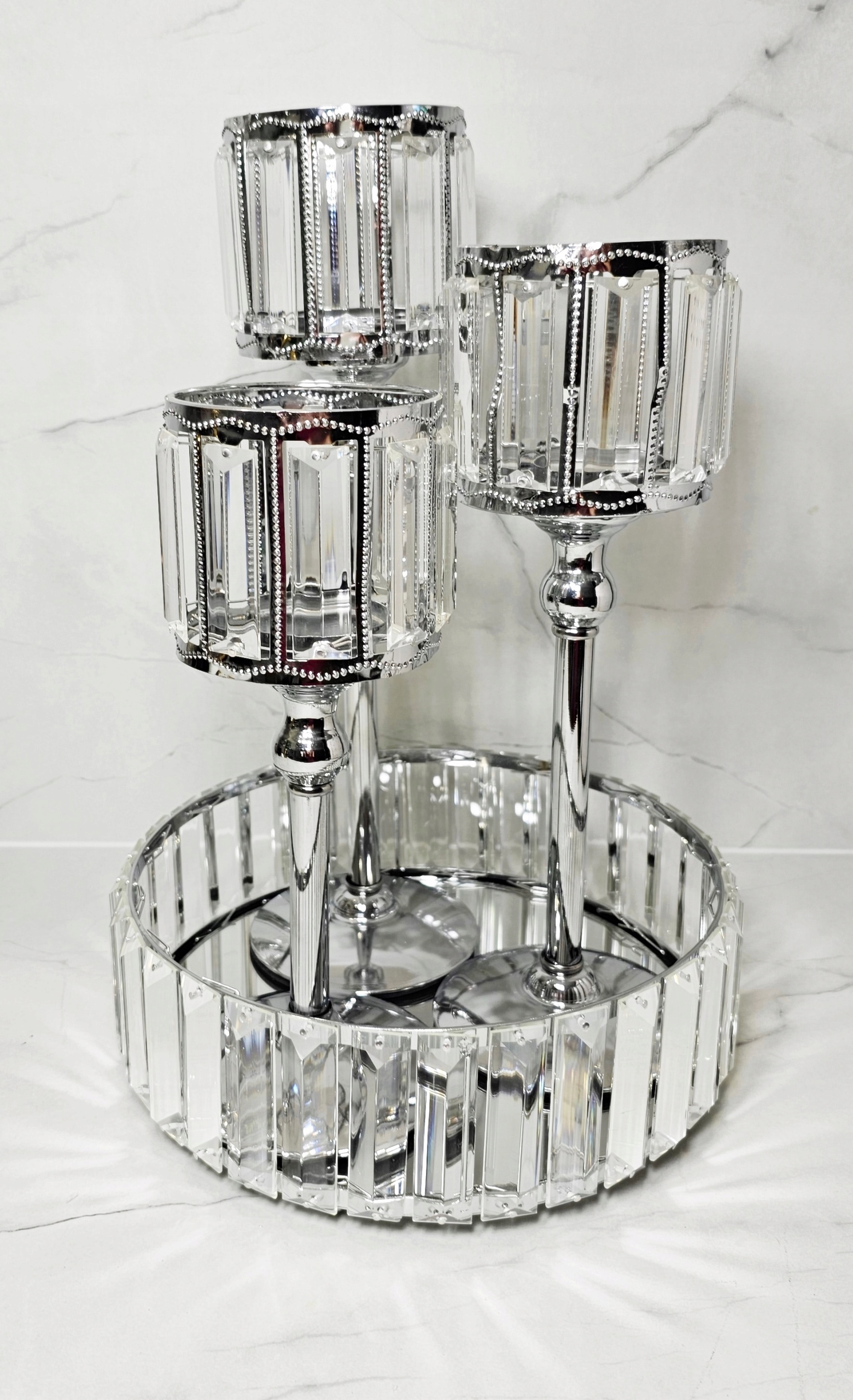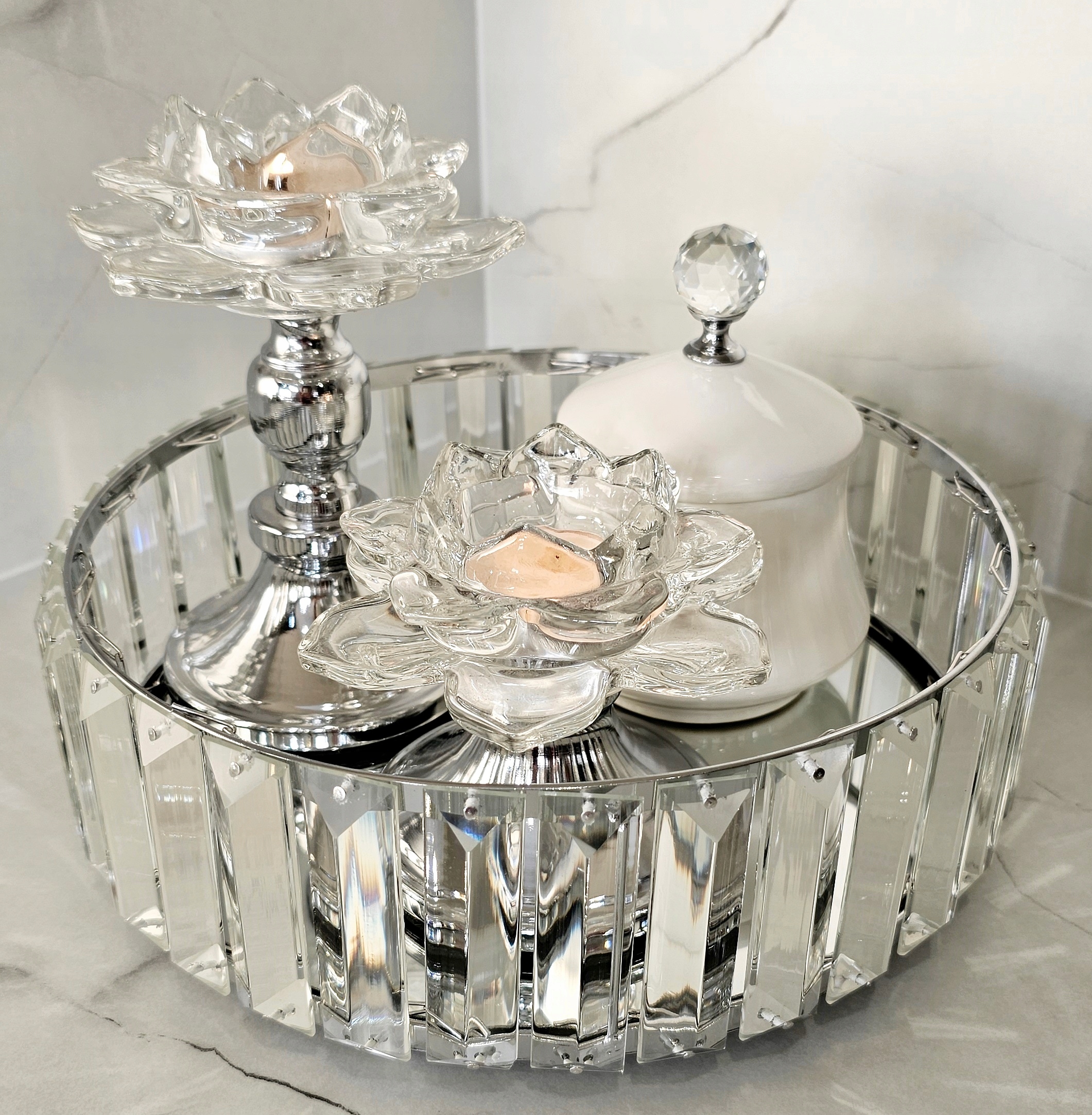 Красива дзеркальна підставка з великими кристалами. Продукт, який рекомендують і охоче обирають клієнти як елемент столу з солодощами та випічкою для урочистих подій. Він також може виконувати декоративну роль у поєднанні зі свічками та декоративними ємностями. Чудово виглядає як декоративна основа для косметики та парфумерії.