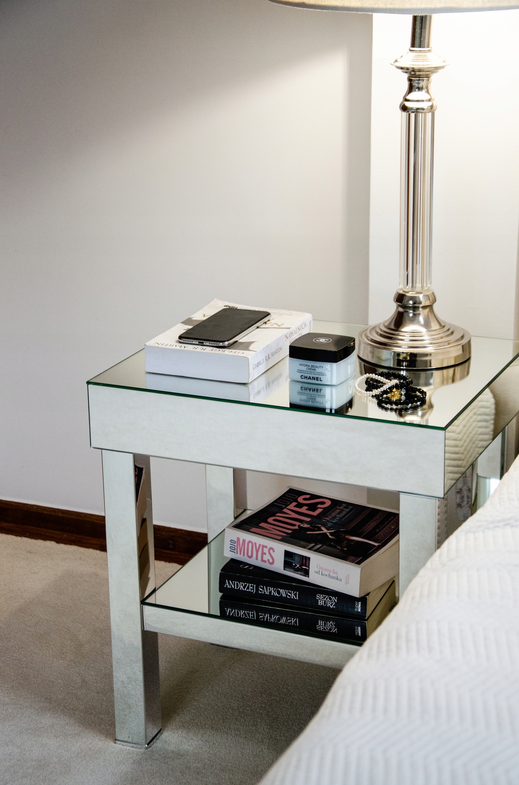 - Дзеркальний бічний столик із полицею