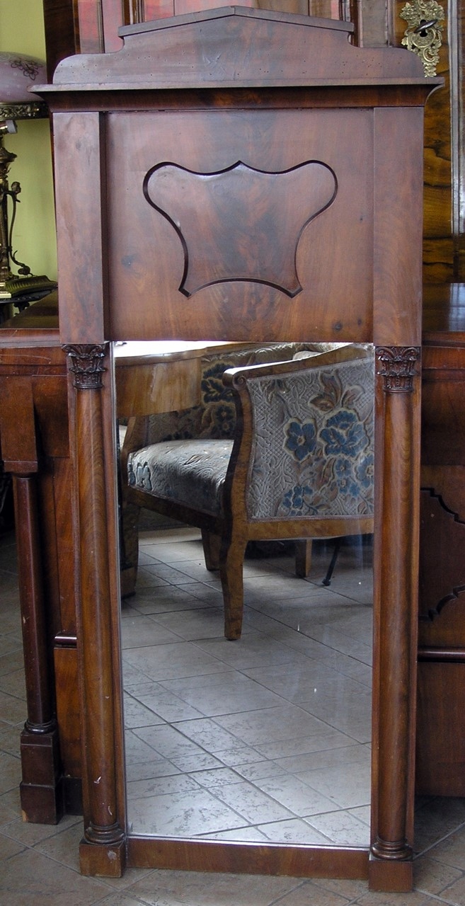 Дзеркало бідермаєр для обслуговування. Червоне дерево. Максимальна ширина 59 см; глибина max 9 см; зріст 135 см. Тарілка 81 см х 49,5 см.