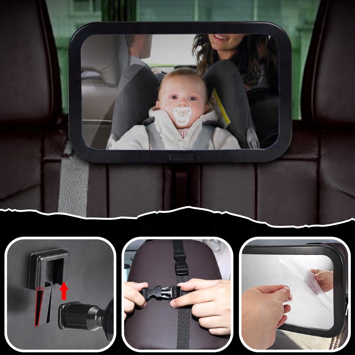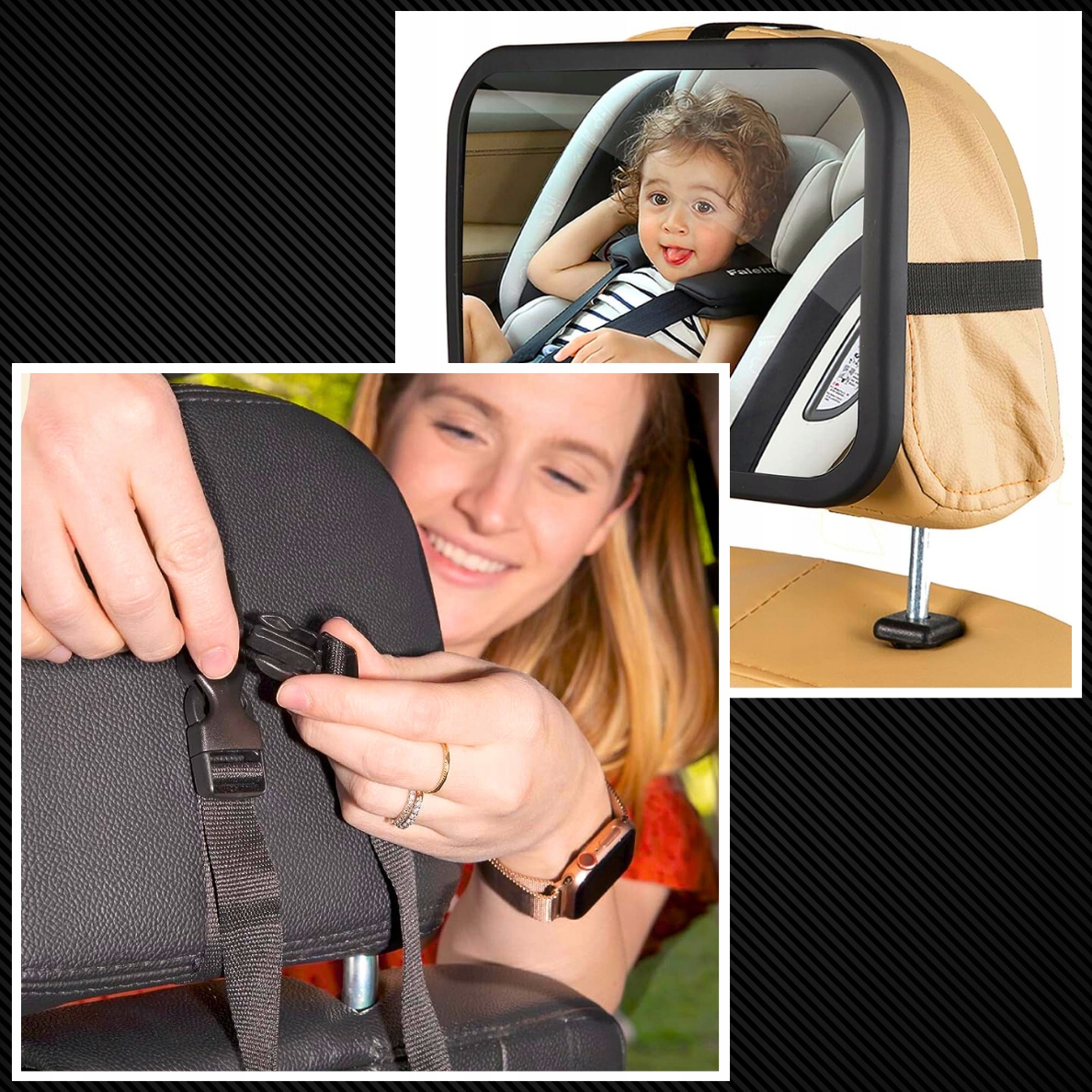 - 4 смуги - Наша модель має 4 смужки кріпляться вертикально і рівнями, що стабільна стабільна для підголівника і не буде розпущена; Неможливо, що дзеркало ковзатиме вниз і впаде на дитину! Смуги прикріплені затискачами, крім того, вони мають можливість регулювати , завдяки якому вони адаптуються до кожної моделі підголівника, незалежно від бренду та розміру автомобіля. Основа, яка встановлена на підголівник , має поверхню, що не є, , яка додатково захищає від руху дзеркала.