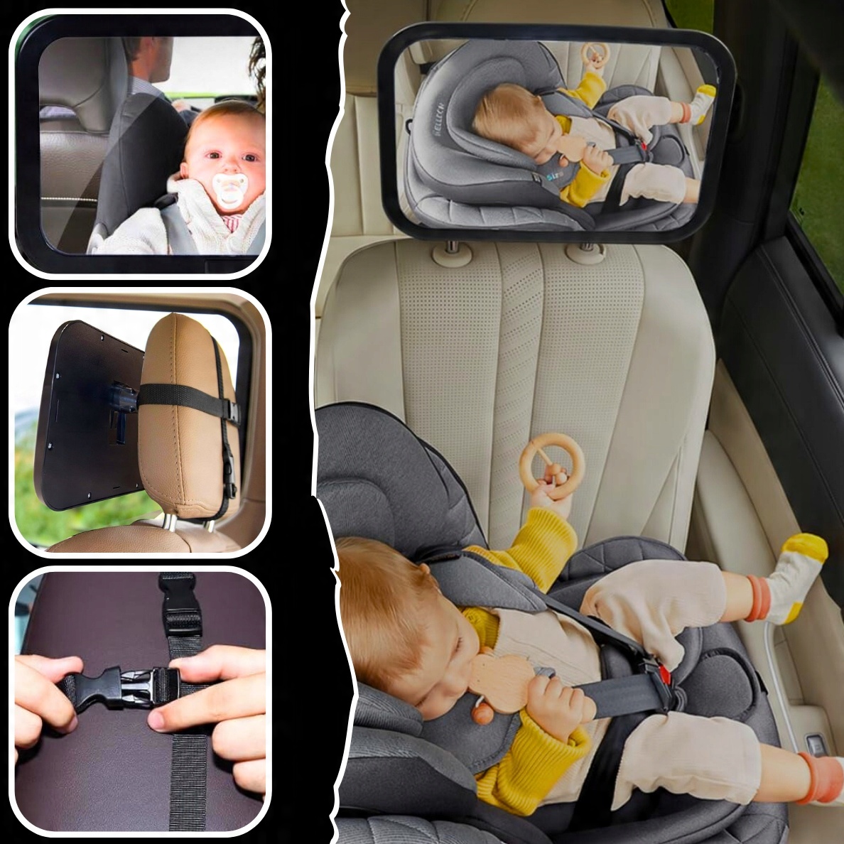 Наша модель має 4 ремінці, кріплені вертикально та рівнями , що стабільно стабільно і не буде послабити; Неможливо, що дзеркало ковзатиме і впаде на дитину! Монтажна головка дозволяє обертання дзеркала 360 градусів даючи можливість точного узгодження кута, щоб якомога більше бачити дитину в дзеркалі заднього виду.