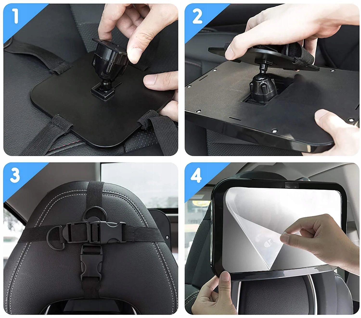 Представлене дзеркало кріпиться на підголівнику автокрісла, навпроти дитячого сидіння. Він повністю регулюється, щоб забезпечити відповідний кут огляду та дозволити водієві спостерігати за дитиною з різних позицій.