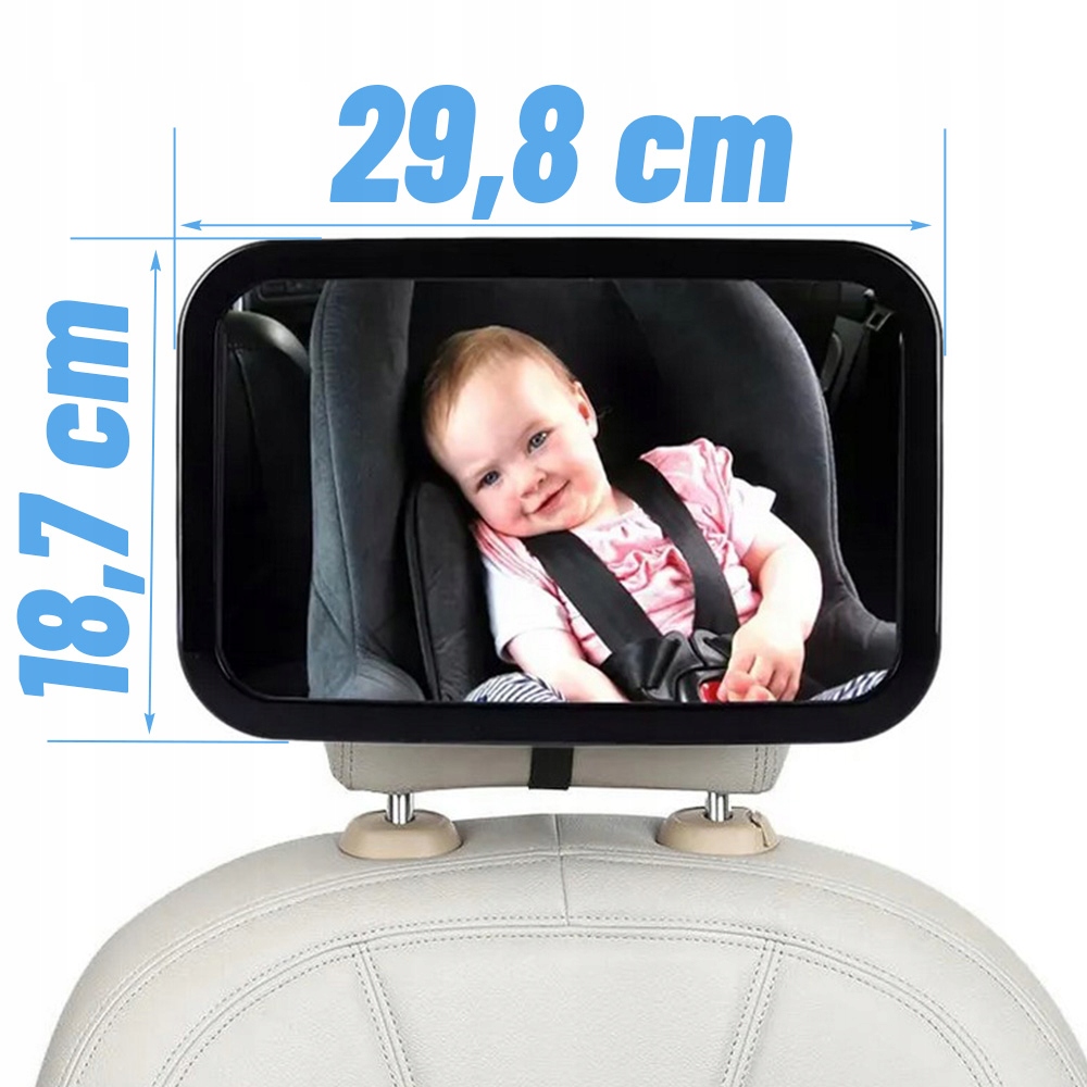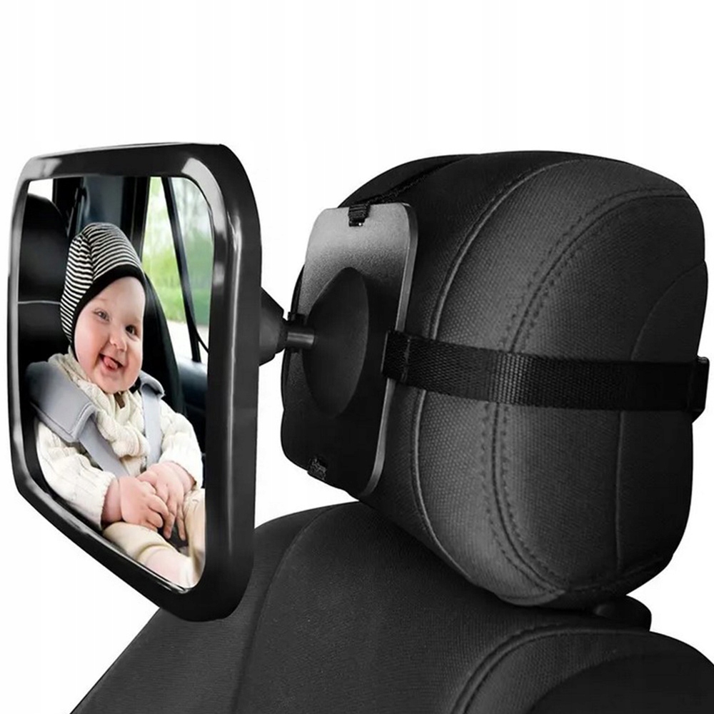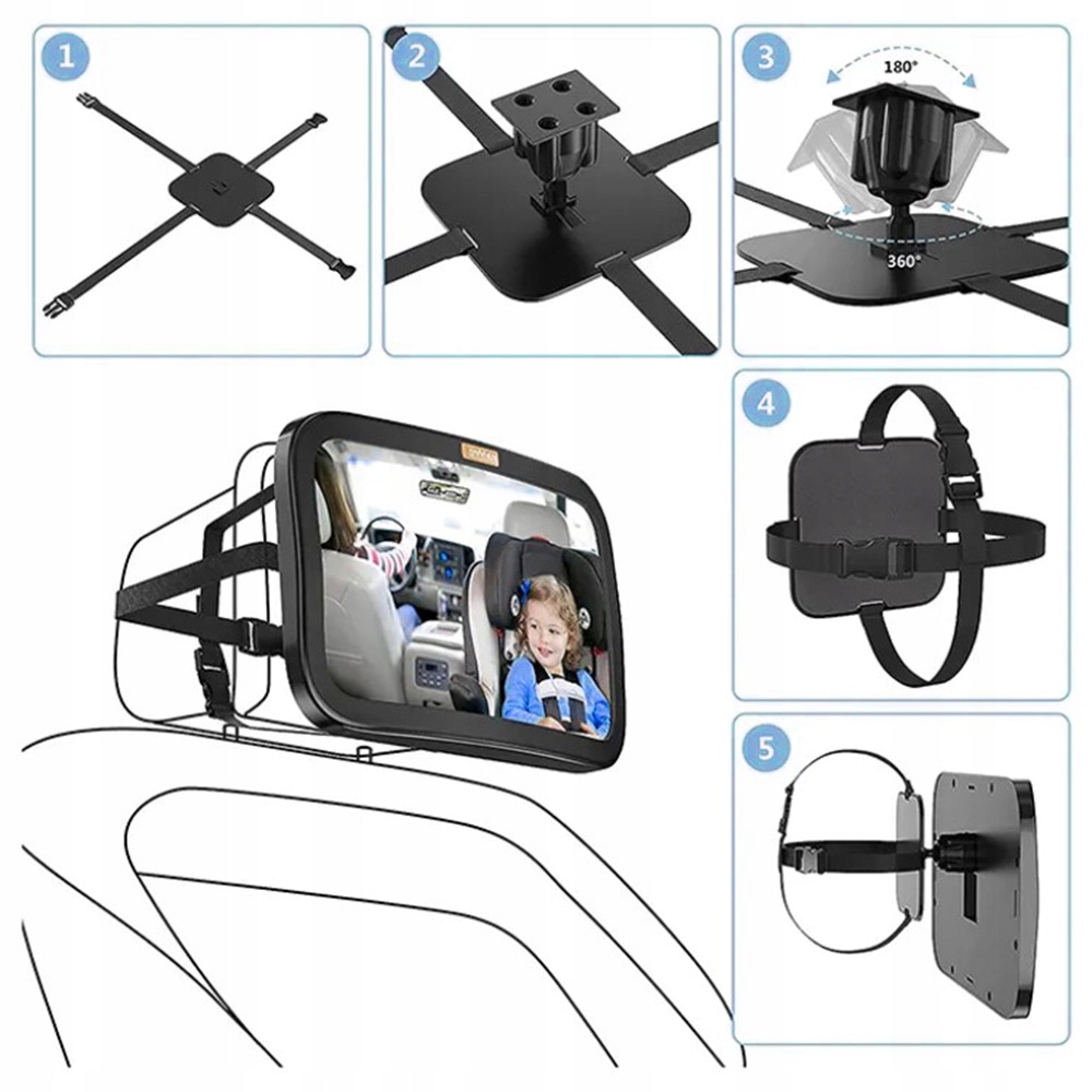 - Просте встановлення: дзеркало встановлюється за кілька секунд на підголівник сидіння автомобіля за допомогою міцні ремені кріплення.