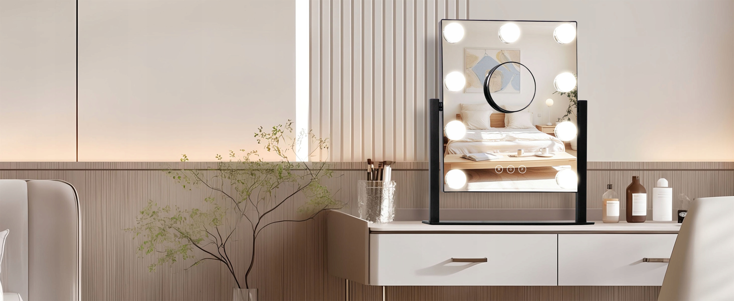 💎【Ідеальний розмір для туалетного столика】Дзеркало для макіяжу з 9 світлодіодами має розміри 36,5 x 29 см, що є розумним розміром для туалетного столика в спальні середнього розміру. Воно не надто маленьке, щоб ви не могли перевірити, чи ваш макіяж підходить до вашого вбрання, і не надто велике, щоб не займати забагато місця на туалетному столику.
