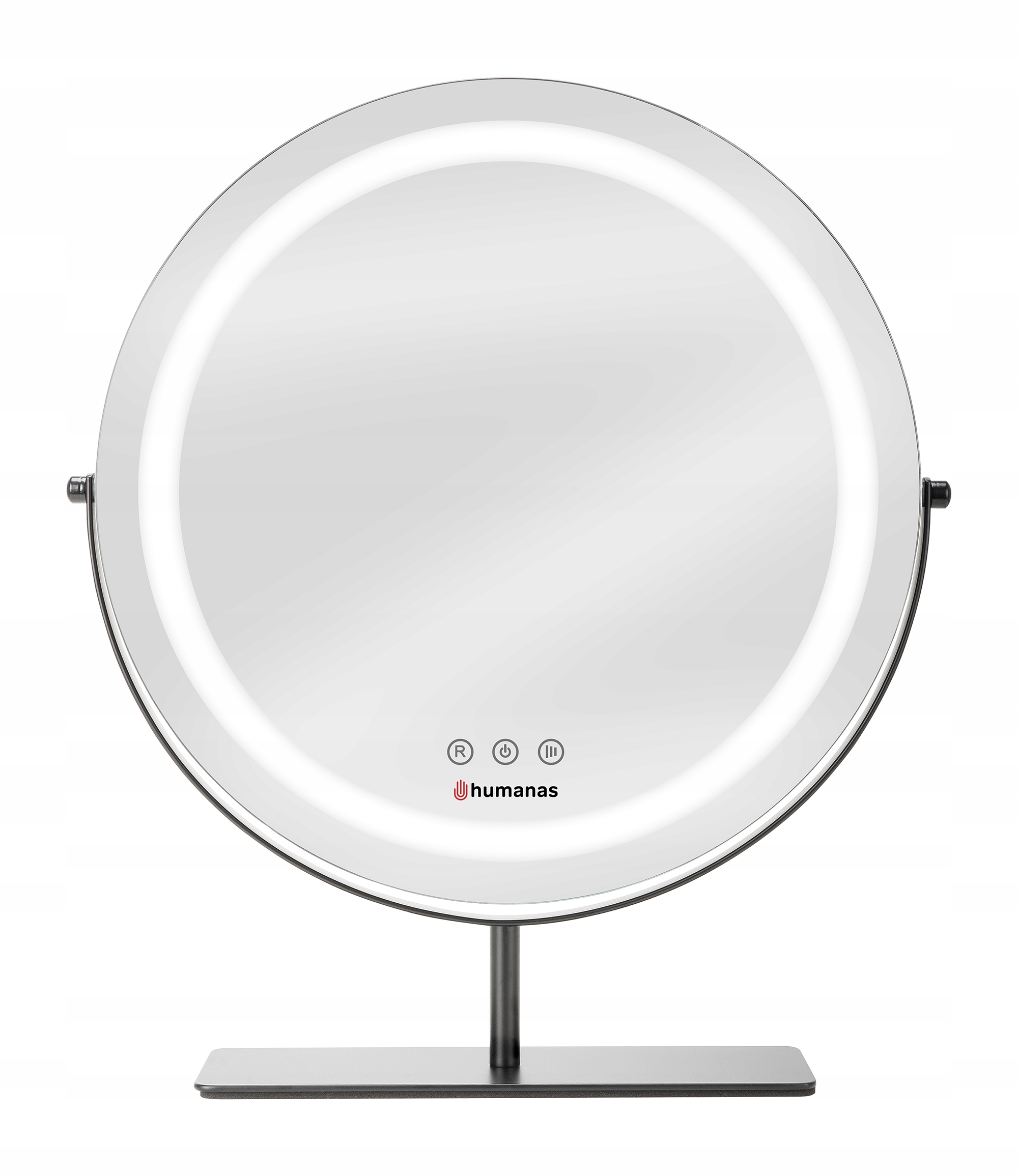 Дзеркало для макіяжу Humanas HS-HM Scarlet допоможе нанести ідеальний макіяж практично в будь-яких умовах. Світлодіодна панель, що оточує скло, забезпечить рівномірне освітлення обличчя, сприяючи точному нанесенню косметики. Криві лінії, нерівномірно розподілена пудра або неідеальний контур очей і губ більше не будуть проблемою. Можливість регулювати положення дзеркала в діапазоні 360º - ще одна перевага, яка полегшить нанесення макіяжу. Залежно від ваших потреб, ви можете встановити бажаний рівень підсвічування і вибрати один з 3 варіантів колірної температури світла. Чорне металеве покриття ідеально підходить як для дому, так і для студій візажу.