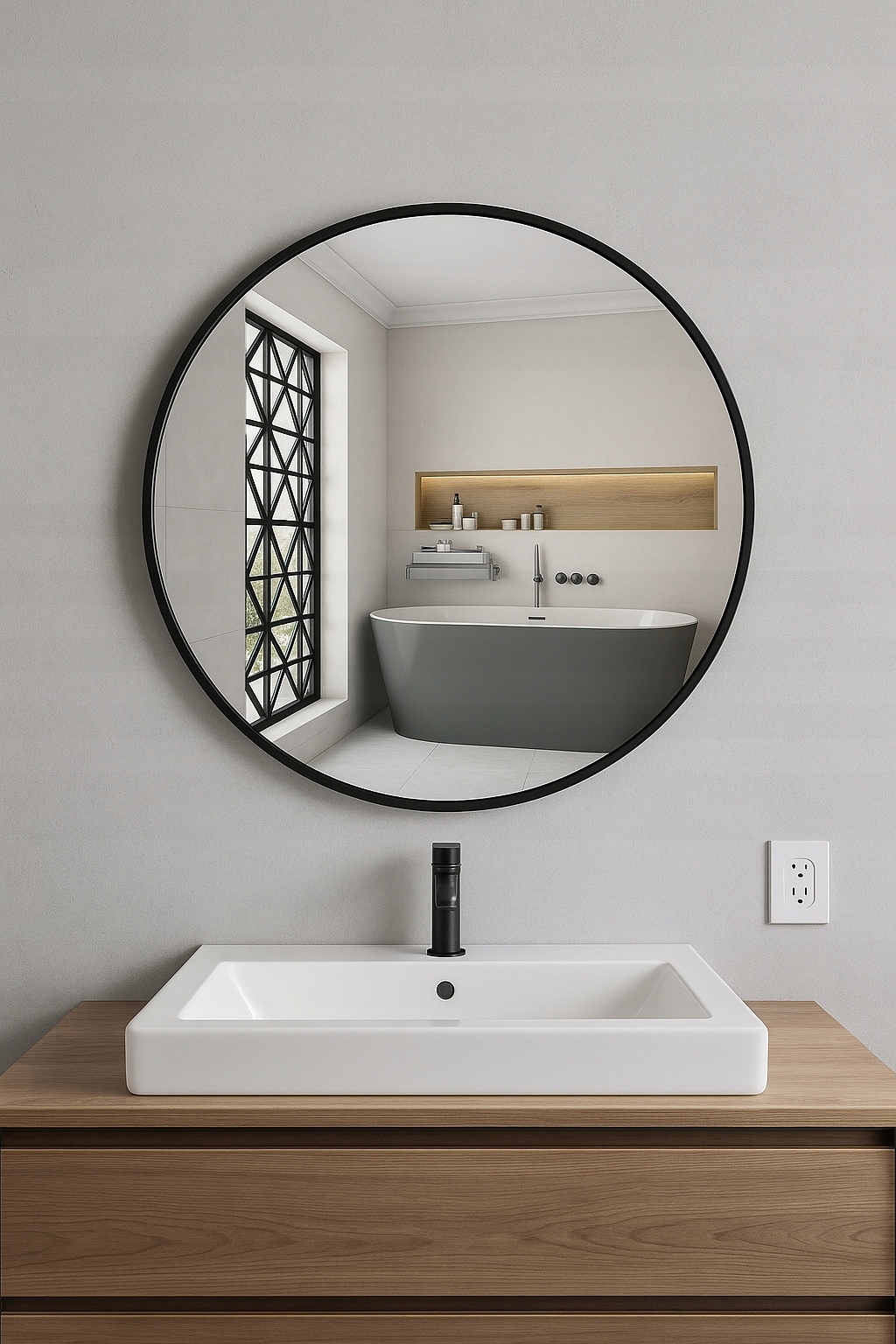 Дзеркало діаметром 60 см - унікальний декоративний елемент, який поєднує в собі функціональність і елегантність. Завдяки круглій формі і чорному каркасу він ідеально вписується в сучасні інтер'єри, як в скандинавському стилі, так і в стилі лофт. Універсальний дизайн робить його ідеальним для будь-якої кімнати - від ванної кімнати, вітальні до холу. Виготовлене з матеріалів найвищої якості, дзеркало характеризується міцною конструкцією, що забезпечує високу довговічність.