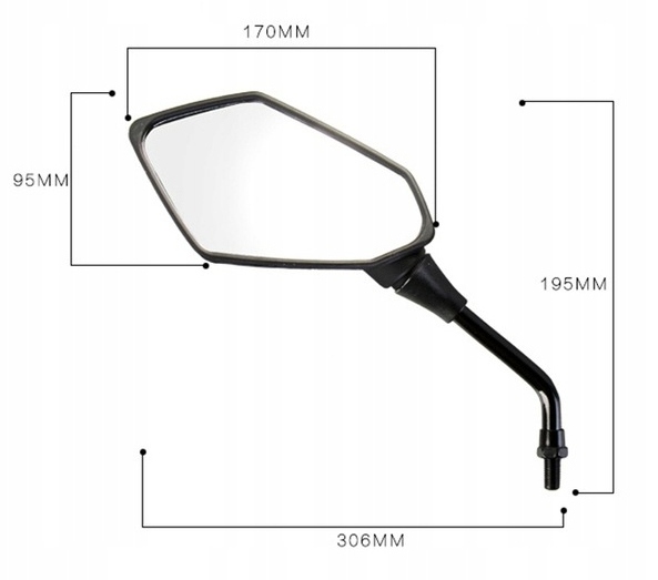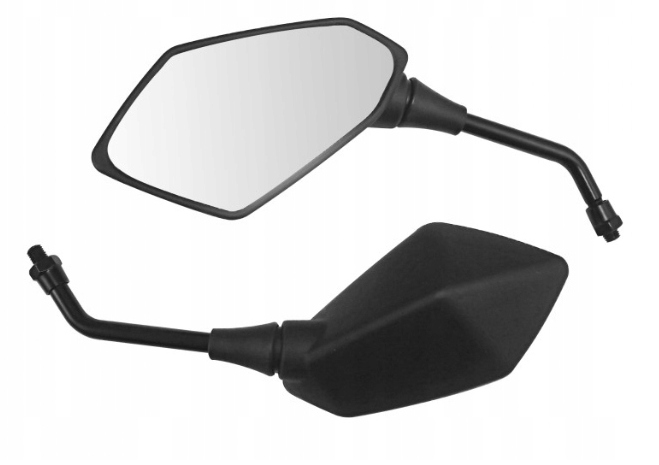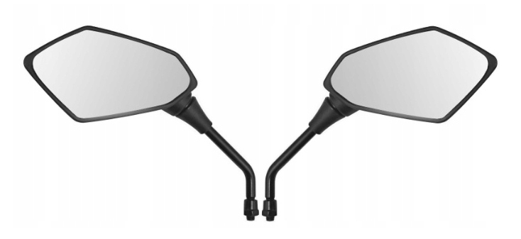 Чорні панорамні дзеркала з сучасним дизайном. Кріпляться на міцному металевому тримачі з діаметром різьби 10 мм. Вони мають здатність артикулювати кут огляду, завдяки чому можна індивідуально налаштувати параметри під свої потреби.