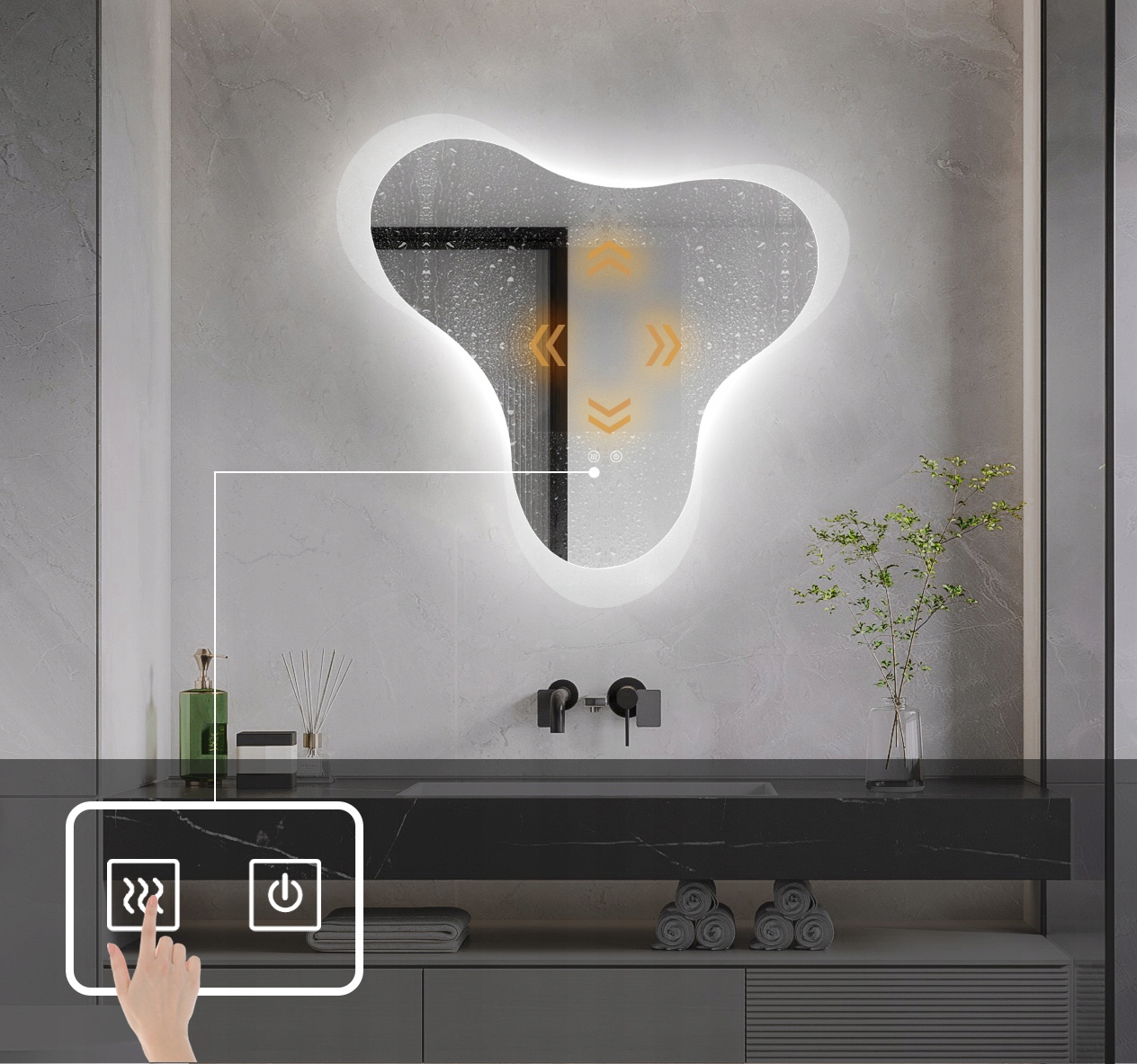 ✅ Інтегроване двоповерхове потемніння -Дзеркало має вбудовану функцію регуляції інтенсивності освітлення, яка працює на дотик. Дво -шлях -сервіс дозволяє контролювати світло, торкаючись панелі двічі. Потемніння без дратівки дозволяє плавно, не стрибаючи, адаптуйте яскравість світла до ваших уподобань - від повної потужності до делікатного, затемненого освітлення