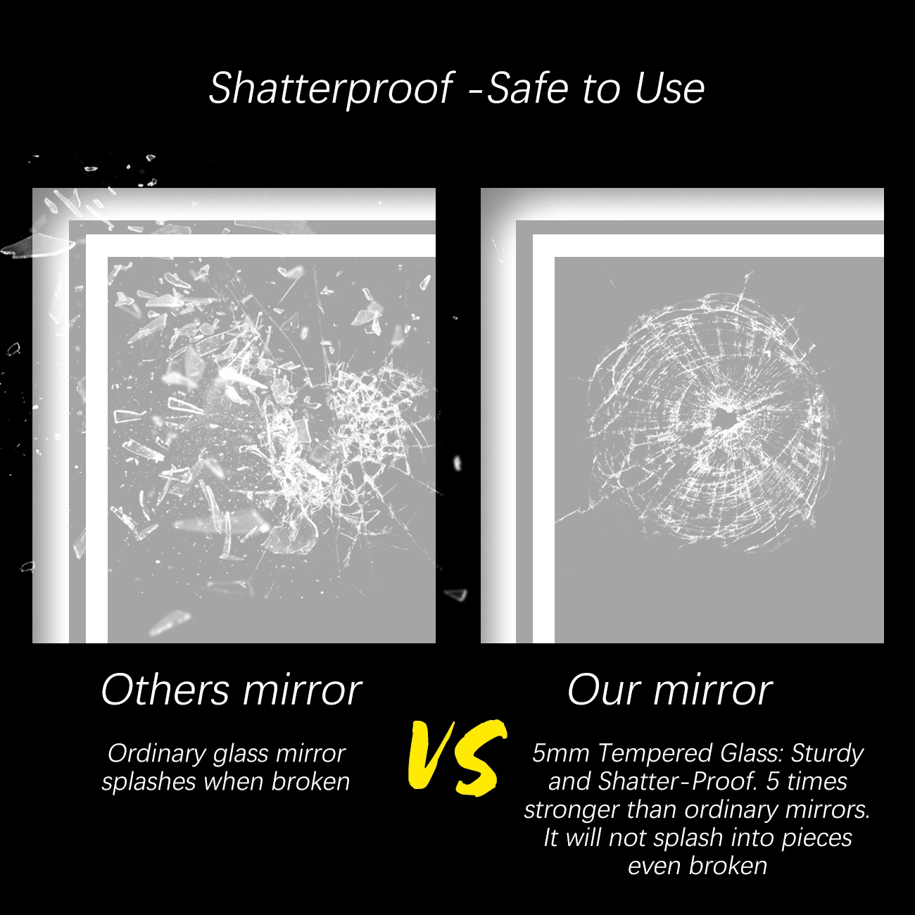 5 разів стійкіший до пошкодження, ніж звичайні дзеркала. У разі синців він не розпадається на гострі осколки.