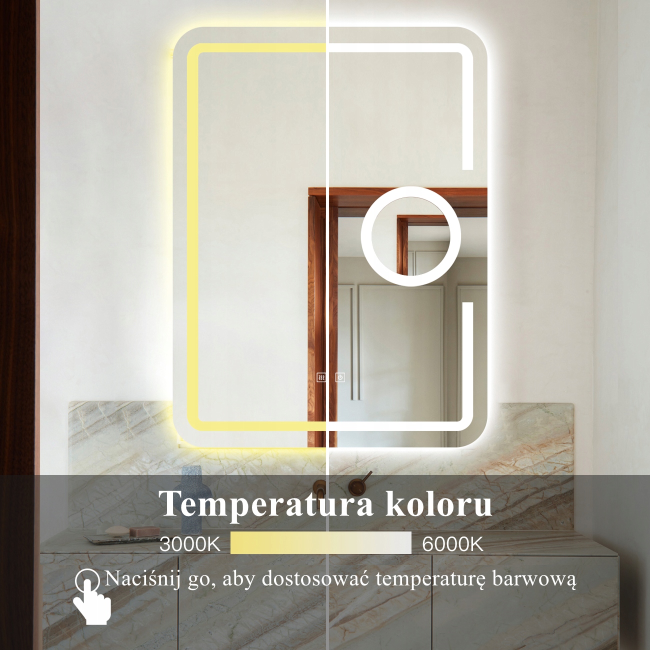 ✅ Наше дзеркало з сенсорною функцією вибору кольору є ідеальним рішенням для людей, які цінують комфорт і гнучкість. Завдяки простій сенсорній панелі ви можете будь-коли налаштувати освітлення відповідно до своїх потреб - вибирати між холодним білим (6000K),теплим світлом (3000K) .Незалежно від того, готуєтеся ви до важливої події чи відпочиваєте ввечері, ви завжди знайдете ідеальне освітлення. Змінюйте колір світла, коли забажаєте, і налаштуйте атмосферу відповідно до свого настрою!